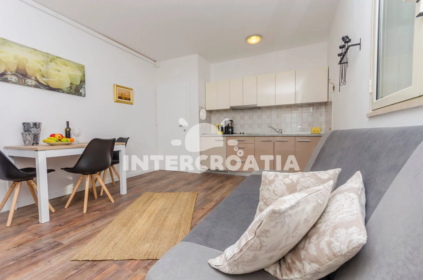 Apartmán (40 m2) s balkonem, venkovním posezením a výhledem na moře se nachází v 1. patře vily. Apartmán má 1 ložnici a je vhodný pro 2 až 4 osoby. Obývací pokoj je spojený s kuchyní. Kuchyňská linka…