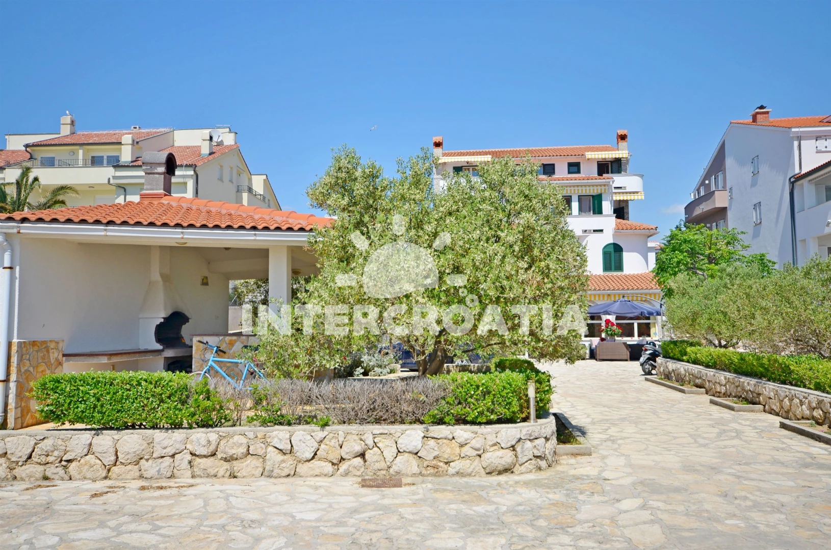 Vzdálenosti: Moře a oblázková pláž 20 m, supermarket 10 m, restaurace, bar 500 m, centrum, banka, pošta 1 km, trajekt, letiště 80 km.