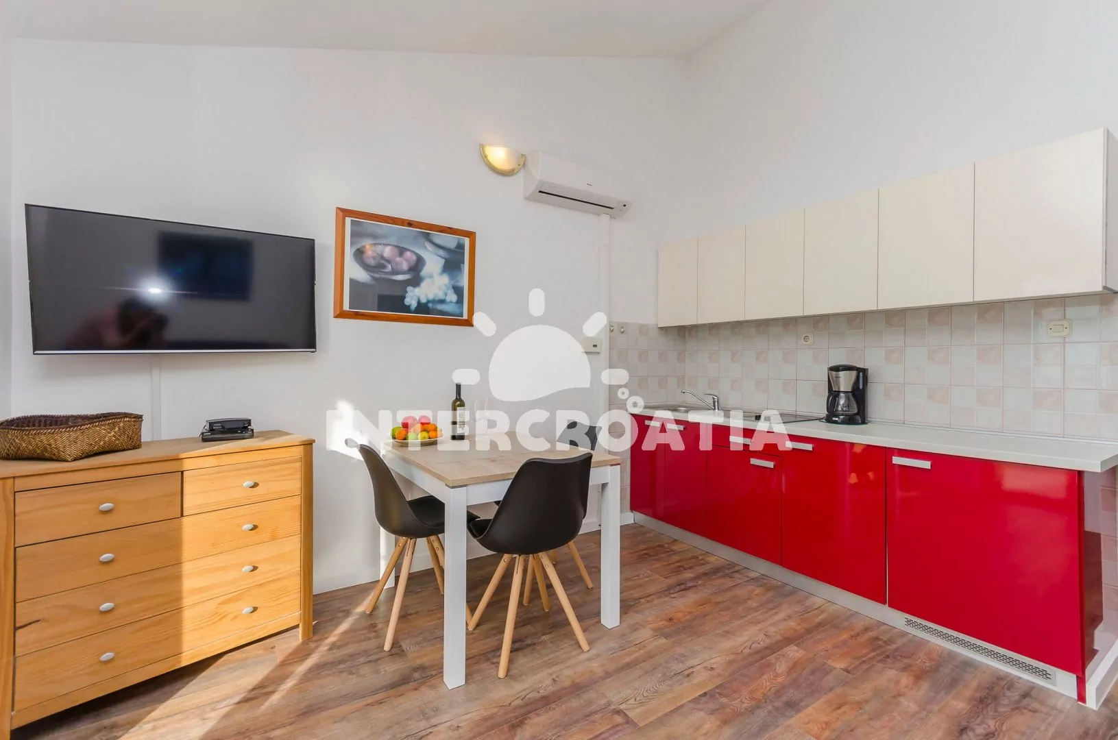Apartmán (40 m2) s terasou, venkovním posezením a výhledem na moře se nachází v 1. patře vily. Apartmán má 2 ložnice a je vhodný pro 4 až 5 osob. Obývací pokoj je spojený s kuchyní. Kuchyňská linka…