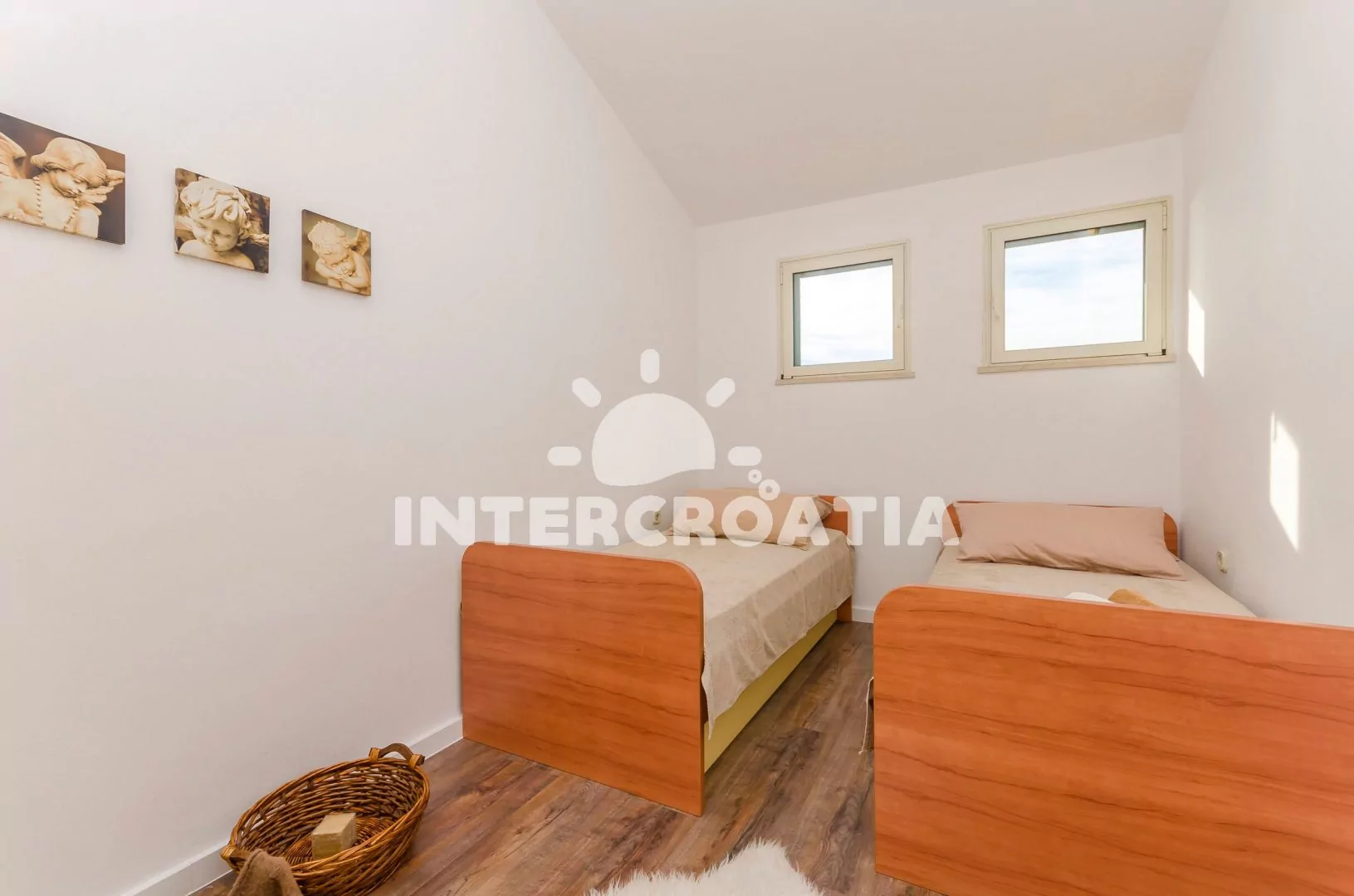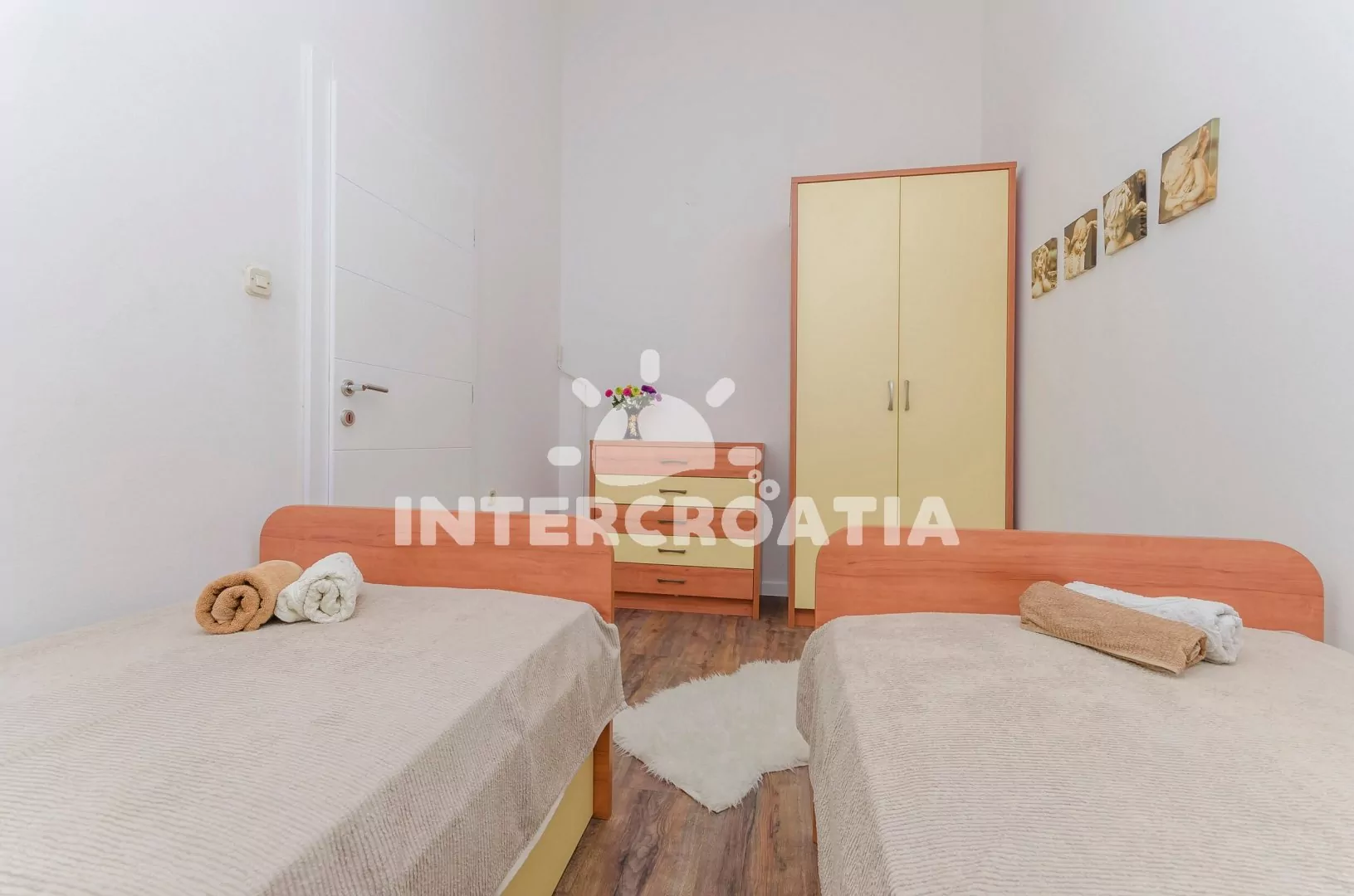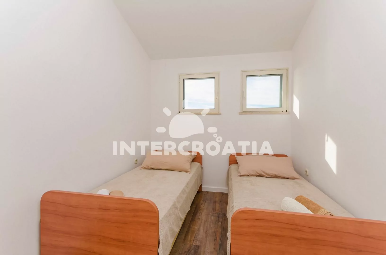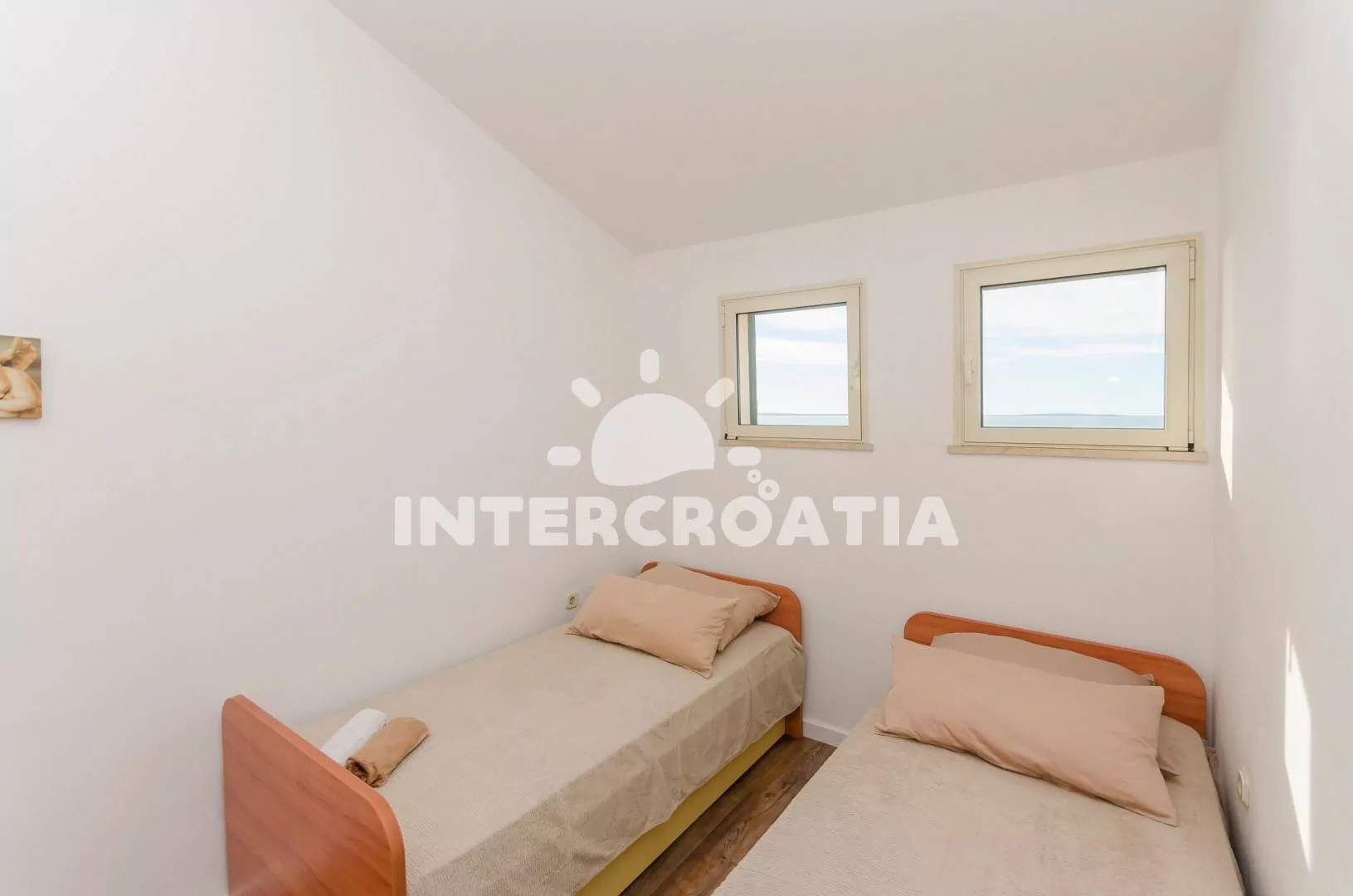 Apartmán (40 m2) s terasou, venkovním posezením a výhledem na moře se nachází v 1. patře vily. Apartmán má 2 ložnice a je vhodný pro 4 až 5 osob. Obývací pokoj je spojený s kuchyní. Kuchyňská linka je vybavena dvouplotýnkovým vařičem, rychlovarnou konvicí, kávovarem, nádobím a lednicí s mrazákem. Obývací pokoj s jídelním stolem, pohovkou (rozložitelná na extra lůžko pro 1 osobu), televizí se satelitním programem, klimatizací a vstupem na terasu. První ložnice s dvoulůžkem. Druhá ložnice s dvěma jednolůžky. Koupelna se sprchovým koutem, umyvadlem a wc. Hostům je k dispozici parkování u objektu zdarma.