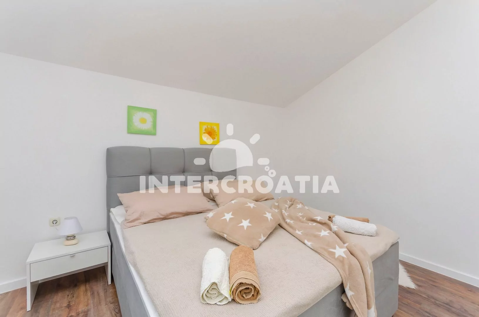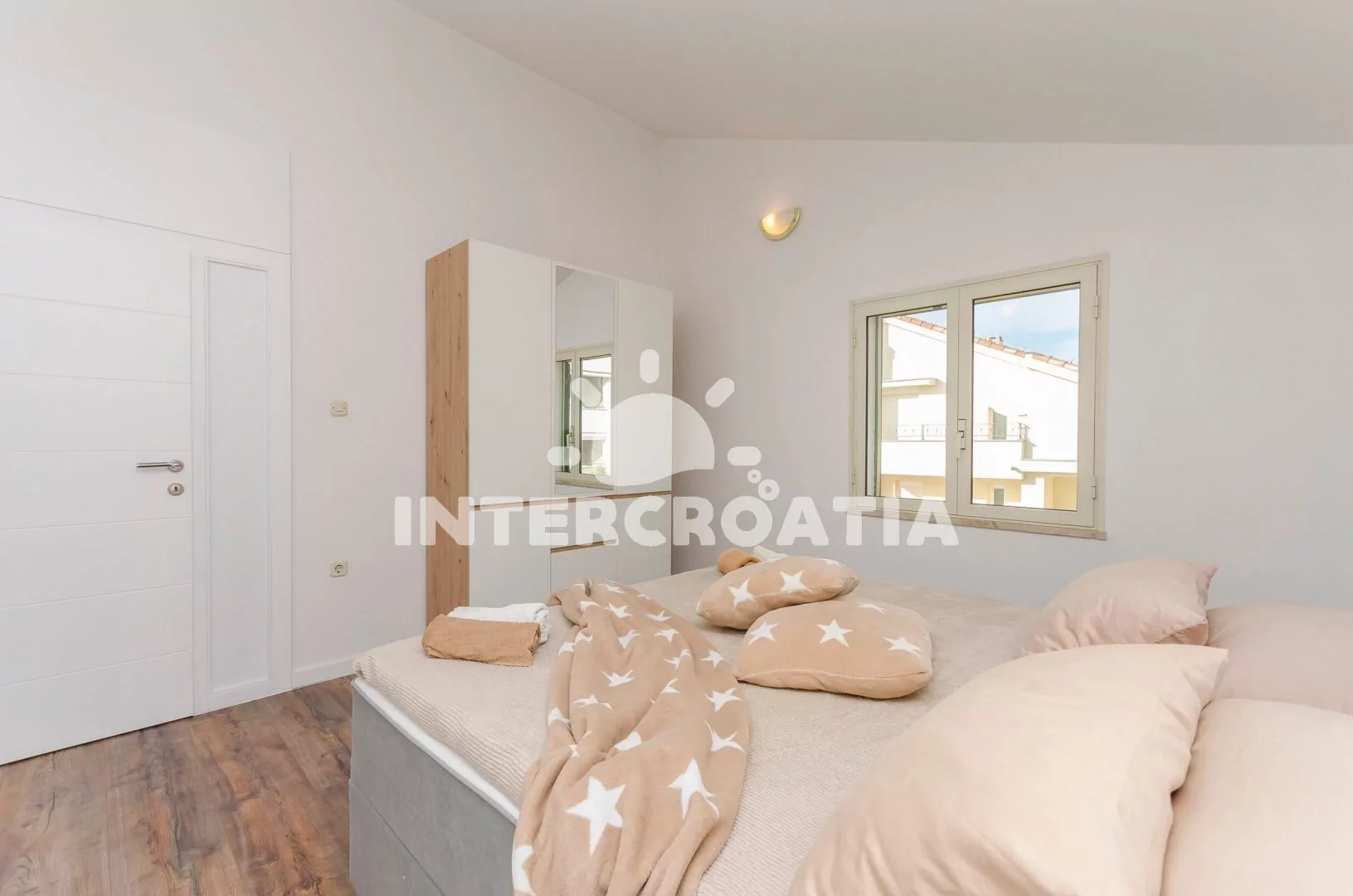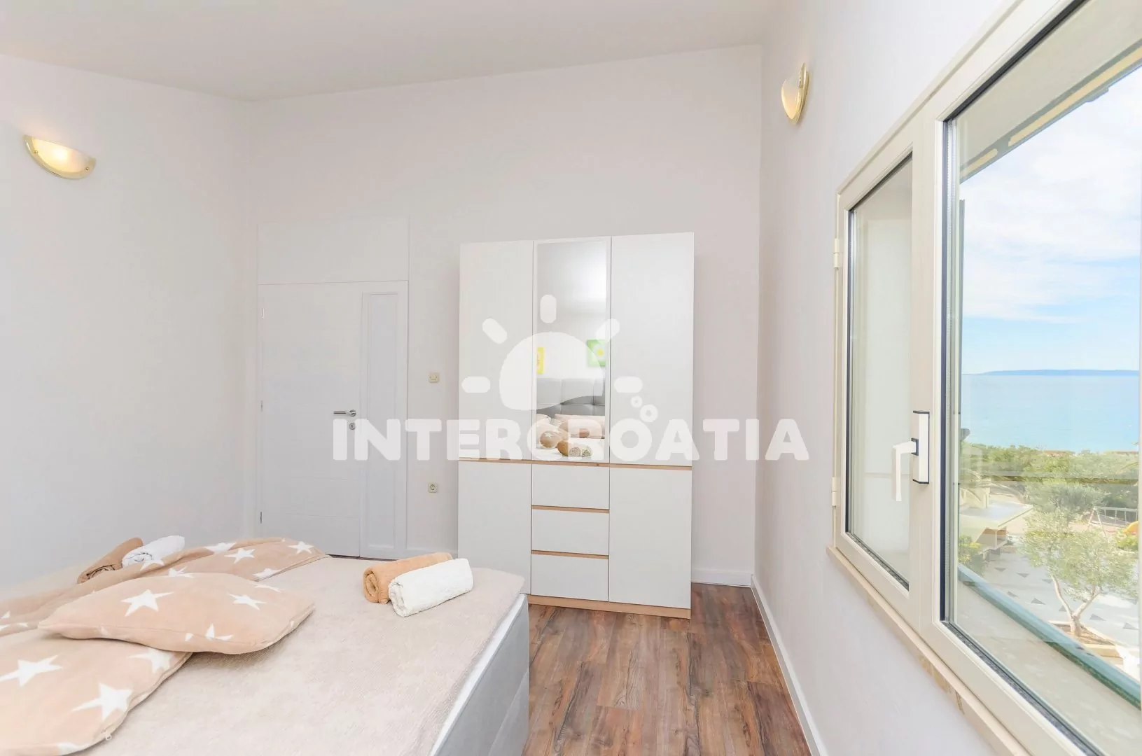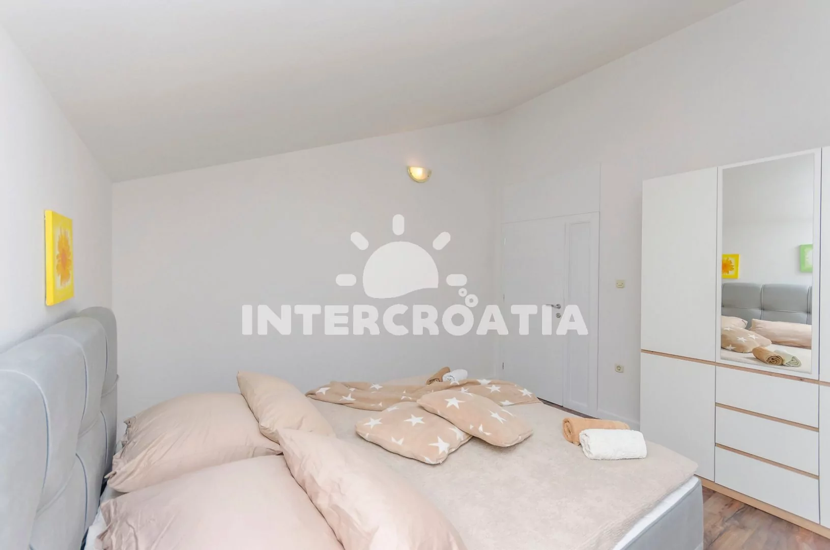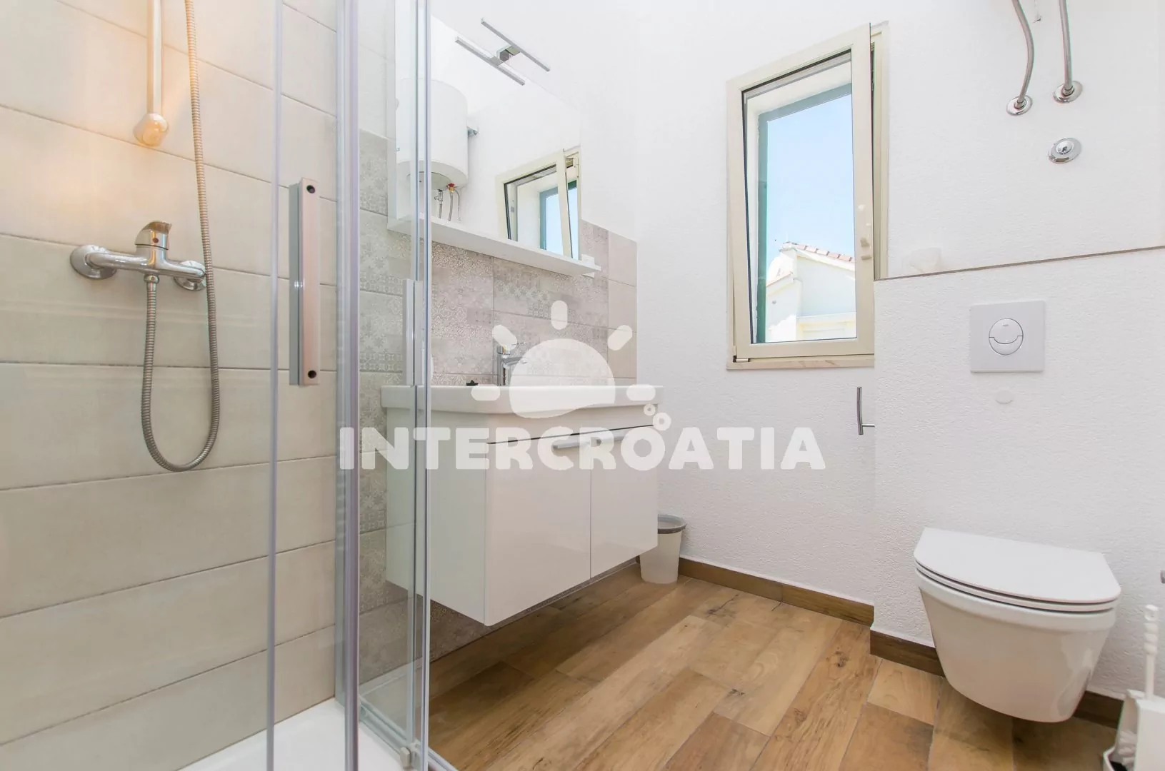 Apartmán (40 m2) s terasou, venkovním posezením a výhledem na moře se nachází v 1. patře vily. Apartmán má 2 ložnice a je vhodný pro 4 až 5 osob. Obývací pokoj je spojený s kuchyní. Kuchyňská linka je vybavena dvouplotýnkovým vařičem, rychlovarnou konvicí, kávovarem, nádobím a lednicí s mrazákem. Obývací pokoj s jídelním stolem, pohovkou (rozložitelná na extra lůžko pro 1 osobu), televizí se satelitním programem, klimatizací a vstupem na terasu. První ložnice s dvoulůžkem. Druhá ložnice s dvěma jednolůžky. Koupelna se sprchovým koutem, umyvadlem a wc. Hostům je k dispozici parkování u objektu zdarma.