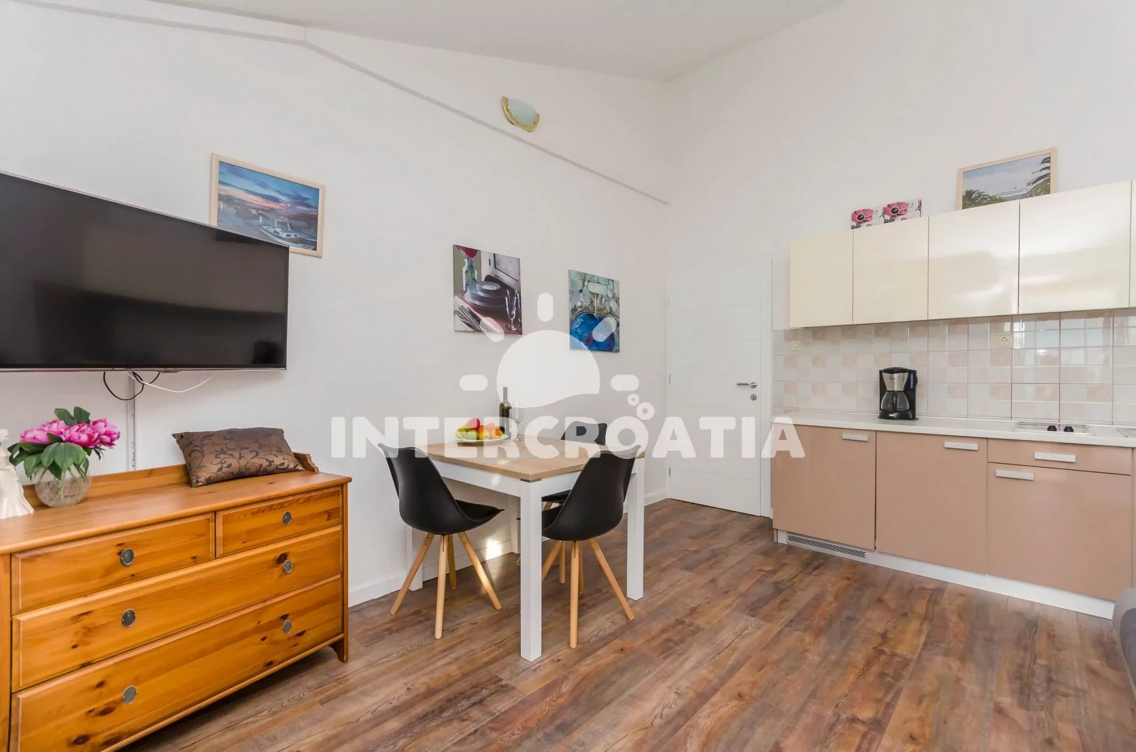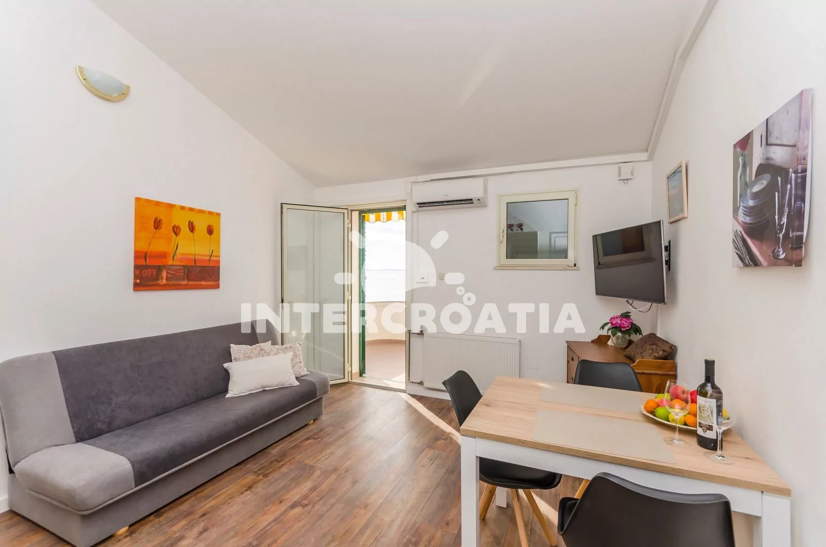 Apartmán (40 m2) s terasou, venkovním posezením a výhledem na moře se nachází v 1. patře vily. Apartmán má 1 ložnici a je vhodný pro 2 až 4 osoby. Obývací pokoj je spojený s kuchyní. Kuchyňská linka je vybavena dvouplotýnkovým vařičem, rychlovarnou konvicí, kávovarem, nádobím a lednicí s mrazákem. Obývací pokoj s jídelním stolem, pohovkou (rozložitelná na extra lůžko pro 2 osoby), televizí se satelitním programem, klimatizací a vstupem na terasu. Ložnice s jedním dvoulůžkem. Koupelna se sprchovým koutem, umyvadlem a wc. Hostům je k dispozici parkování u objektu zdarma.