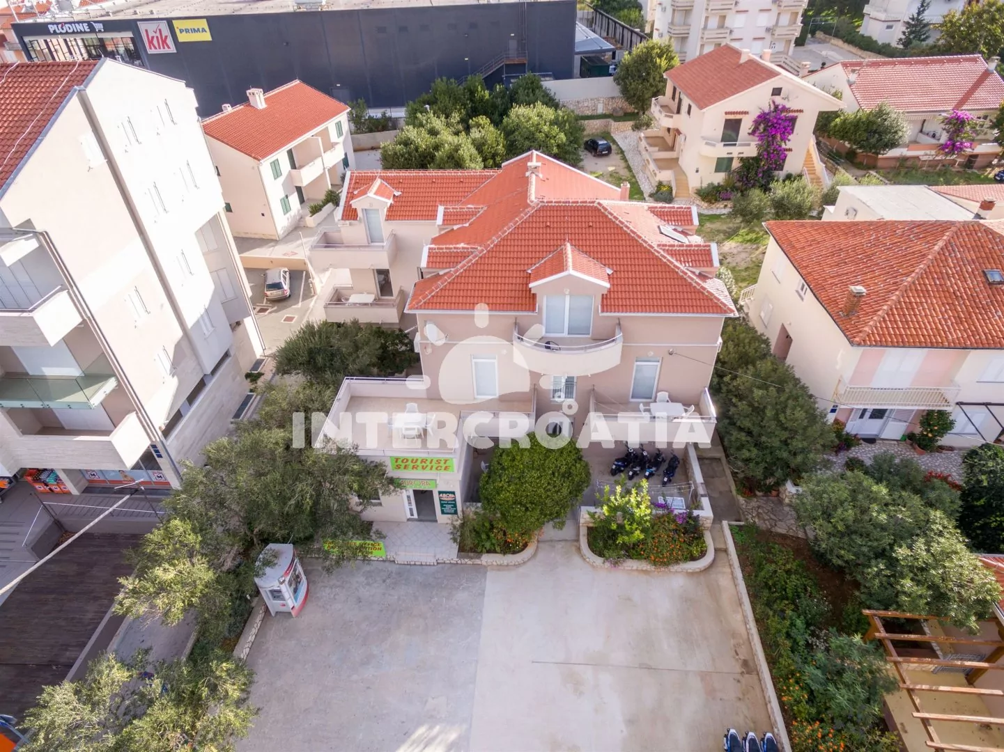 Vzdálenosti: Moře a oblázková pláž 130 m, restaurace 30 m, supermarket 10 m, veřejná doprava 900 m, lékárna 50 m, směnárna 30 m, centrum 70 m, bar 50 m, diskotéka 70 m, ambulance 500 m, pošta, muzeum a banka 100 m, čerpací stanice 1 km, potápění, půjčovna cyklistický kol, tenisové kurty a mini golf 1 km, trajekt 8 km, letiště (Zadar) 90 km.