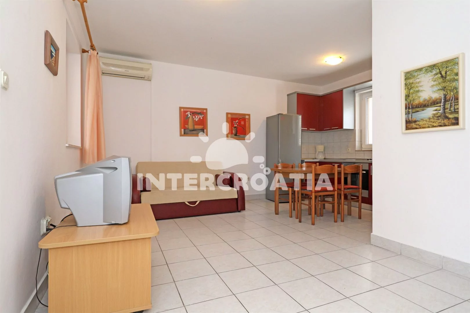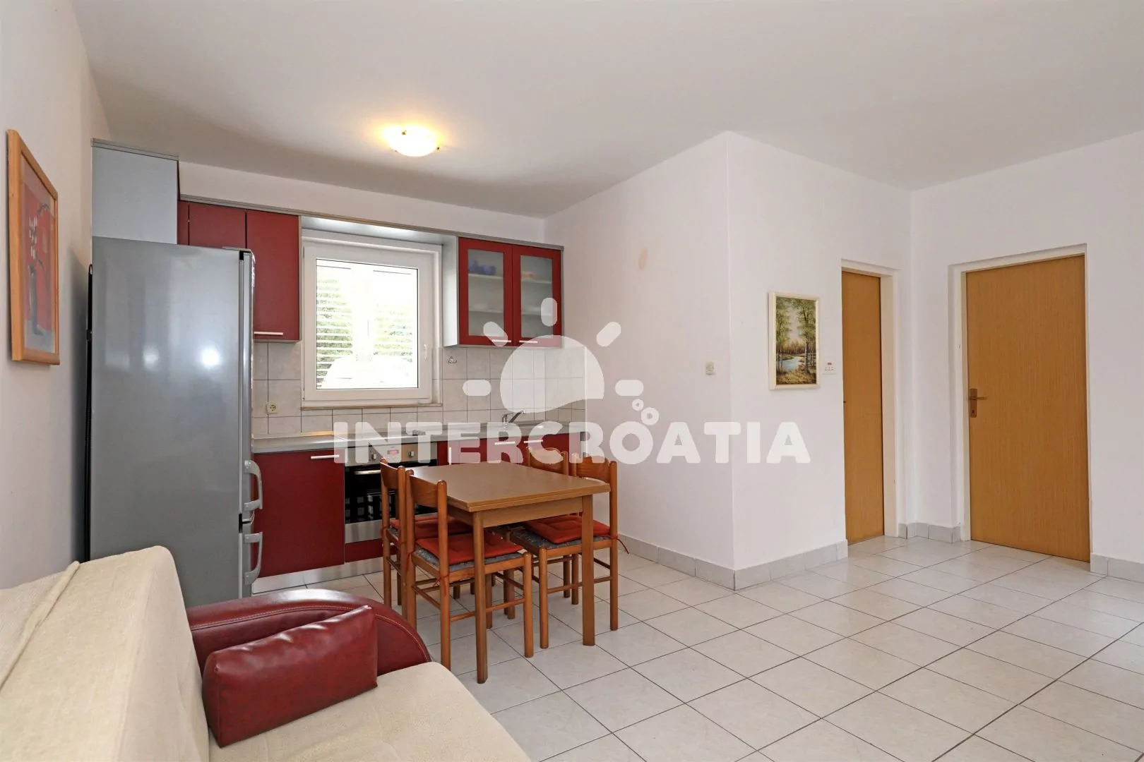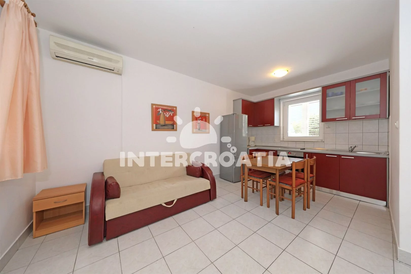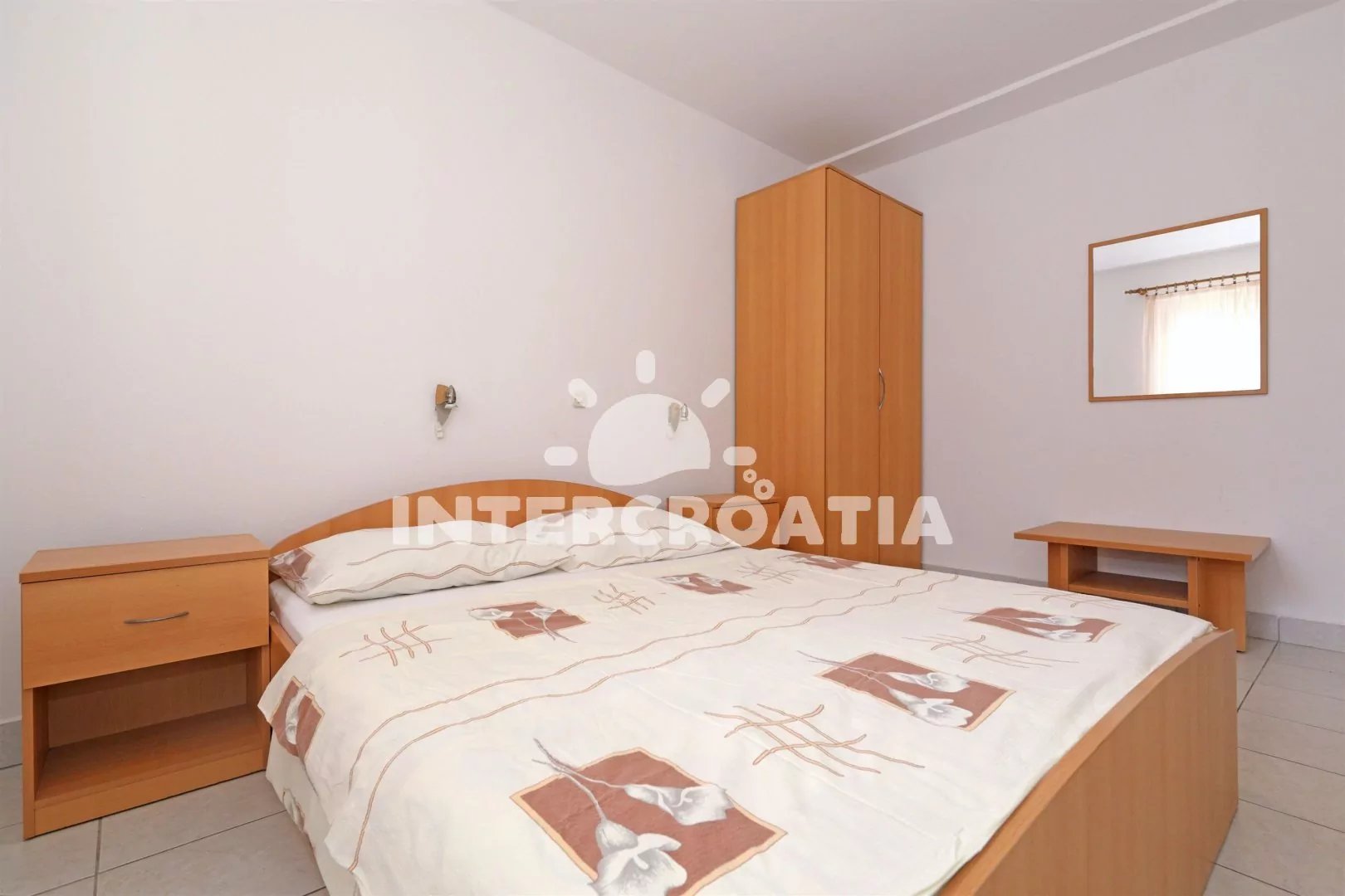 Apartmán (42 m2) s terasou, posezením a výhledem do dvora se nachází v přízemí domu. Apartmán má 1 ložnici a je vhodný pro 2 až 4 osoby. Obývací pokoj je spojený s kuchyní. Kuchyňská linka je vybavena varnou deskou, vestavěnou troubou, kávovarem, nádobím a lednicí s mrazákem. Obývací pokoj s jídelním stolem pro 4 osoby, pohovkou (rozložitelná na extra lůžko pro 2 osoby), televizí se satelitním programem a klimatizací. Ložnice s jedním dvoulůžkem. Koupelna se sprchovým koutem, umyvadlem, fénem a wc. Hostům je k dispozici parkování u objektu zdarma.