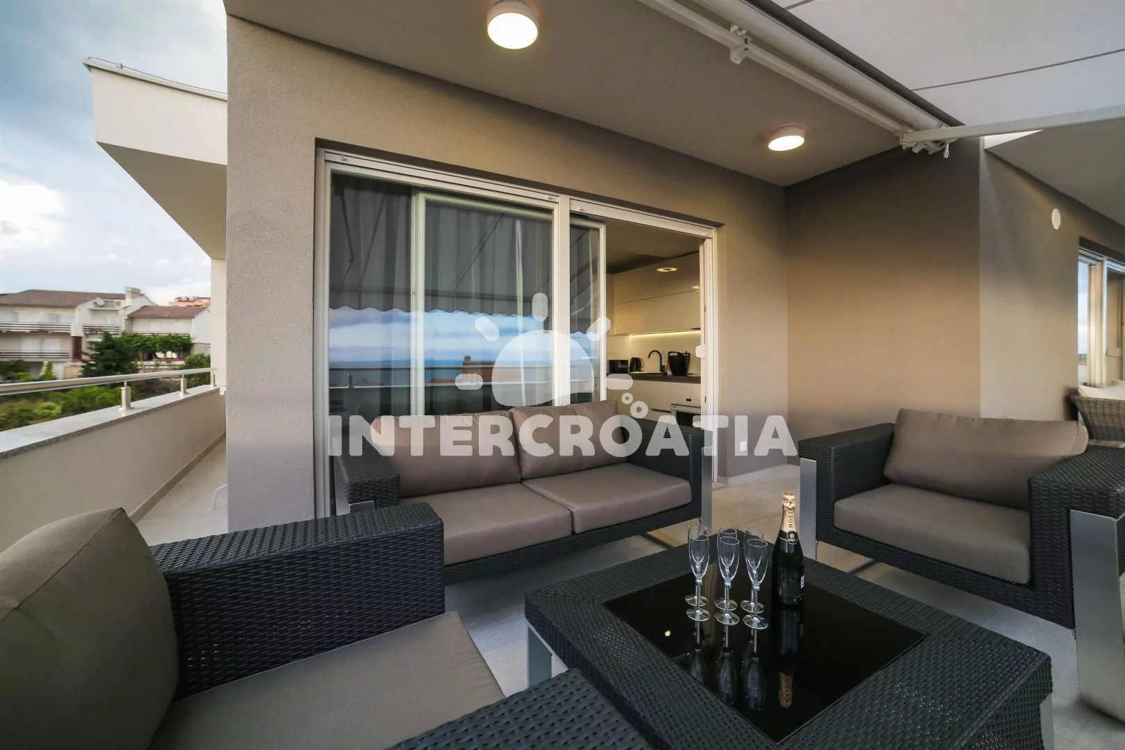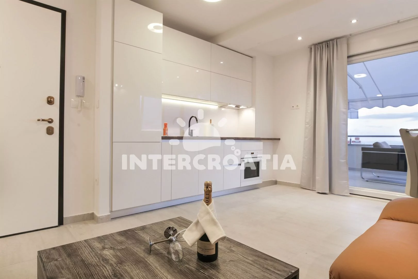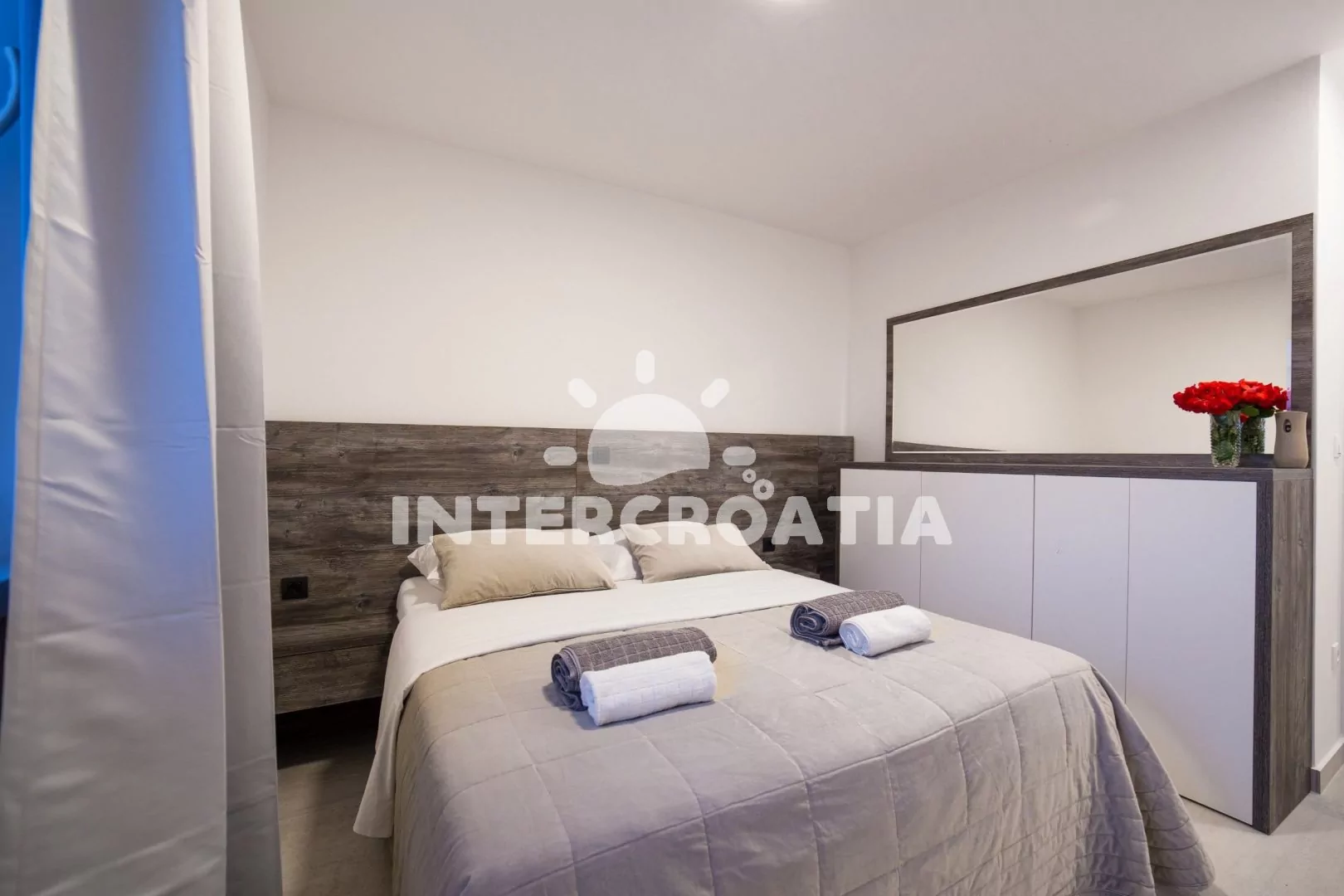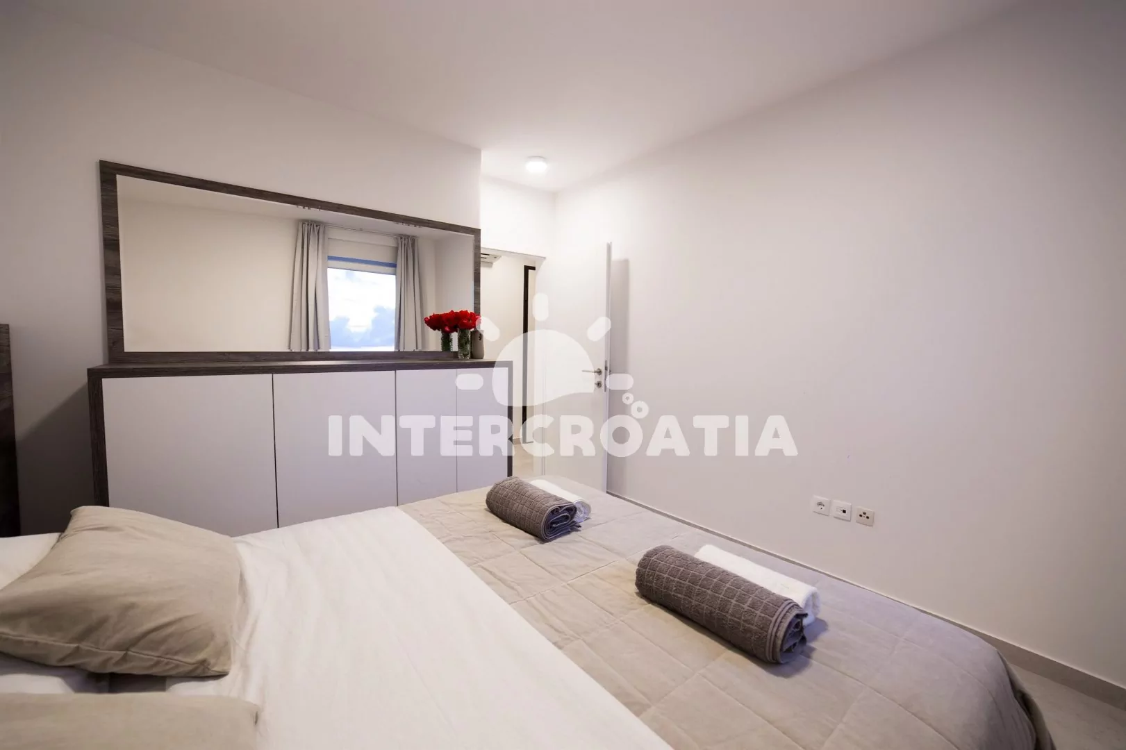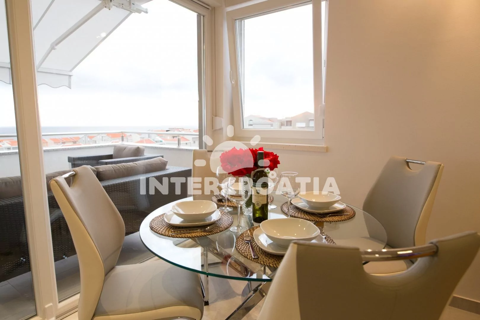 Apartmán (56 m2) s terasou, venkovním posezením a výhledem na moře se nachází ve 2. patře domu. Apartmán má 1 ložnici a je vhodný pro 2 až 4 osoby. Obývací pokoj je spojený s kuchyní. Kuchyňská linka je vybavena varnou deskou, digestoří, vestavěnou troubou, myčkou na nádobí, mikrovlnnou troubou, rychlovarnou konvicí, toustovačem, nádobím a lednicí s mrazákem. Obývací pokoj s jídelním stolem, pohovkou (rozložitelná na extra lůžko pro 2 osoby), televizí se satelitním programem, klimatizací a vstupem na terasu. Ložnice s jedním dvoulůžkem a sejfem. Koupelna se sprchovým koutem, umyvadlem, fénem a wc. Hostům je k dispozici parkování u objektu zdarma.