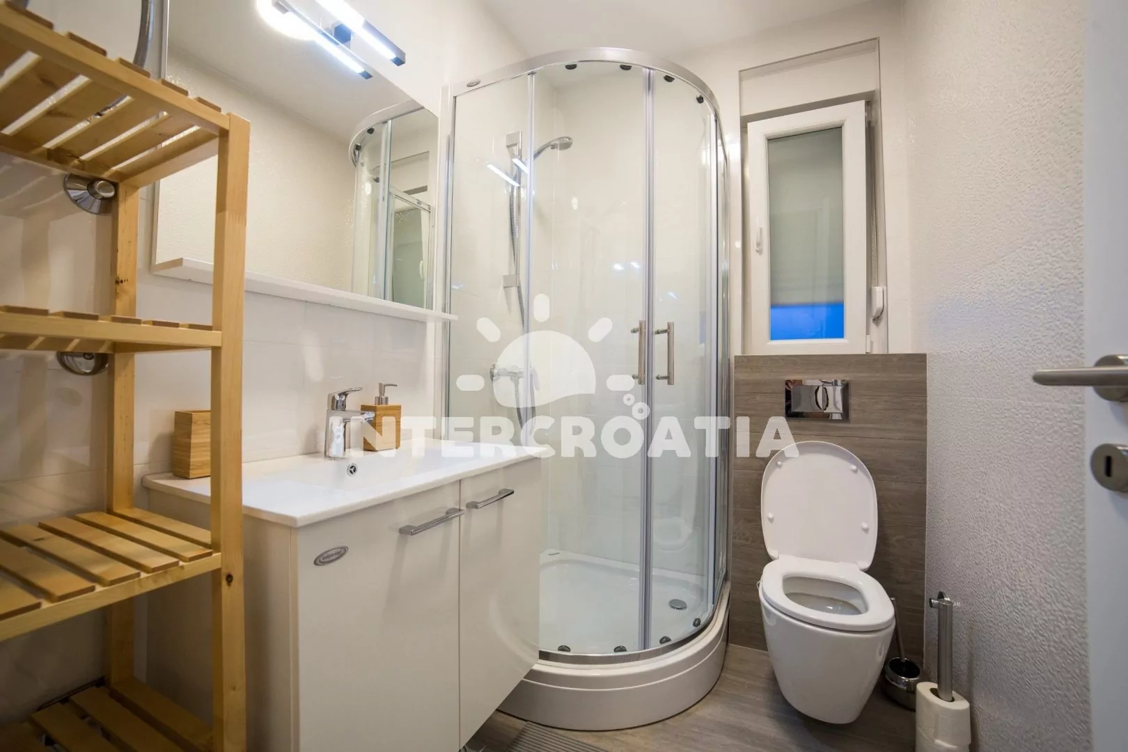 Apartmán (56 m2) s terasou, venkovním posezením a výhledem na moře se nachází ve 2. patře domu. Apartmán má 1 ložnici a je vhodný pro 2 až 4 osoby. Obývací pokoj je spojený s kuchyní. Kuchyňská linka…