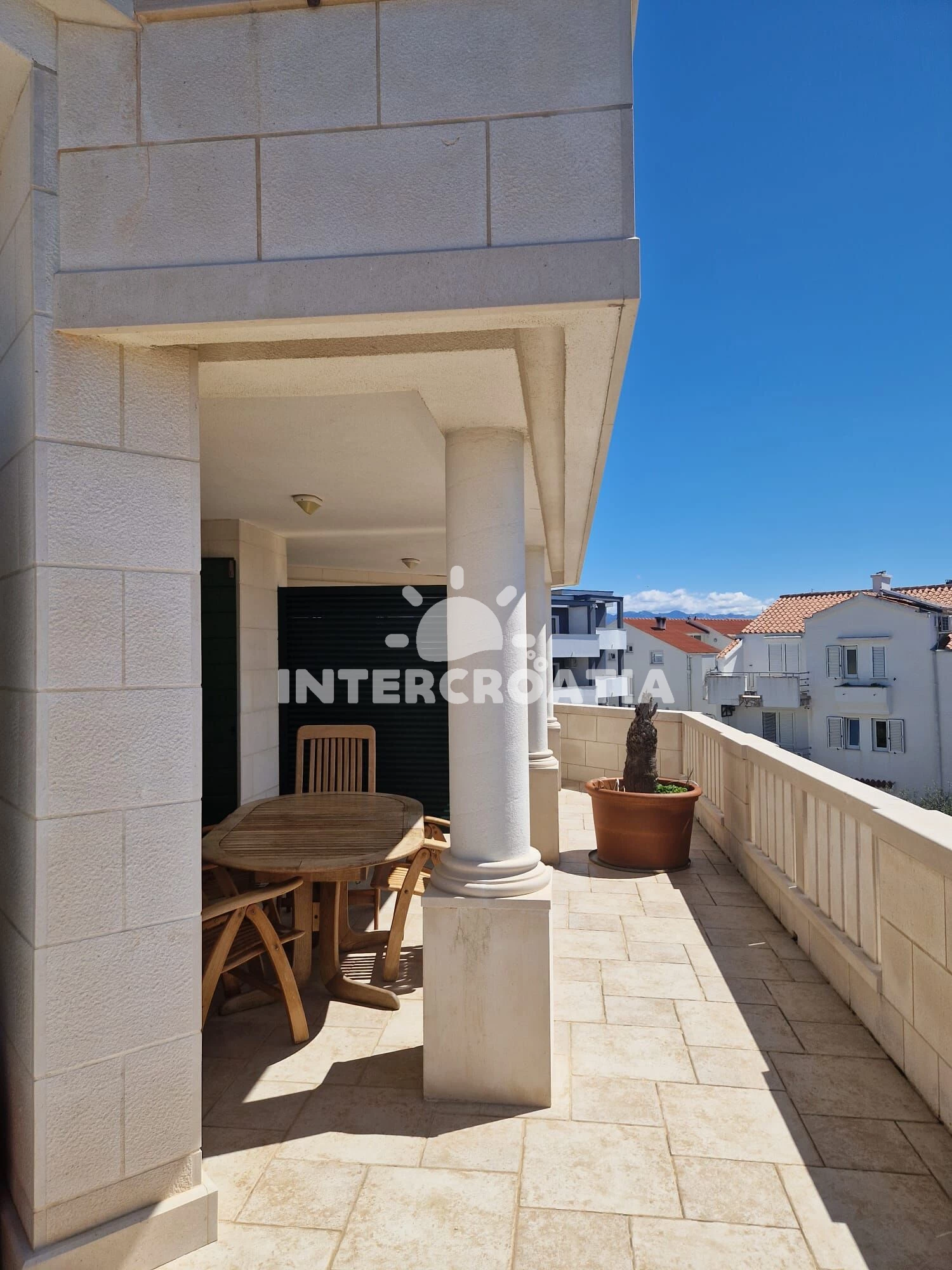 Apartmán (75 m2) s terasou a venkovním posezením se nachází ve 2. patře domu. Apartmán má 2 ložnice, 2 koupelny a je vhodný pro až 6 osob. Obývací pokoj je spojený s kuchyní. Kuchyňská linka je vybavena varnou deskou, vestavěnou troubou, kávovarem, nádobím a lednicí s mrazákem. Obývací pokoj s jídelním stolem, pohovkou (rozložitelná na extra lůžko pro 2 osoby), televizí, klimatizací a vstupem na terasu. První i druhá ložnice je vybavena vždy s jedním dvoulůžkem. Dvě koupelny se sprchovým koutem, umyvadlem, fénem a wc.
