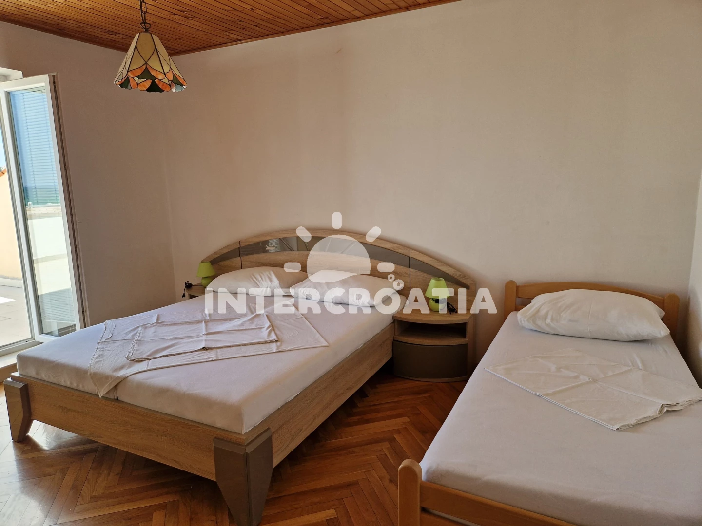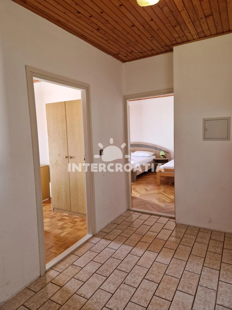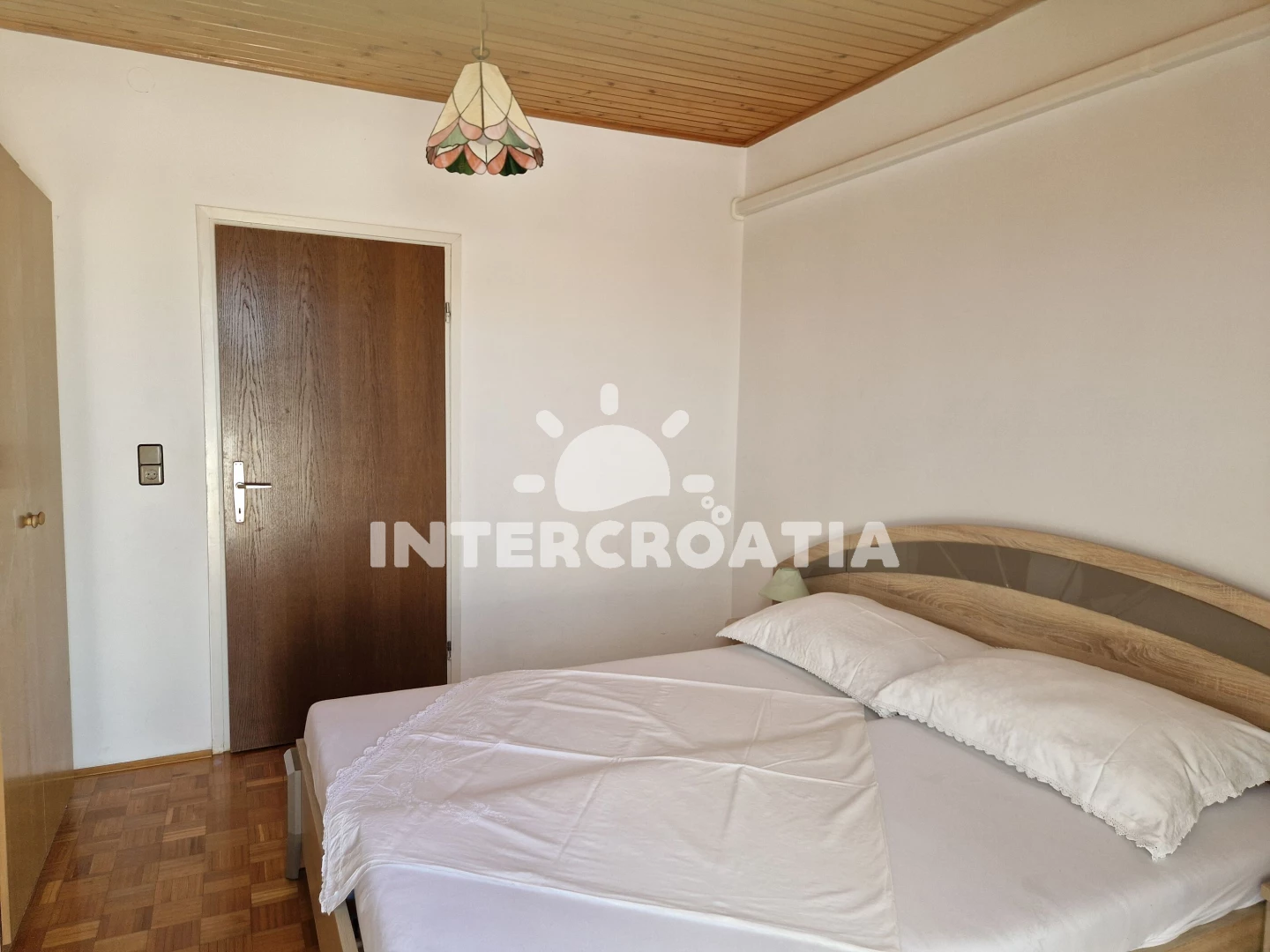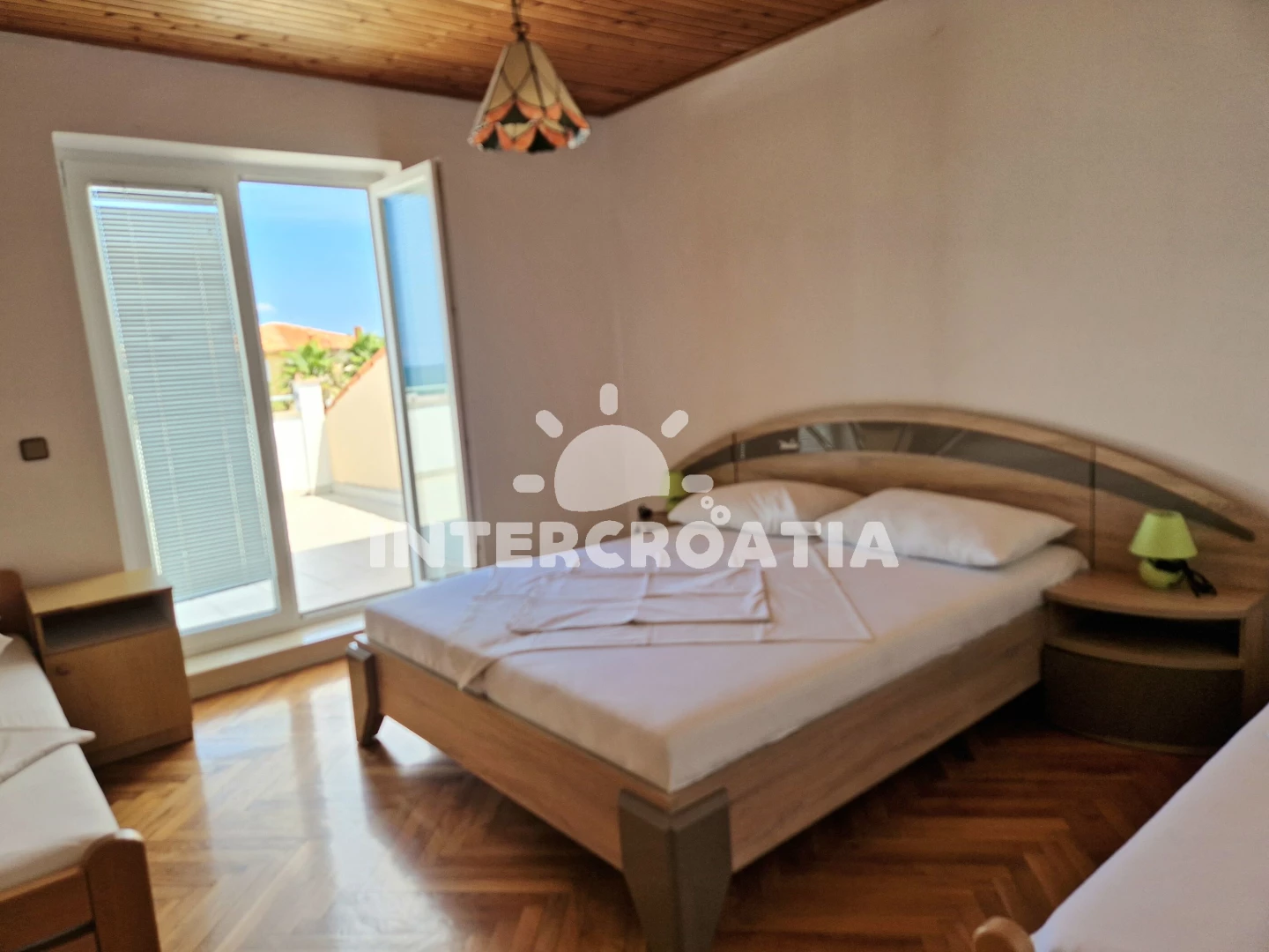 Apartmán (50 m2) s terasou, posezením a výhledem na moře se nachází ve 2. patře domu. Apartmán má 2 ložnice a je vhodný pro až 6 osob. Obývací místnost je spojena s kuchyní. Kuchyňská linka je vybavena varnou deskou, digestoří, vestavěnou troubou, rychlovarnou konvicí, nádobím a lednicí s mrazákem. Obývací místnost s jídelním stolem, televizí a vstupem na terasu. Dále chodba s klimatizací a vstupy do ložnic. První ložnice s dvoulůžkem, jednolůžkem a vstupem na terasu. Druhá ložnice s dvoulůžkem, jednolůžkem a vstupem na terasu. Koupelna se sprchovým koutem, umyvadlem, bidetem a wc. Hostům je k dispozici parkování u objektu zdarma.