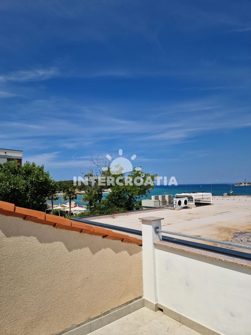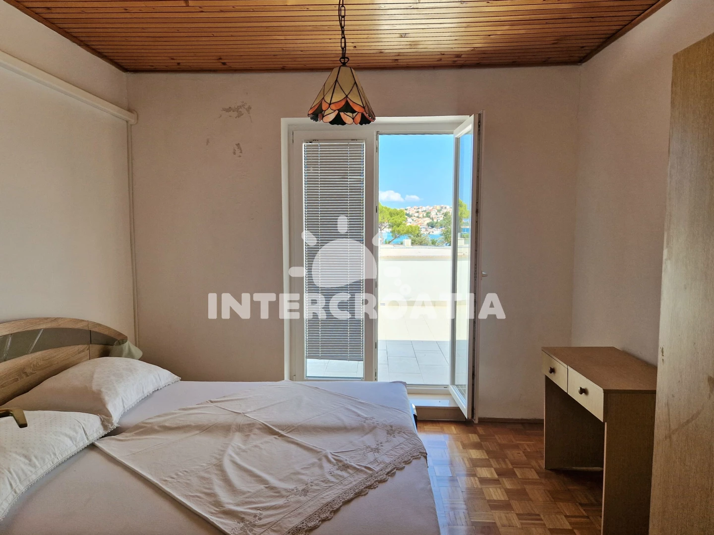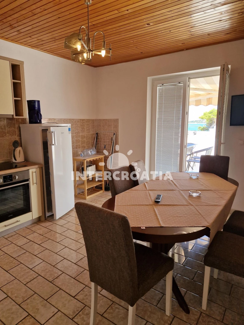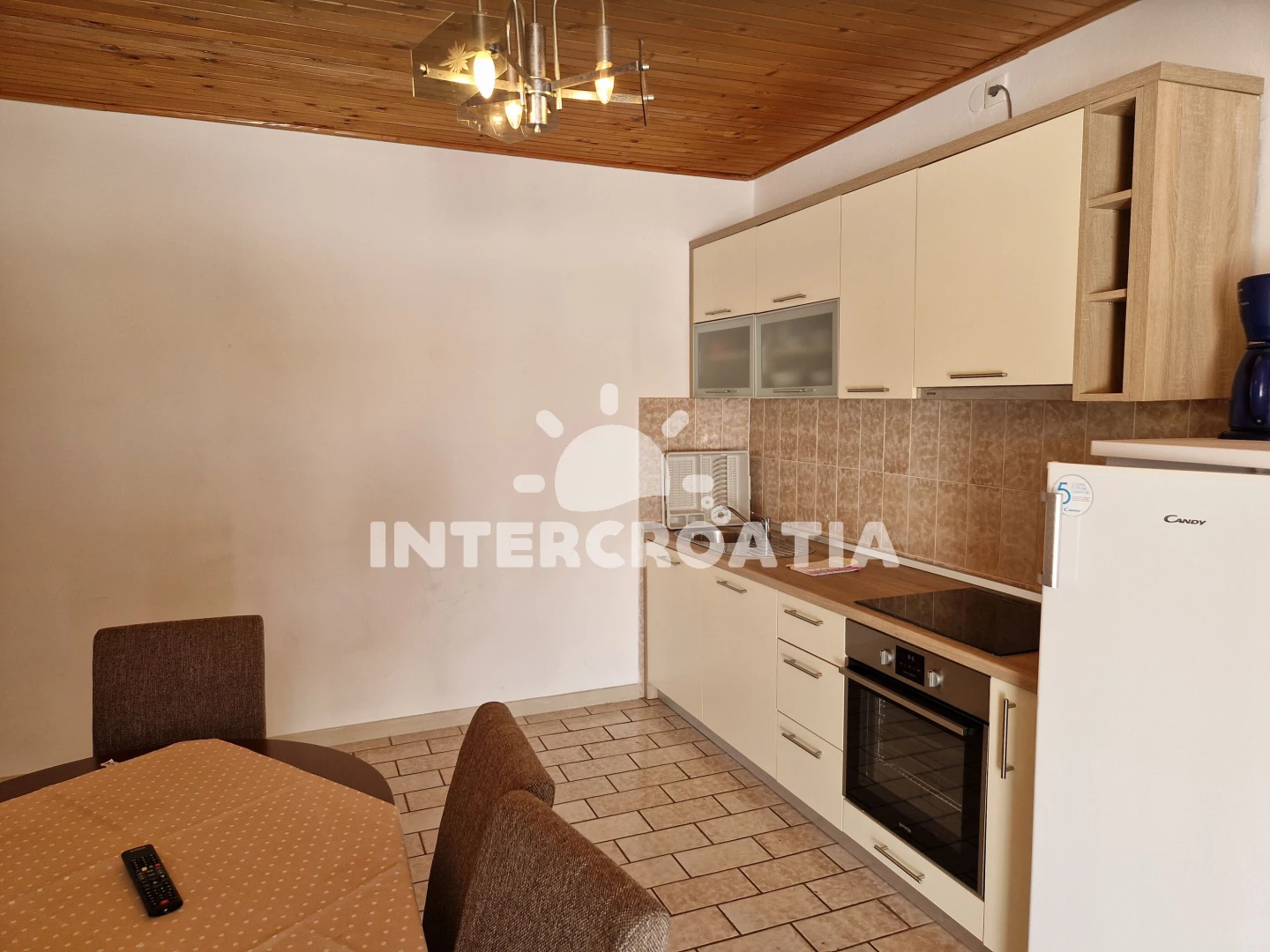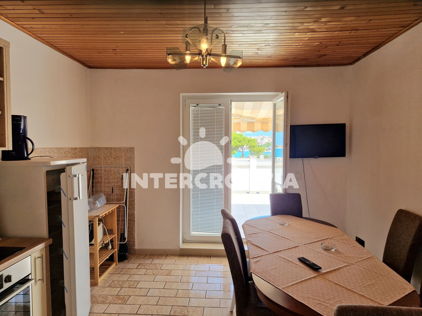 Apartmán (50 m2) s terasou, posezením a výhledem na moře se nachází ve 2. patře domu. Apartmán má 2 ložnice a je vhodný pro až 6 osob. Obývací místnost je spojena s kuchyní. Kuchyňská linka je vybavena varnou deskou, digestoří, vestavěnou troubou, rychlovarnou konvicí, nádobím a lednicí s mrazákem. Obývací místnost s jídelním stolem, televizí a vstupem na terasu. Dále chodba s klimatizací a vstupy do ložnic. První ložnice s dvoulůžkem, jednolůžkem a vstupem na terasu. Druhá ložnice s dvoulůžkem, jednolůžkem a vstupem na terasu. Koupelna se sprchovým koutem, umyvadlem, bidetem a wc. Hostům je k dispozici parkování u objektu zdarma.