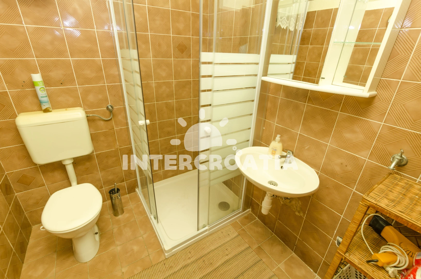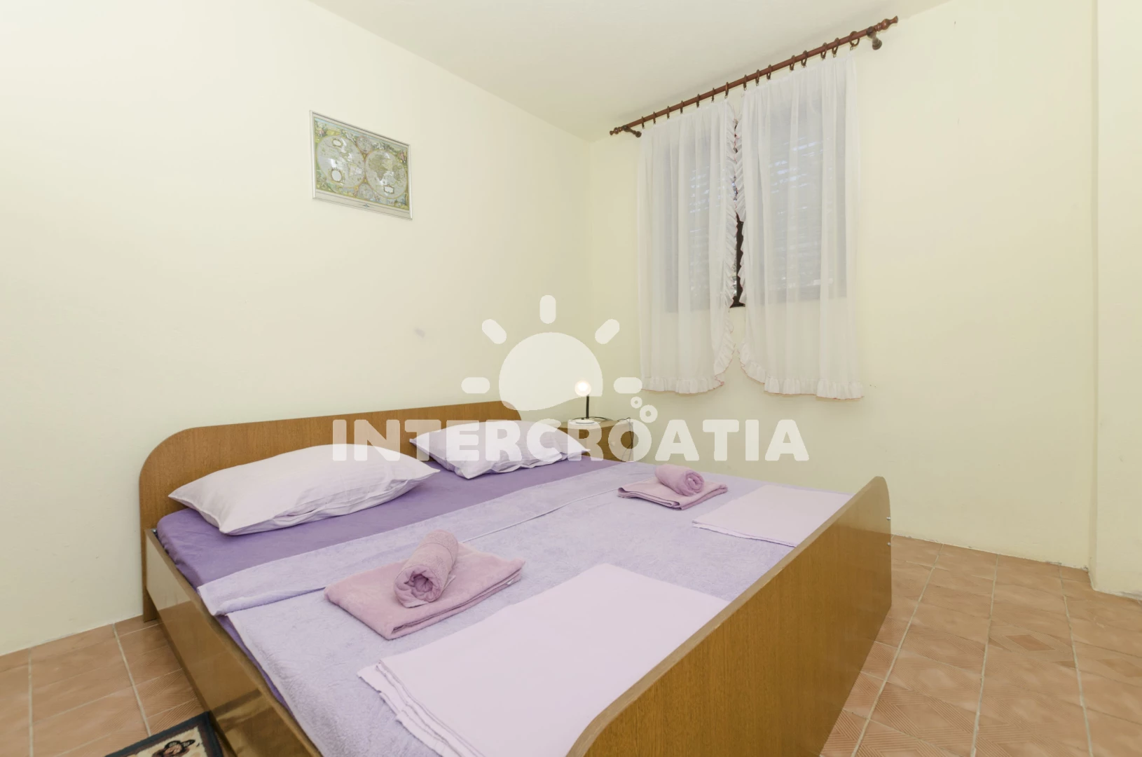 Apartmán s výhledem na moře pro 4 osoby s terasou a posezením se nachází v přízemí domu. Obývací pokoj je částečně oddělený od kuchyně. Kuchyňská linka se sporákem, troubou, mikrovlnnou troubou, kávovarem, nádobím a lednicí s mrazákem. Obývací pokoj s jídelním stolem pro 5 osob, jedním dvoulůžkem, televizí, klimatizací a vstupem na terasu. Ložnice s jedním dvoulůžkem. Koupelna se sprchovým koutem umyvadlem, fénem a wc. Hostům je k dispozici parkování u objektu zdarma.