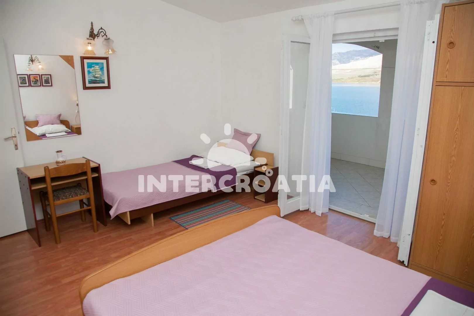 Apartmán pro 3 až 4 osoby, s výhledem na moře, vlastní terasou a venkovním posezením se nachází v prvním patře. Obývací pokoj je spojený s kuchyní. Kuchyňská linka se sporákem, troubou, rychlovarnou konvicí, kávovarem, nádobím a lednicí s mrazákem. Obývací pokoj s jídelním stolem pro 3 osoby a rozložitelnou pohovkou (extra lůžko pro 1 osobu). Ložnice s jedním dvoulůžkem, jedním jednolůžkem a vstupem na terasu. koupelna se sprchovým koutem, pračkou, umyvadlem a wc. Hostům je k dispozici: klimatizace, společná terasa se zděným grilem a parkování u objektu zdarma.
