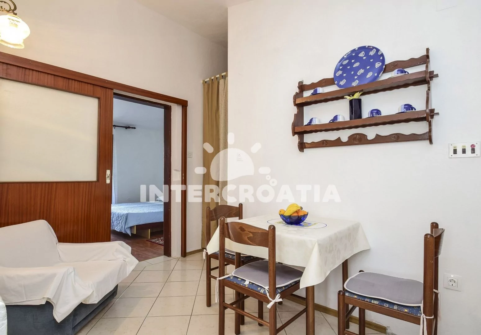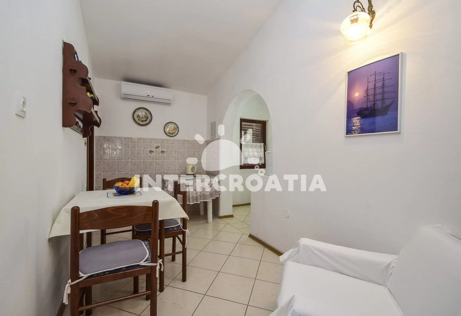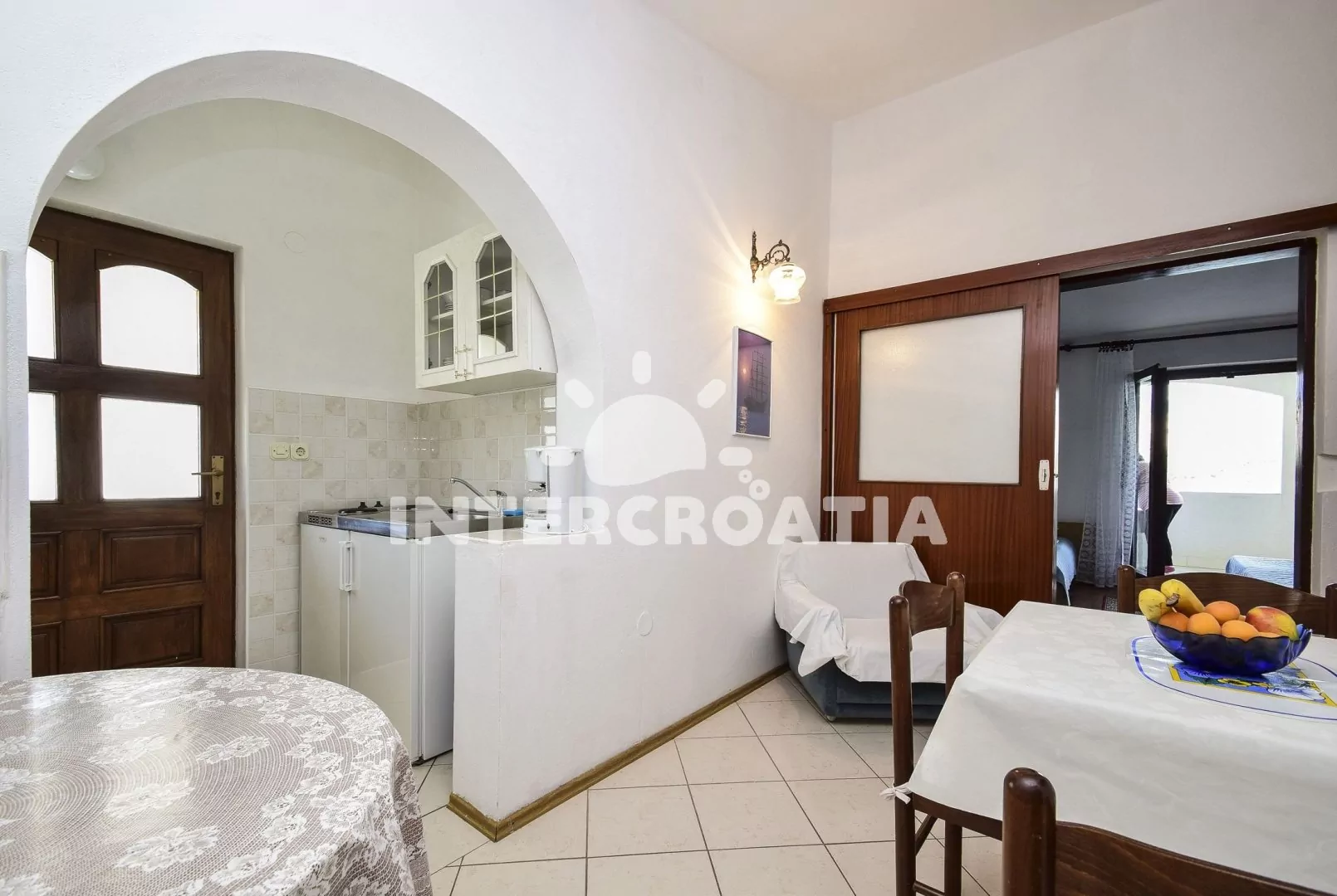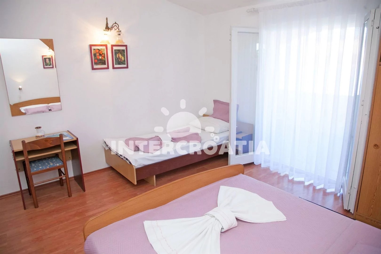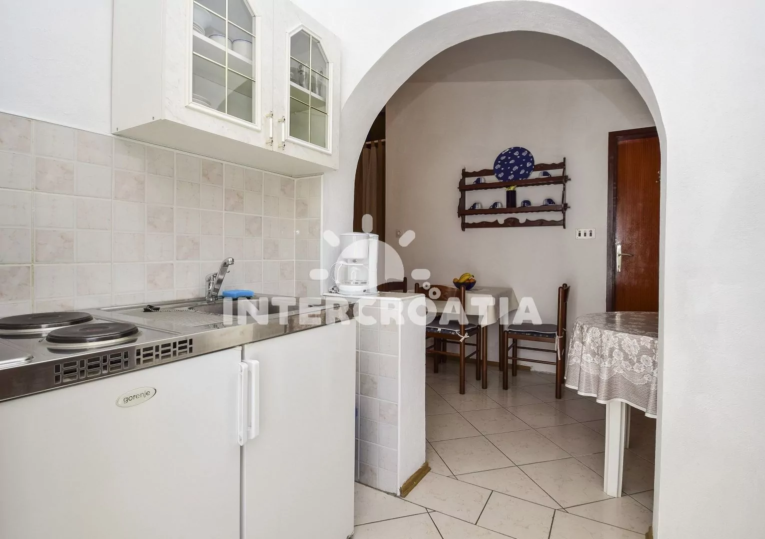 Slunný apartmán pro 3 osoby, s výhledem na moře, vlastní terasou a venkovním posezením se nachází v prvním patře. Obývací pokoj je spojený s kuchyní. Kuchyňská linka s dvouplotýnkovým elektrickým sporákem, rychlovarnou konvicí, kávovarem, nádobím a lednicí s mrazákem. Obývací pokoj s jídelním stolem pro 3 osoby a vstupem do ložnice. Ložnice je vybavena jedním dvoulůžkem, jedním jednolůžkem a vstupem na terasu. Koupelna se sprchovým koutem, pračkou, umyvadlem a wc. Hostům je k dispozici: klimatizace, společná terasa se zděným grilem a parkování u objektu zdarma.