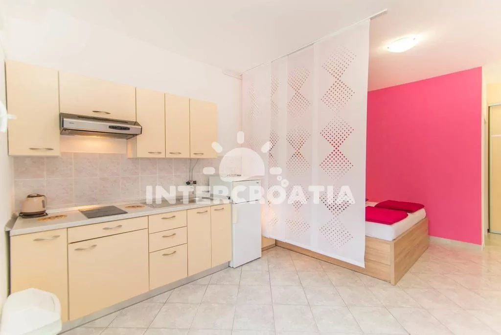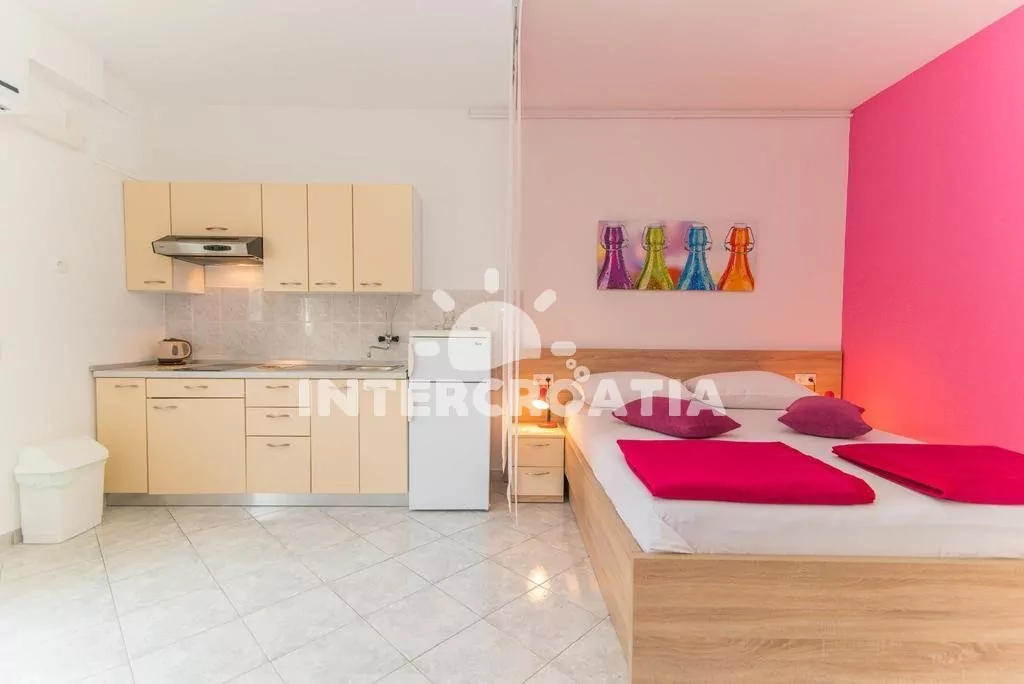 Moderně zařízený apartmán typu studio, s výhledem na moře, terasou a venkovním posezením. Obývací místnost je vybavena kuchyňskou linkou s dvouplotýnkovým sporákem, digestoří, rychlovarnou konvicí, nádobím a lednicí s mrazákem. Obývací část s jídelním stolem pro 2 osoby, jedním dvoulůžkem, televizí se satelitním programem, klimatizací a vstupem na terasu. Koupelna se sprchovým koutem, umyvadlem, fénem, bidetem a wc. Hostům je k dispozici parkování u objektu zdarma.