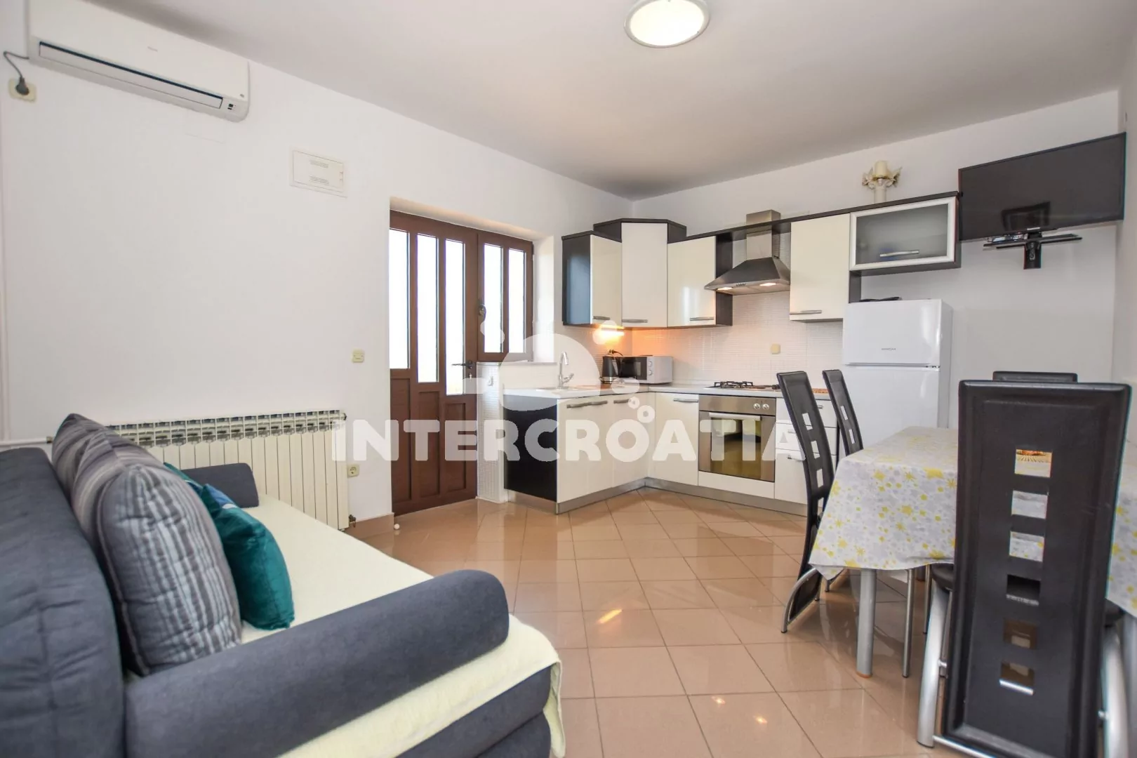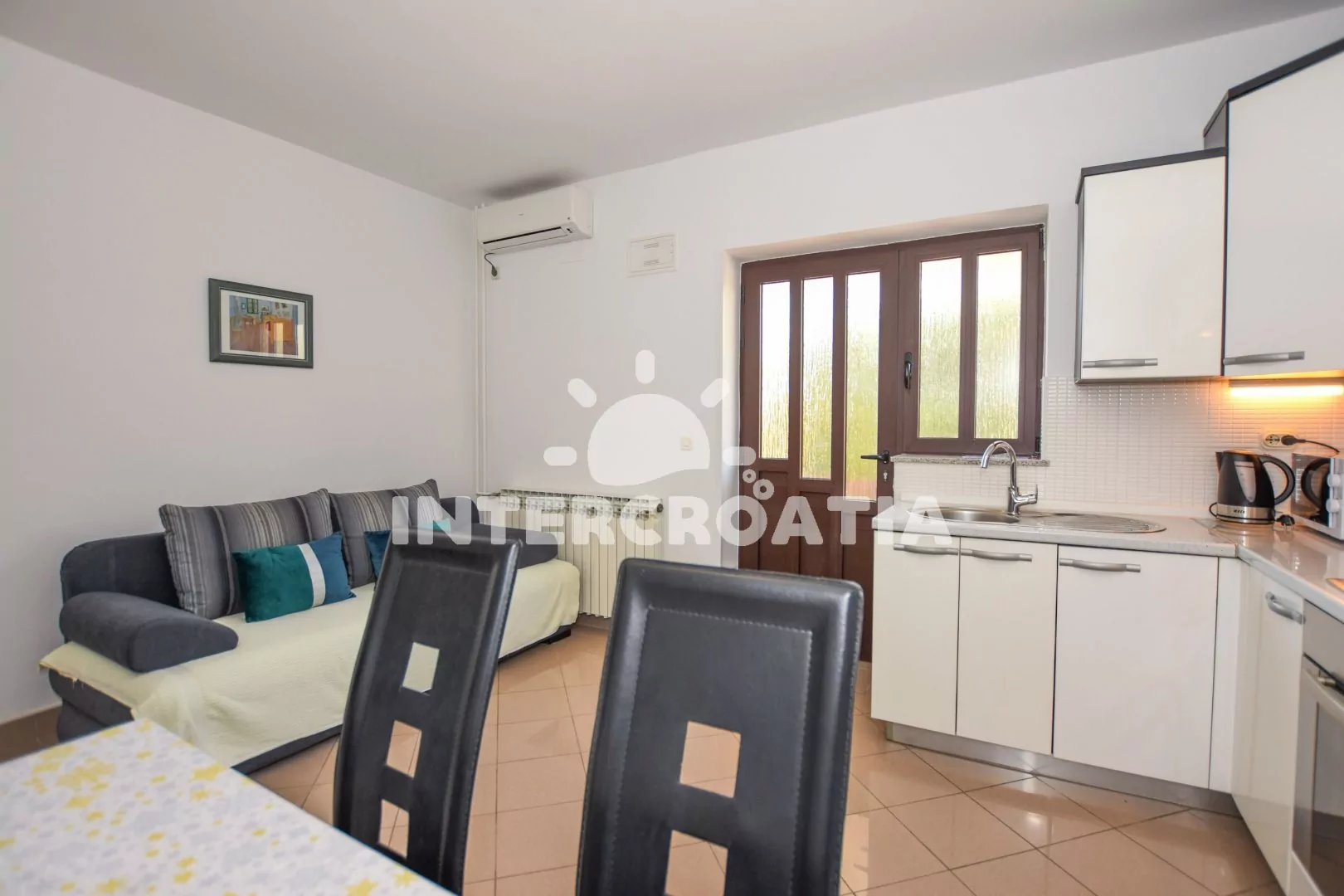 Apartmán s výhledem na moře pro 2 až 4 osoby, nachází se v 1. patře vilky. Obývací pokoj spojený s kuchyní. Kuchyňská linka se sporákem, digestoří, vestavěnou troubou, rychlovarnou konvicí,…