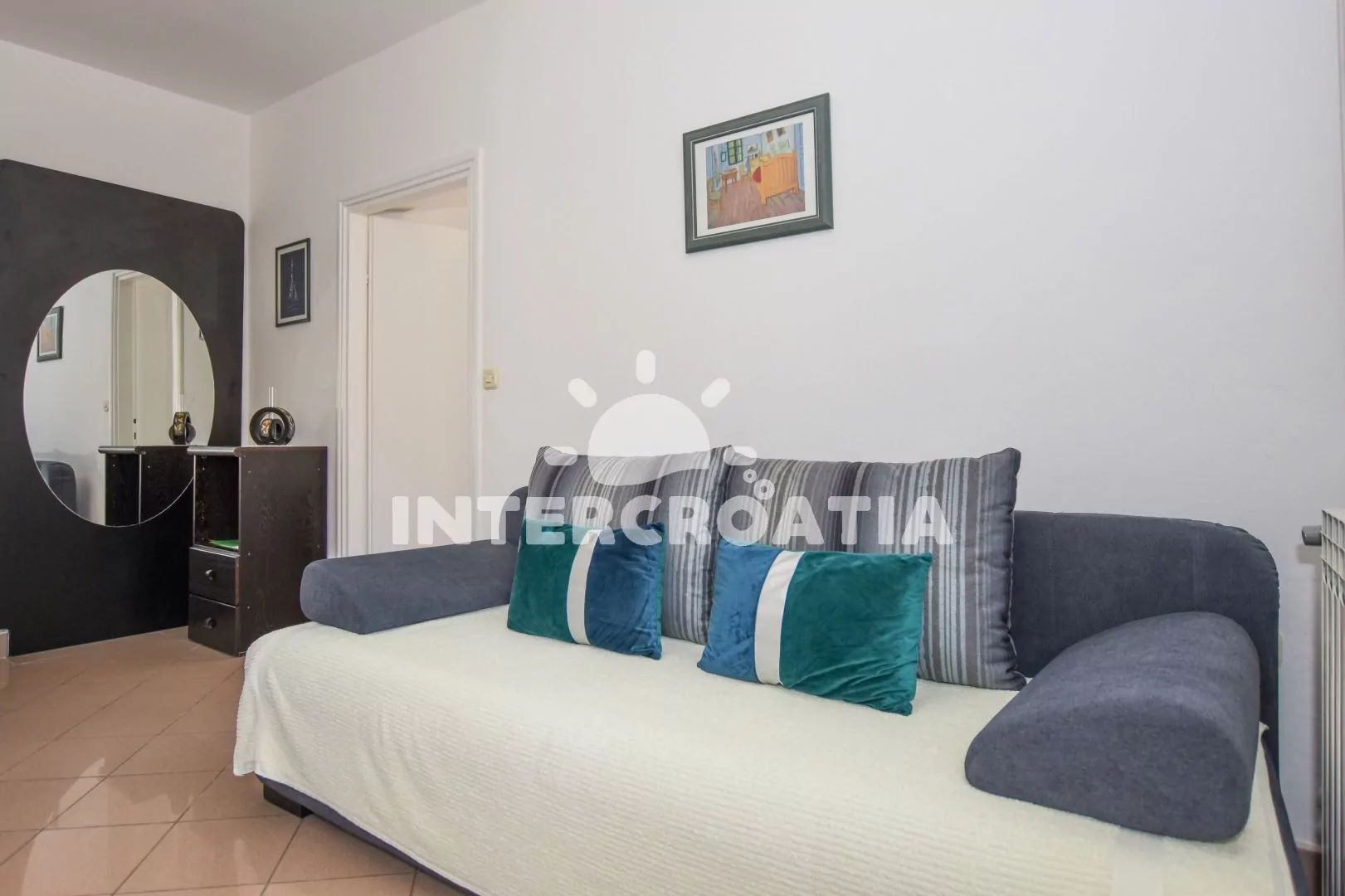 Apartmán s výhledem na moře pro 2 až 4 osoby, nachází se v 1. patře vilky. Obývací pokoj spojený s kuchyní. Kuchyňská linka se sporákem, digestoří, vestavěnou troubou, rychlovarnou konvicí, mikrovlnnou troubou, nádobím a lednicí s mrazákem. Obývací pokoj je vybavený jídelním stolem pro 4 osoby, televizí se satelitním programem, pohovkou (rozložitelná na extra lůžko pro 1 osobu) a klimatizací. Ložnice s dvoulůžkem, jedním jednolůžkem a vstupem na terasu. Koupelna se sprchovým koutem, umyvadlem, fénem a wc. Hostům je k dispozici parkování u objektu zdarma.