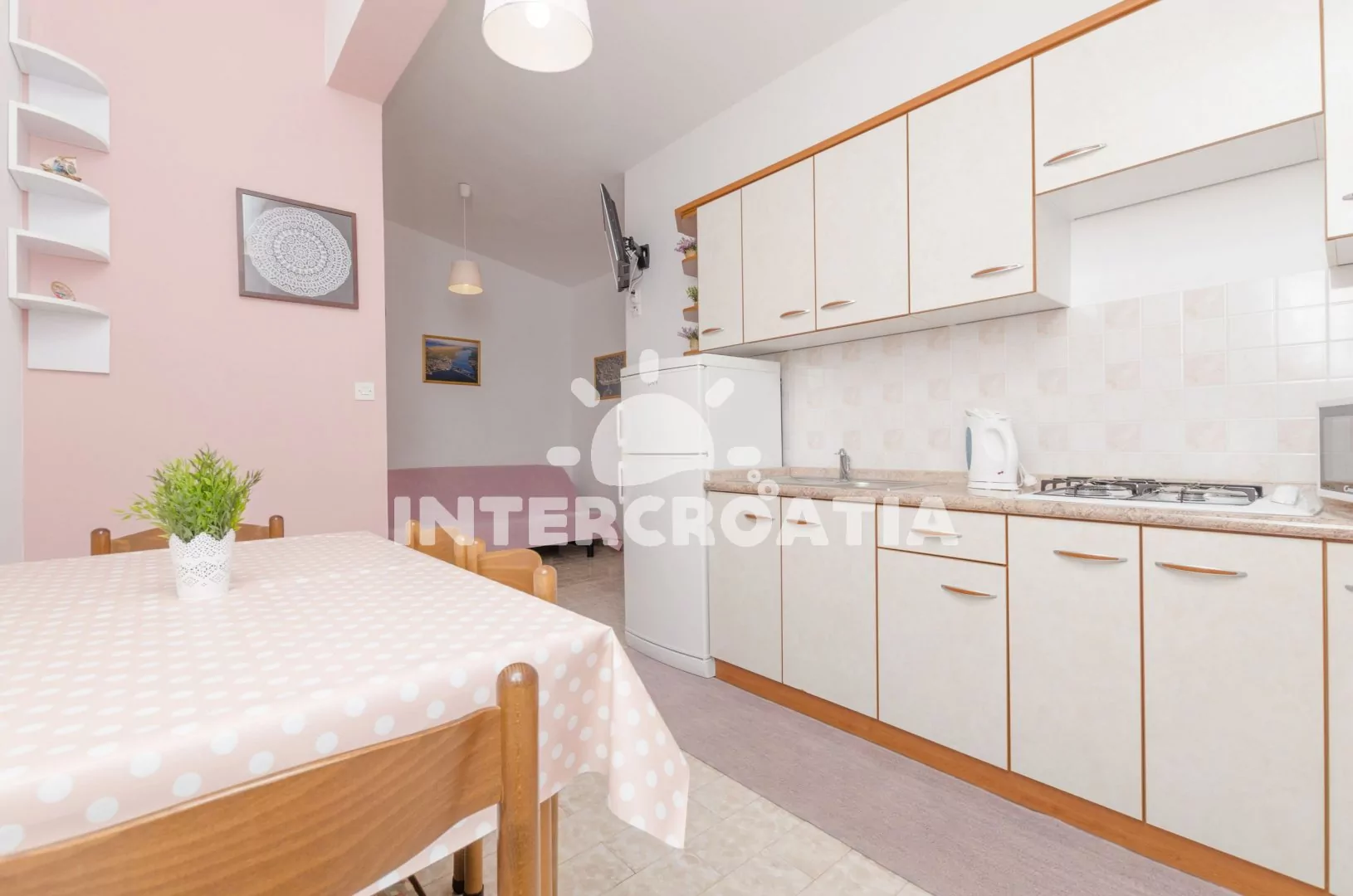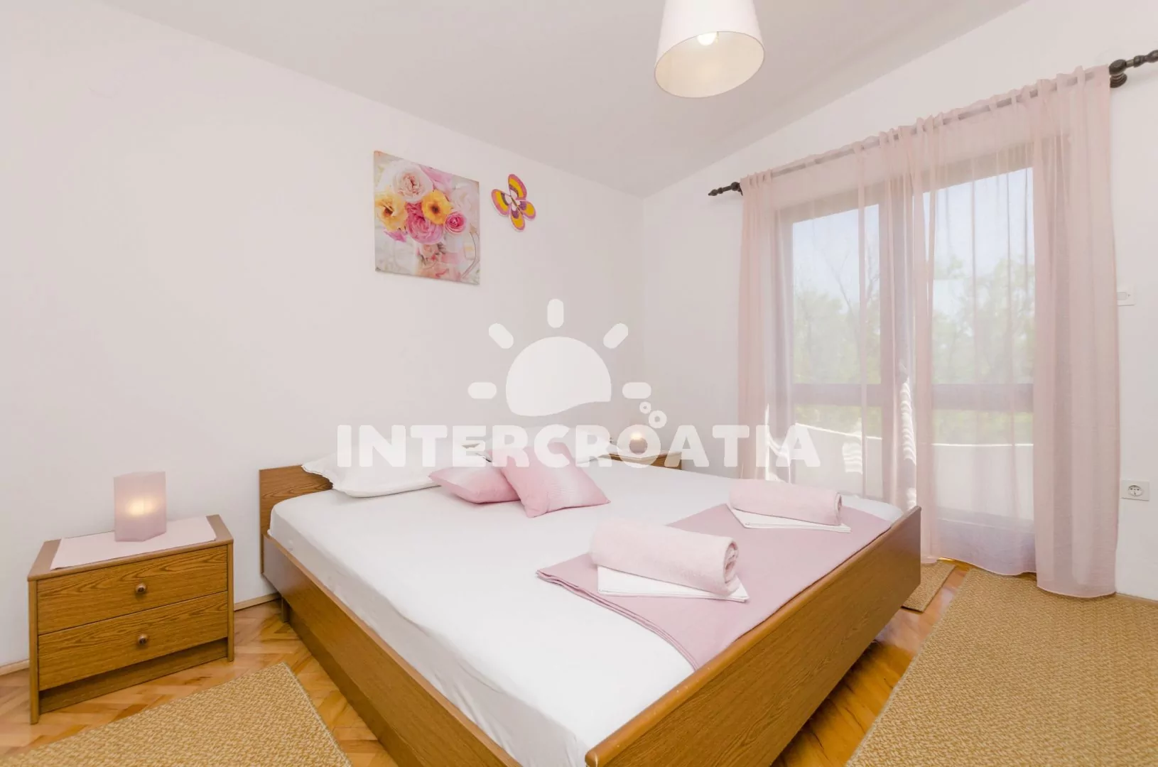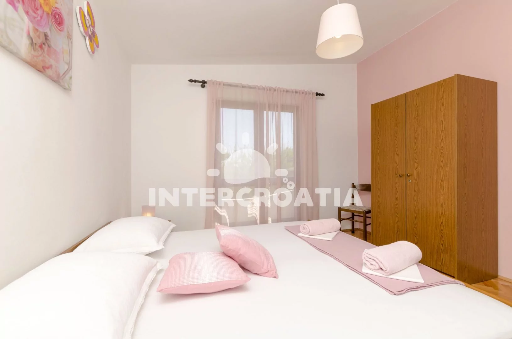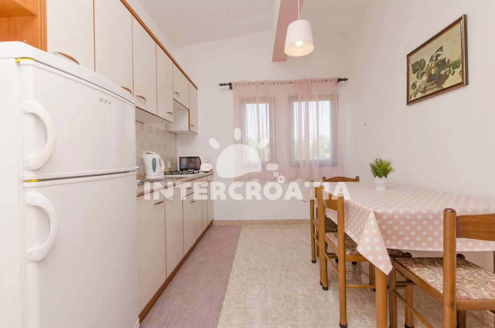 Apartmán (65 m2) s terasou a výhledem na moře se nachází v druhém patře vilky a je vhodný pro 4 osoby. Obývací pokoj je spojený s kuchyní. Kuchyňská linka se sporákem, mikrovlnnou troubou, rychlovarnou konvicí, nádobím a lednicí s mrazákem. Obývací pokoj s jídelním stolem pro 4 osoby, pohovkou a televizí. První i druhá ložnice je vybavena vždy s jedním dvoulůžkem a vstupem na terasu. Koupelna se sprchovým koutem, umyvadlem, bidetem a wc. Hostům je k dispozici parkování u objektu zdarma.