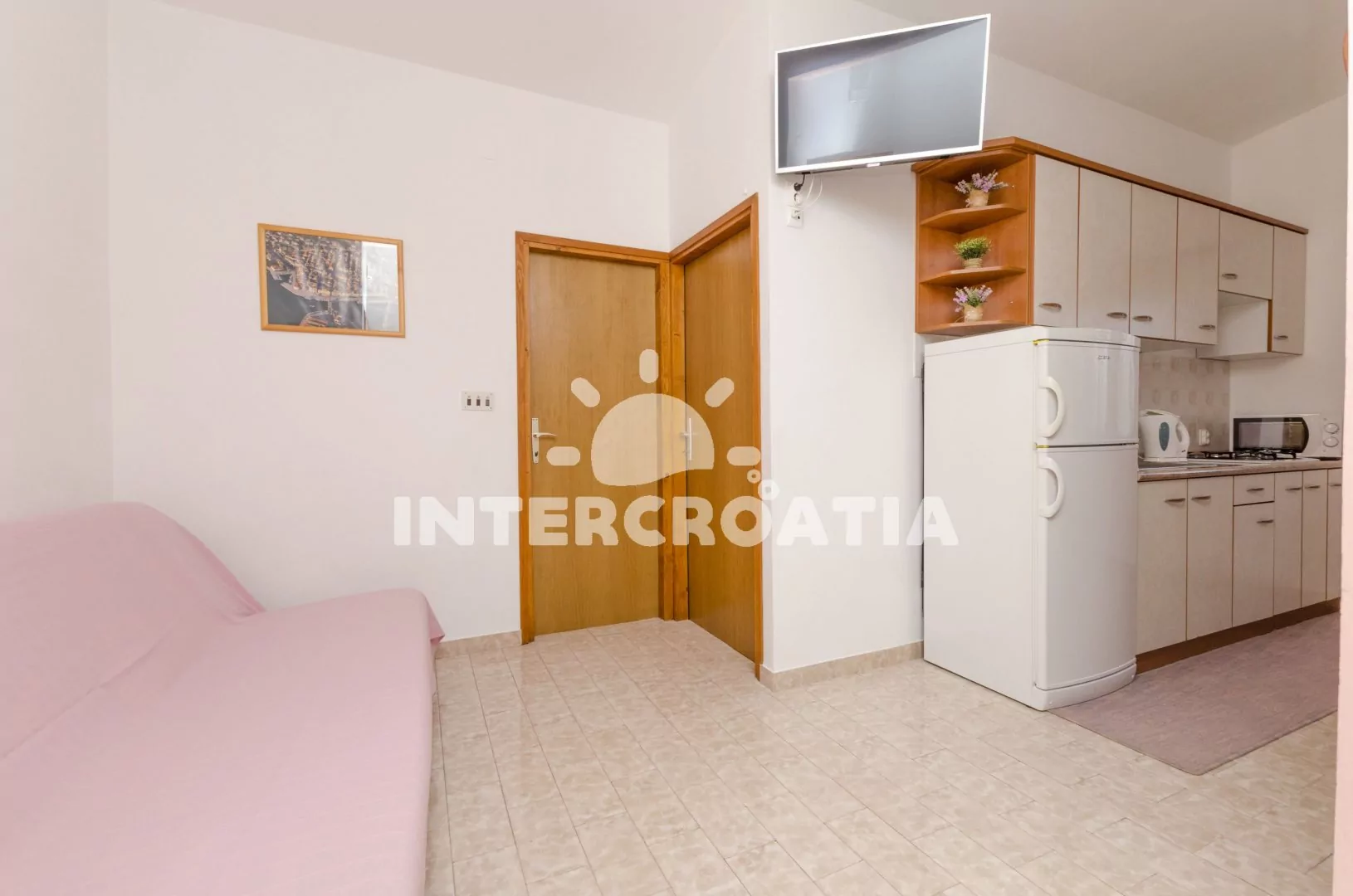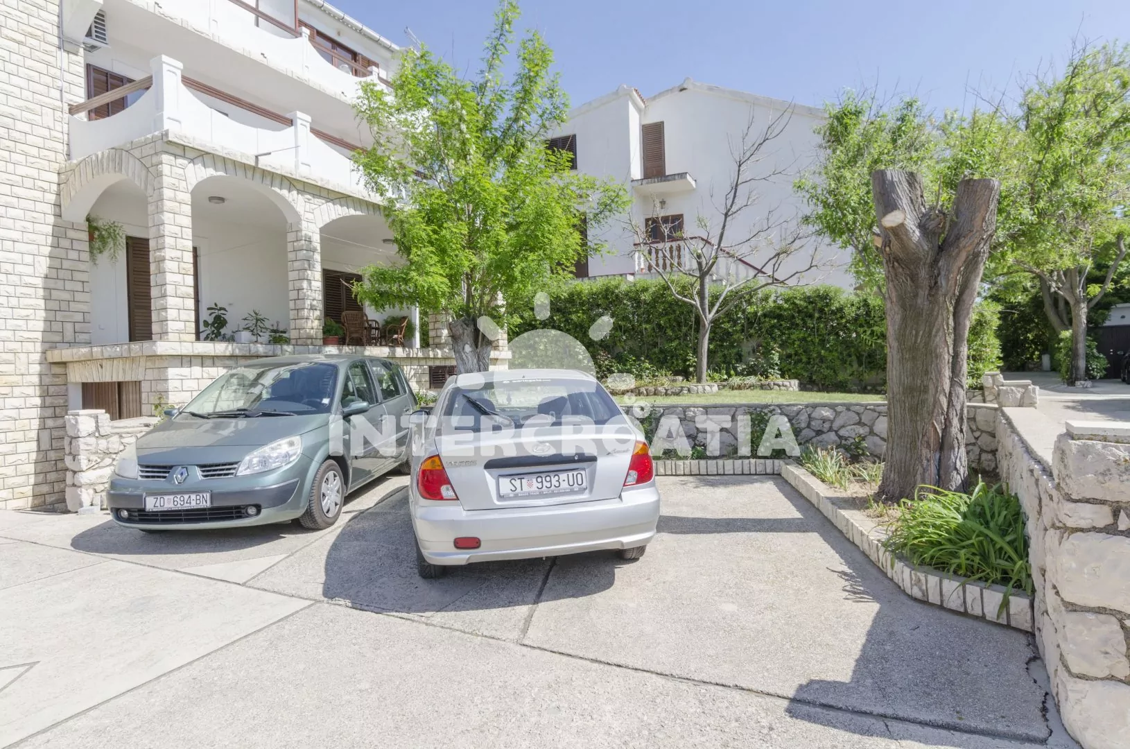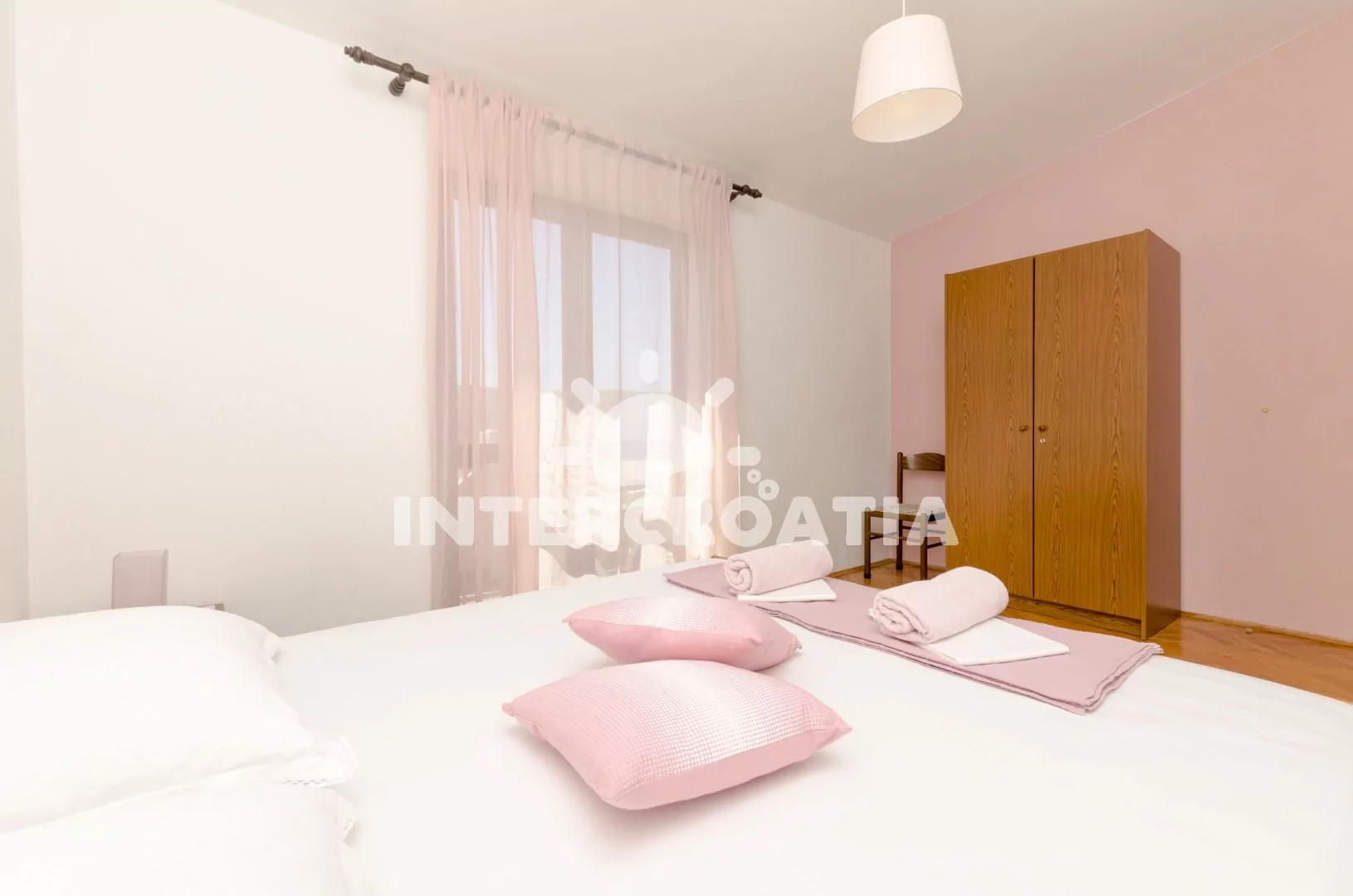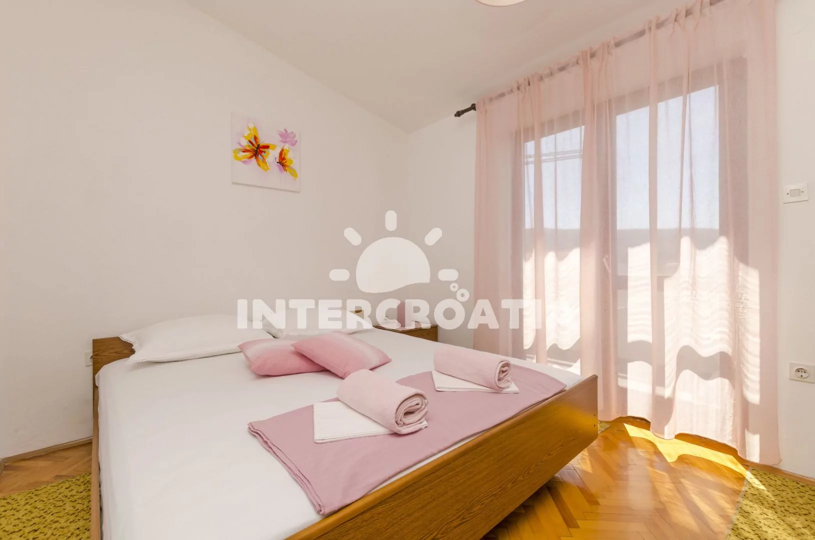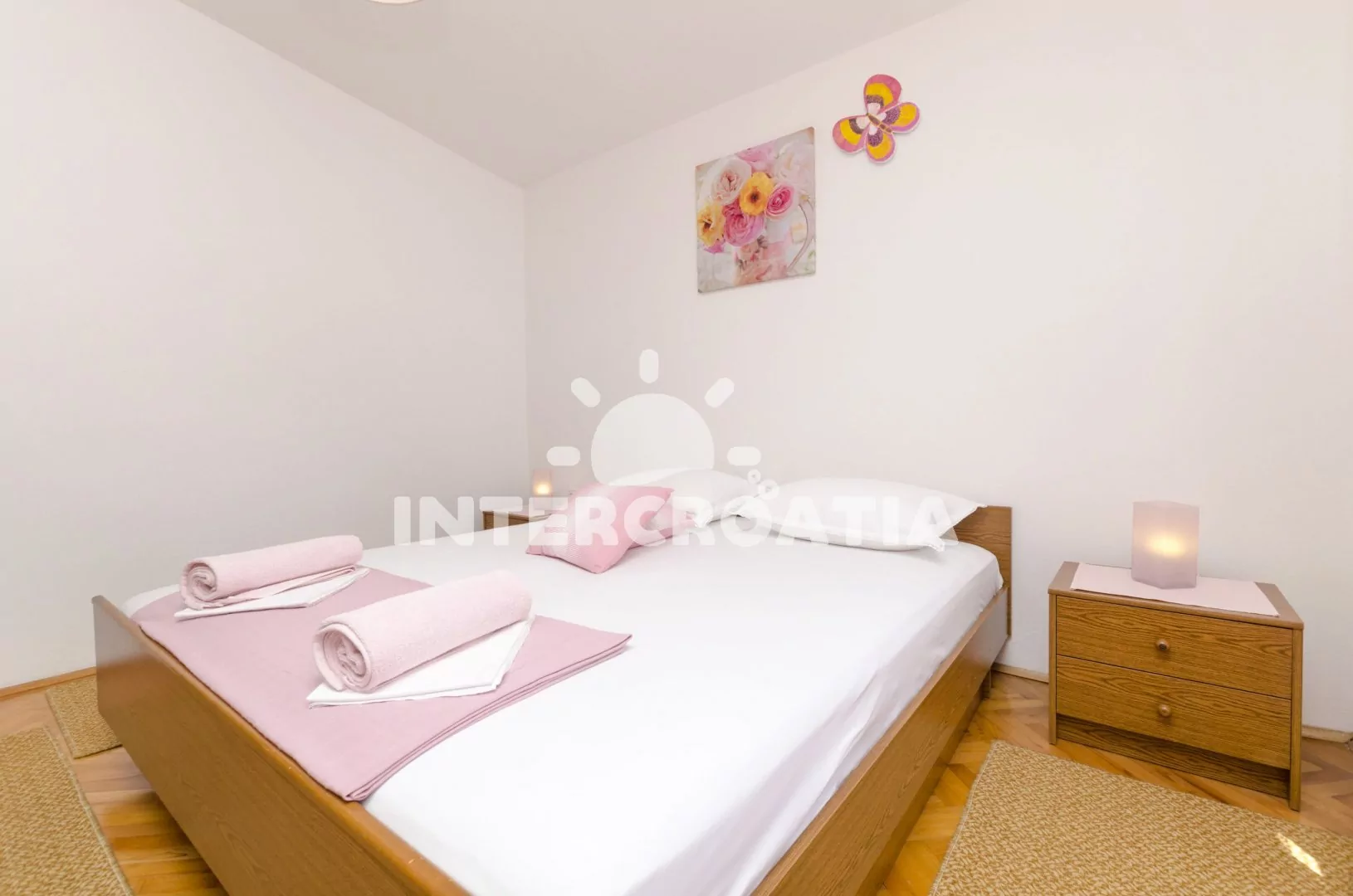Apartmán (65 m2) s terasou a výhledem na moře se nachází v druhém patře vilky a je vhodný pro 4 osoby. Obývací pokoj je spojený s kuchyní. Kuchyňská linka se sporákem, mikrovlnnou troubou, rychlovarnou konvicí, nádobím a lednicí s mrazákem. Obývací pokoj s jídelním stolem pro 4 osoby, pohovkou a televizí. První i druhá ložnice je vybavena vždy s jedním dvoulůžkem a vstupem na terasu. Koupelna se sprchovým koutem, umyvadlem, bidetem a wc. Hostům je k dispozici parkování u objektu zdarma.