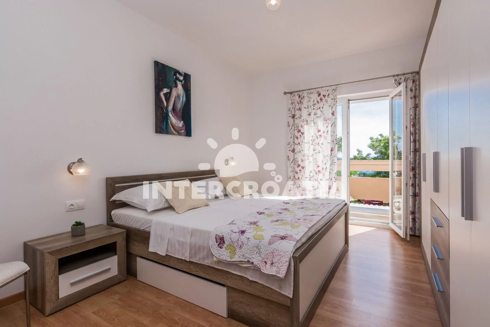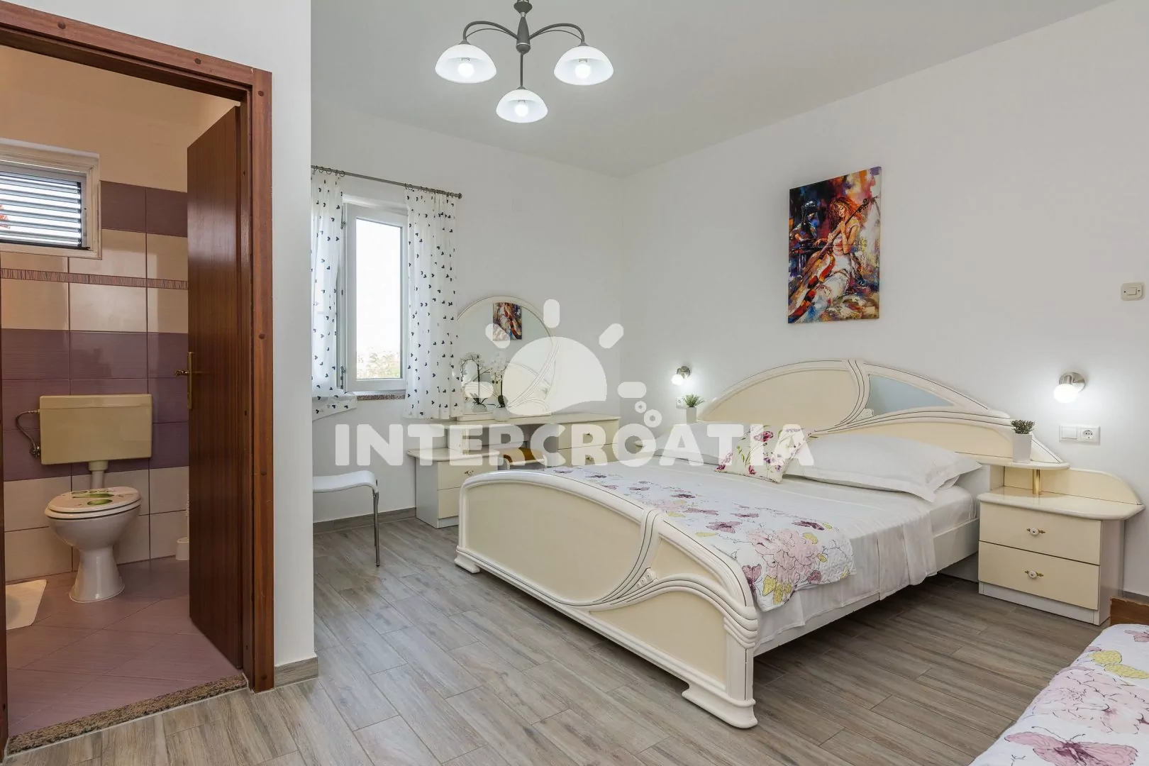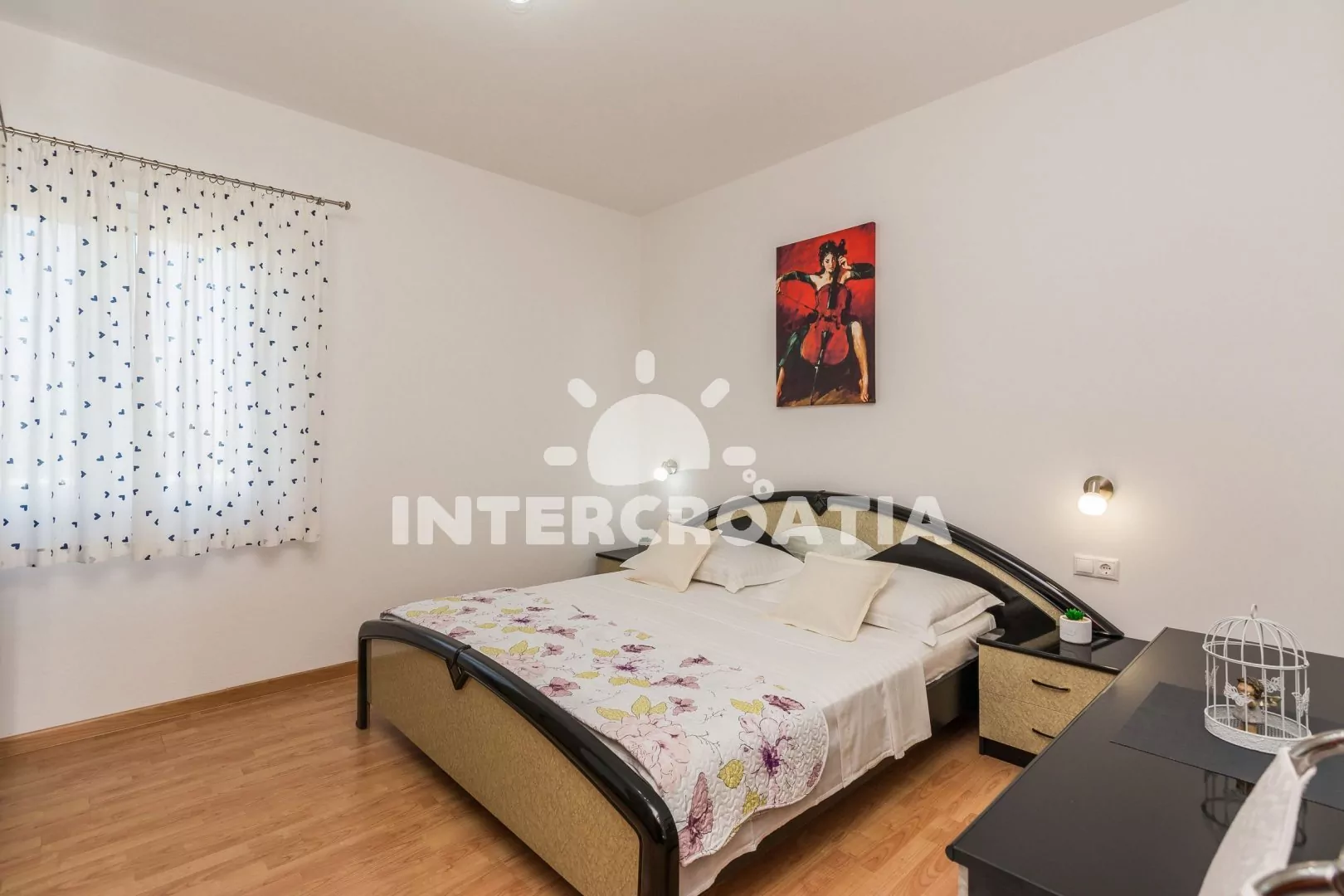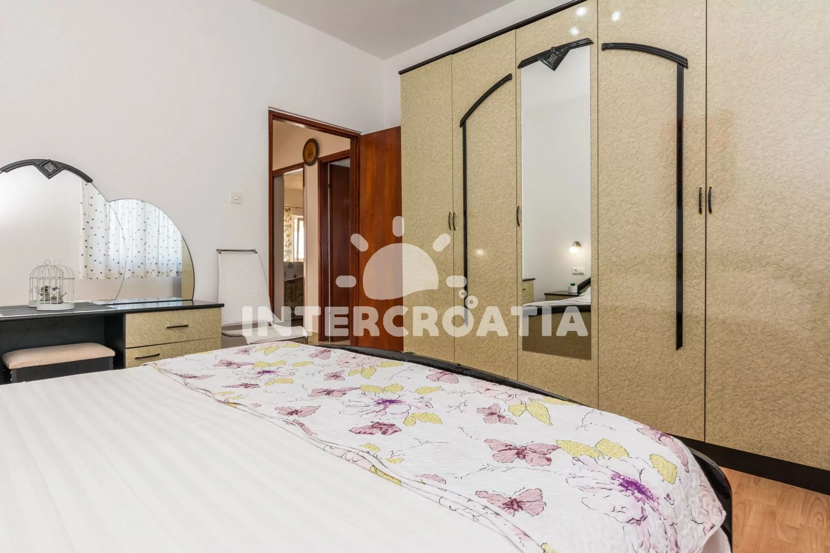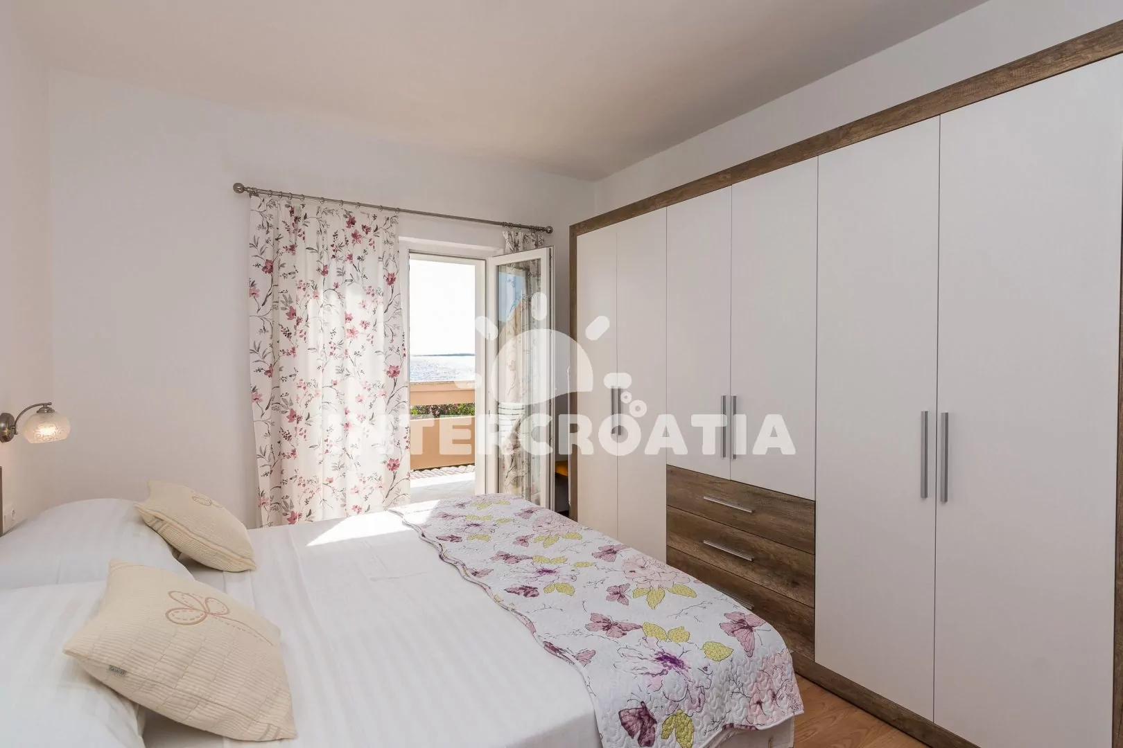 Prostorný a moderně zařízený apartmán (100 m2) s vlastním balkonem a výhledem na moře se nachází v prvním patře domu. Obývací pokoj je spojený s kuchyní. Kuchyňská linka je vybavena sporákem, digestoří, troubou, mikrovlnnou troubou, myčkou na nádobí, kávovarem, rychlovarnou konvicí, nádobím a lednicí s mrazákem. Obývací pokoj s jídelním stolem, pohovkou (rozložitelná na extra lůžko pro 1 osobu), LCD televizí se satelitním programem, klimatizací a vstup na balkon. První ložnice s dvoulůžkem a vstupem na balkon. Druhá a třetí ložnice je vybavena vždy s jedním dvoulůžkem. První koupelna se sprchovým koutem, umyvadlem, pračkou a wc. Druhá koupelna se sprchovým koutem, umyvadlem a wc. Hostům je k dispozici parkování u objektu zdarma.