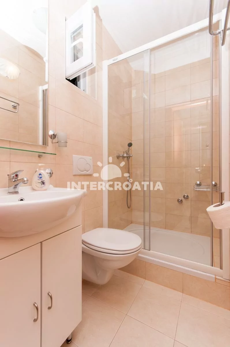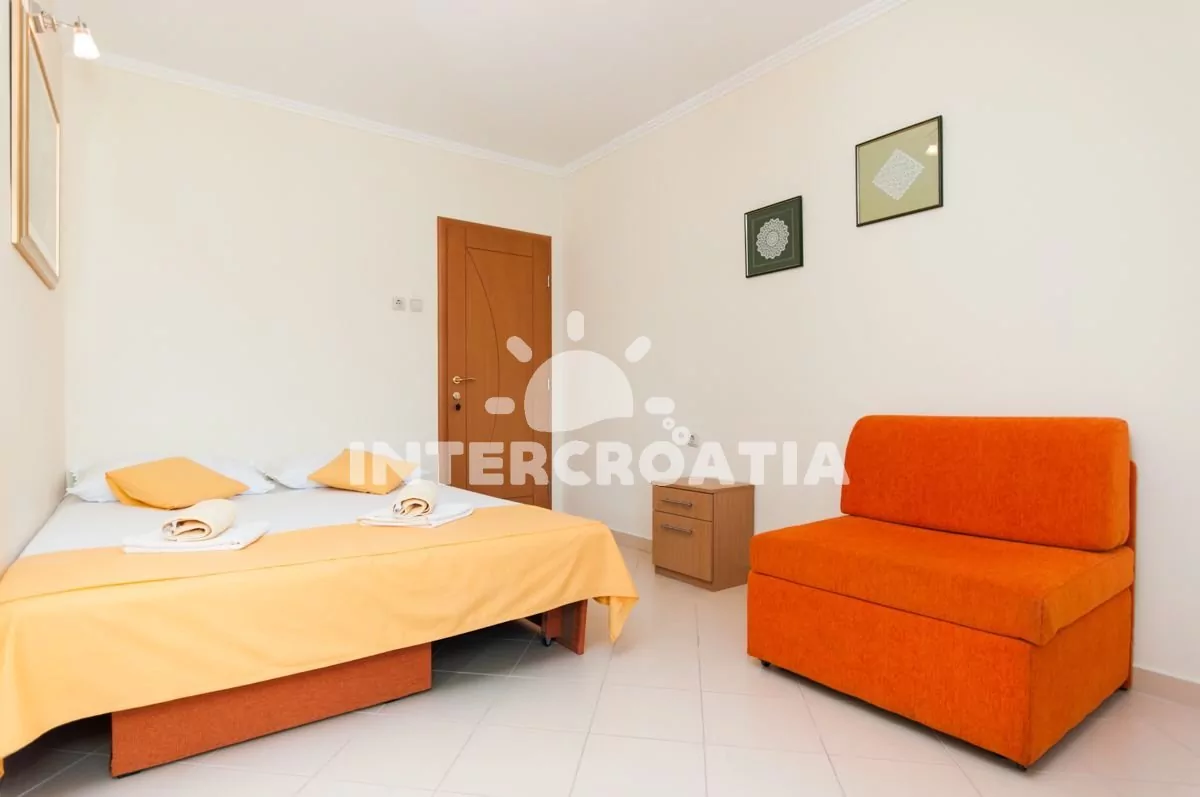 Apartmán (28 m2) typu studio s balkonem a výhledem na moře se nachází v 1. patře vily. Obývací místnost je spojena s kuchyní. Kuchyňská linka je vybavena dvouplotýnkovým vařičem, mikrovlnnou troubou, rychlovarnou konvicí, kávovarem, toustovačem, nádobím a lednicí s mrazákem. Obývací místnost s jídelním stolem, pohovkou, dvoulůžkem, televizí, rádiem, klimatizací a vstupem na balkon. Koupelna se sprchovým koutem, umyvadlem, fénem a wc. Hostům je k dispozici parkování u objektu zdarma.