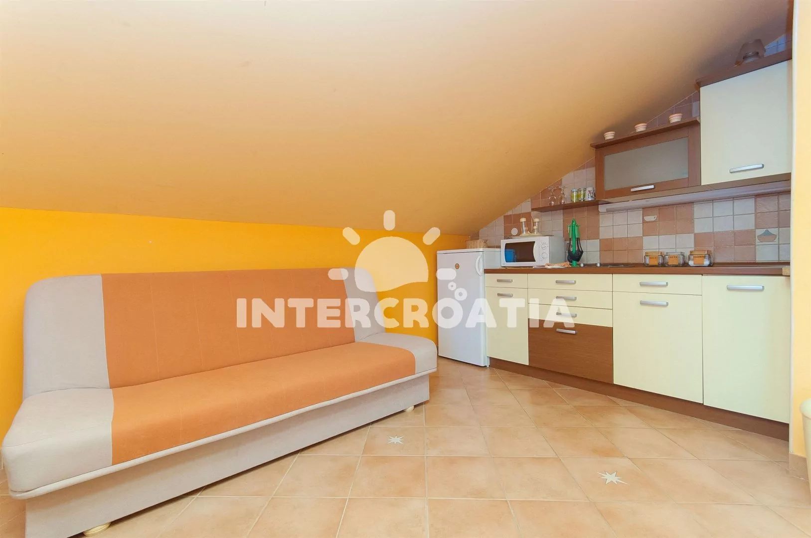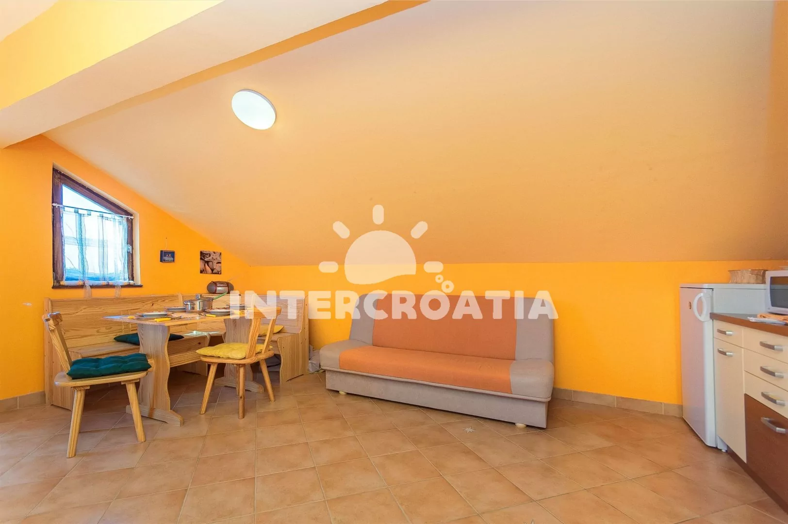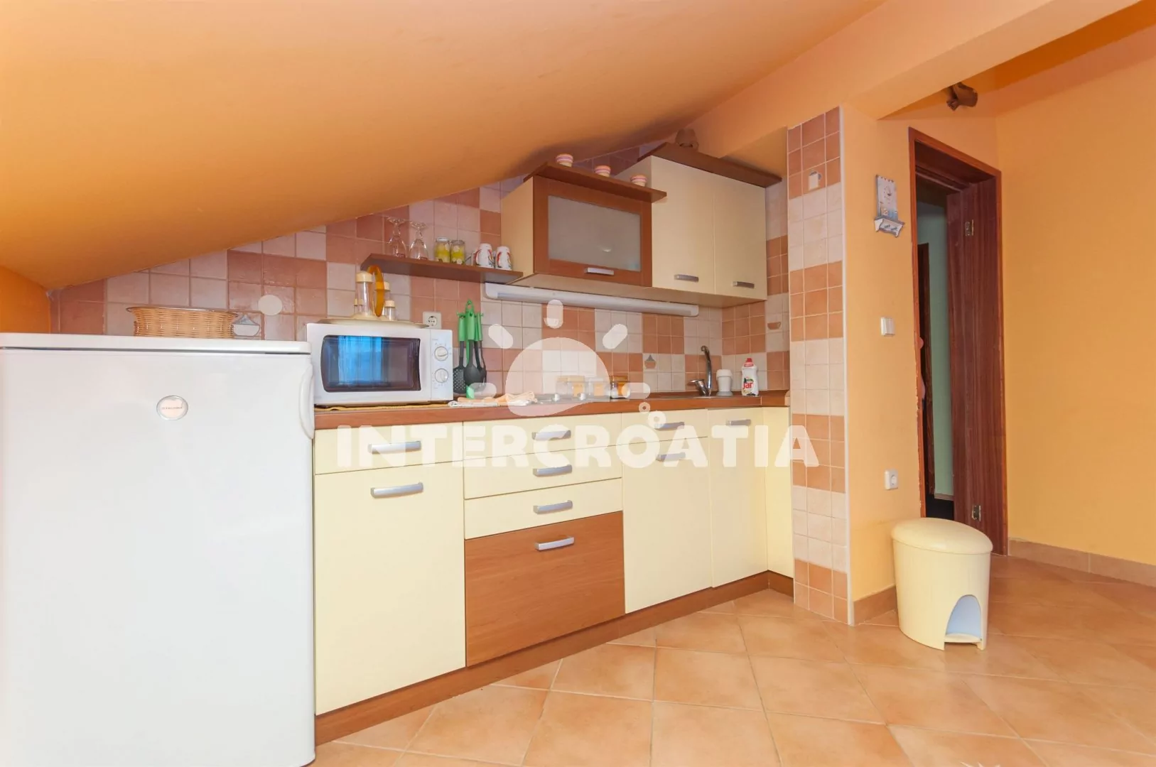 Apartmán s terasou se nachází v prvním patře a je vhodný pro 4 až 5 osob. Obývací pokoj je spojený s kuchyní. Kuchyňská linka je vybavena se sporákem, mikrovlnnou troubou, rychlovarnou konvicí,…
