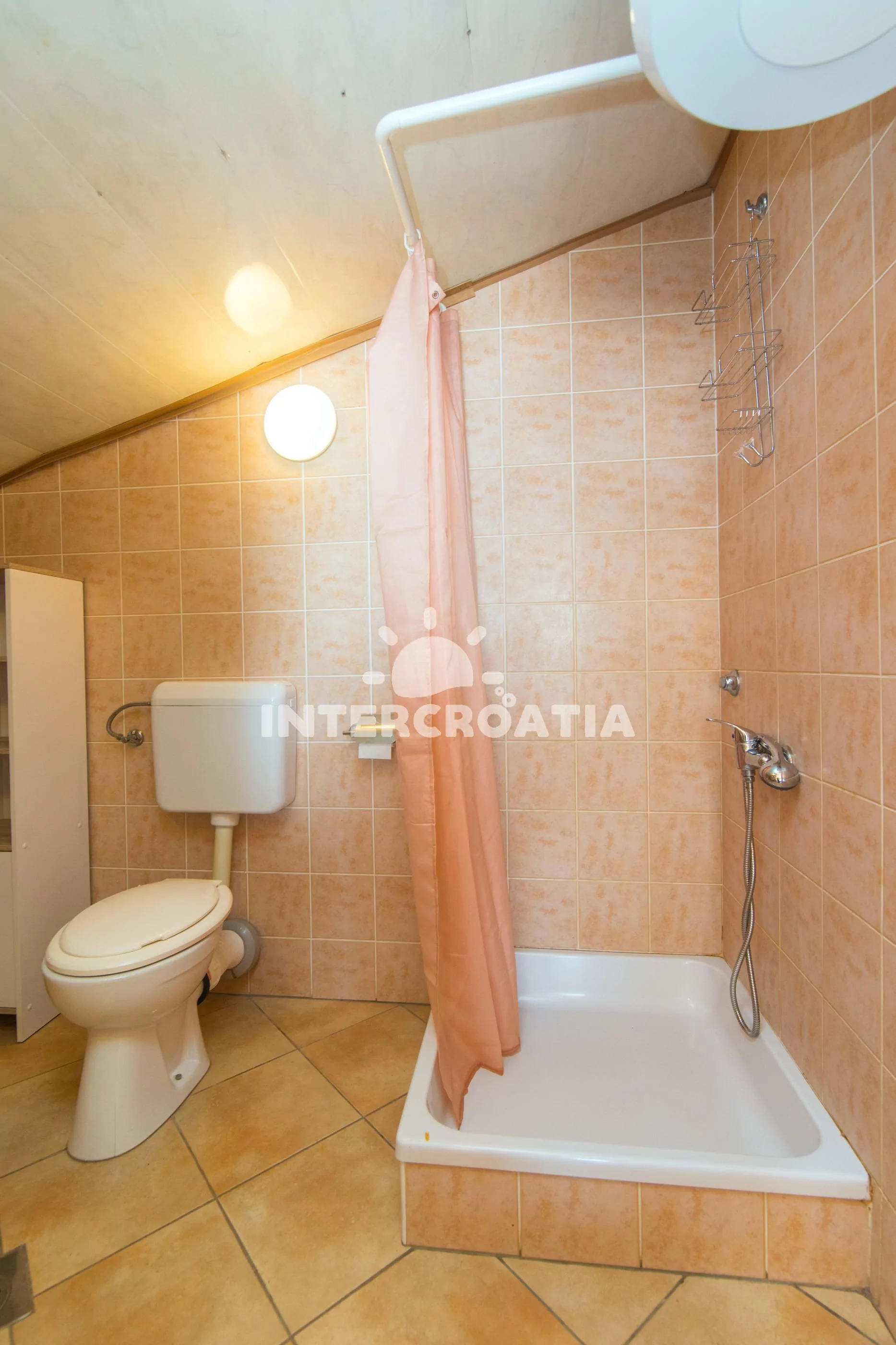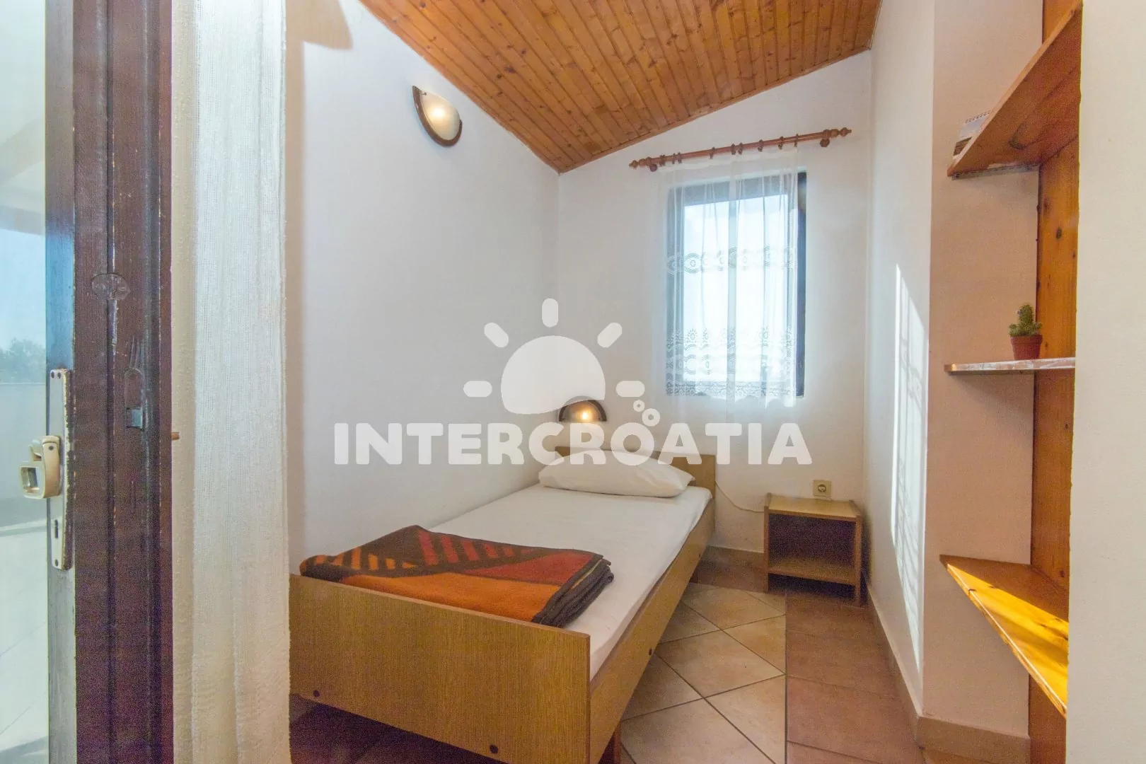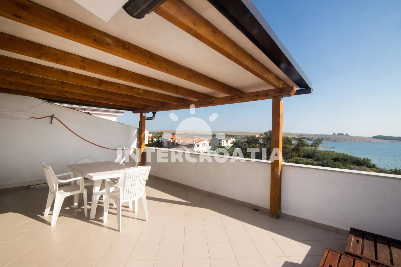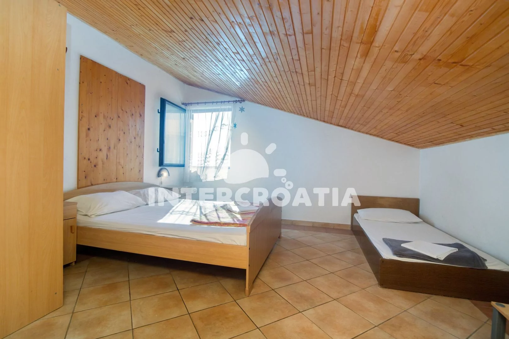 Podkrovní apartmán typu studio, s vlastní terasou a okouzlujícím výhledem na moře. Obývací místnost je spojena s kuchyní. Kuchyň je vybavena jídelním stolem pro 4 osoby, kuchyňskou linkou s varnou deskou, nádobím a lednicí s mrazákem. Obývací místnost s jedním dvoulůžkem, dvěma jednolůžky, televizí, klimatizací a vstupem na terasu. Koupelna se sprchovým koutem, umyvadlem a wc. Hostům je k dispozici parkování u objektu zdarma.