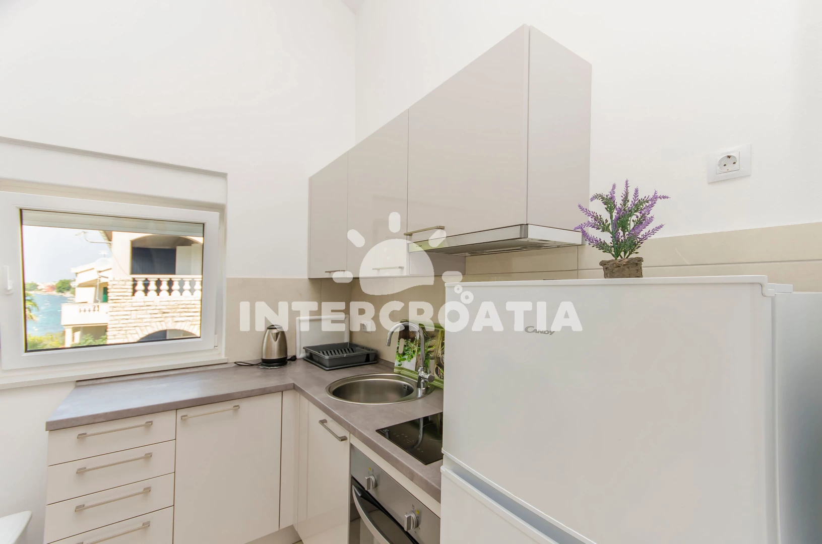 Apartmán (47 m2) s terasou, a výhledem na moře. Nachází se ve 2. patře objektu. Apartmán má 2 ložnice a je vhodný pro až 4 osoby. Kuchyňská linka je vybavena varnou deskou, troubou, rychlovarnou…
