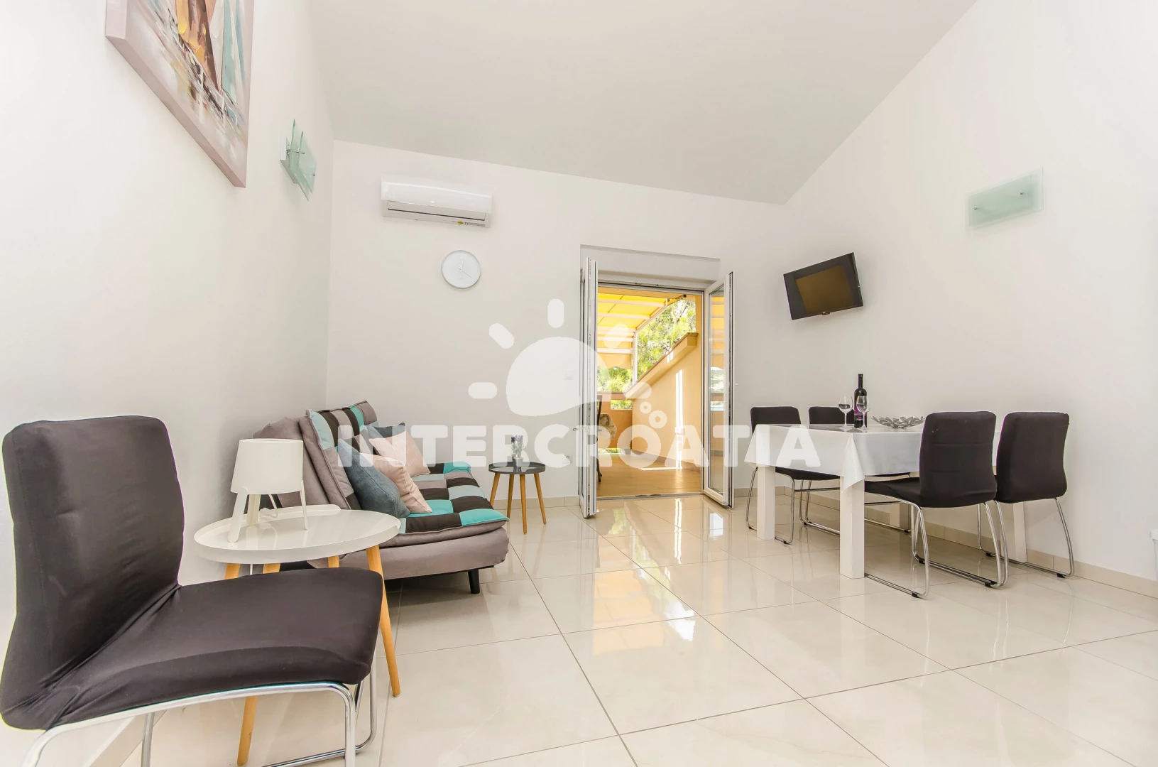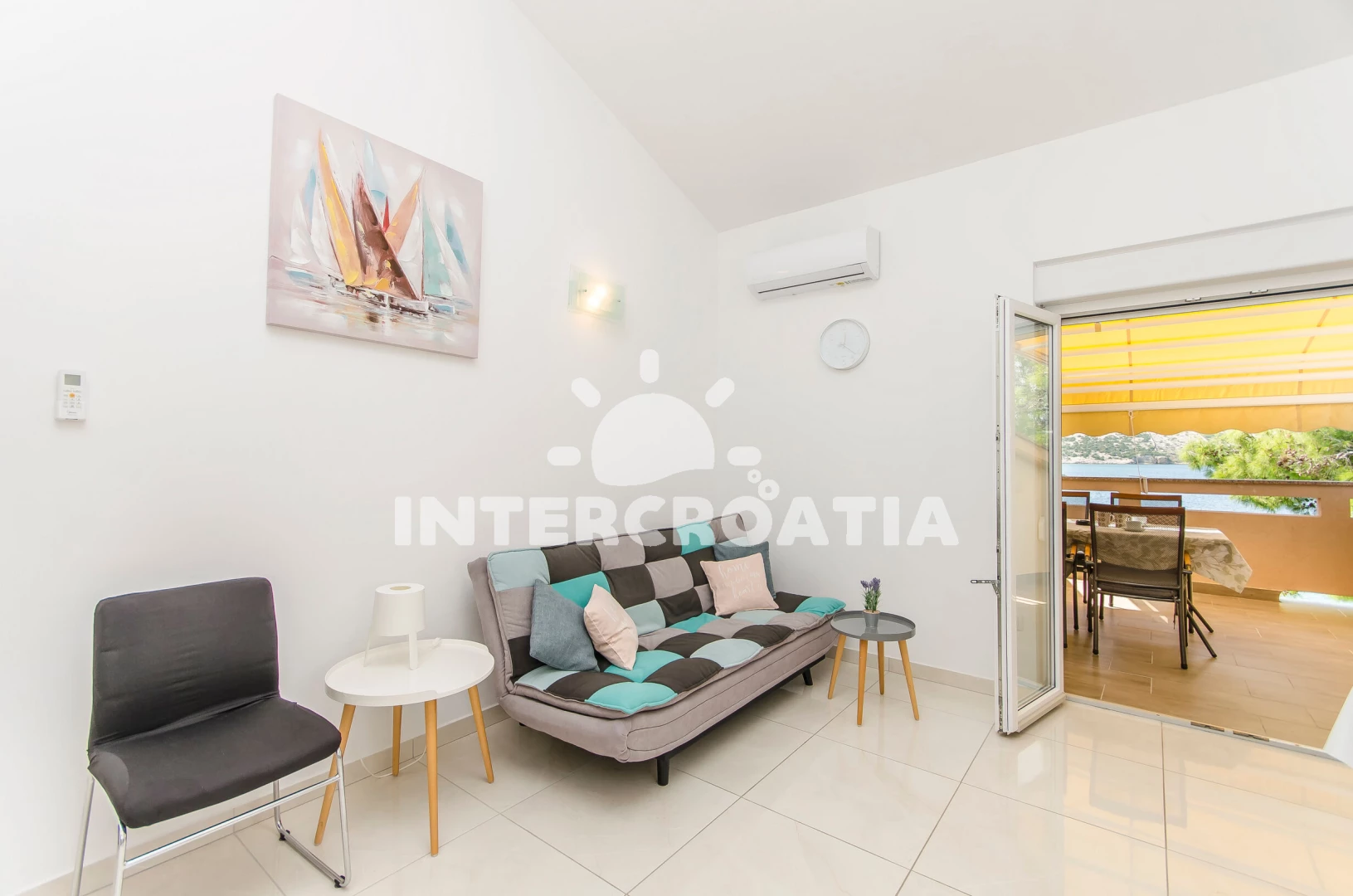 Apartmán se nachází 10 m od moře a pláže. Pláž je oblázková a betonové desky. U objektu je k dispozici společná zahrada s posezením a grilem. Parkování je před domem.