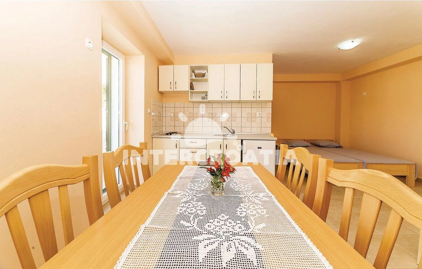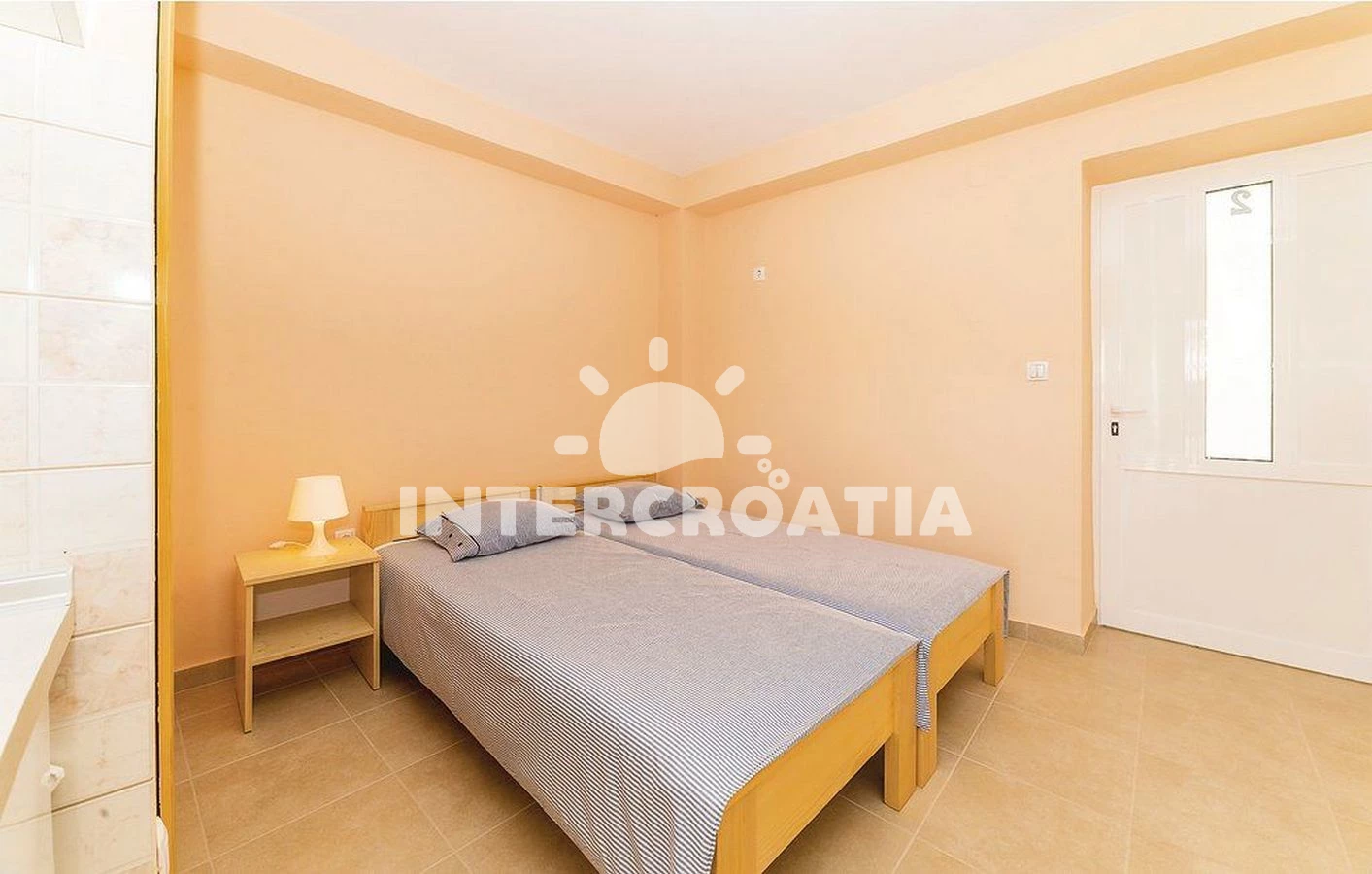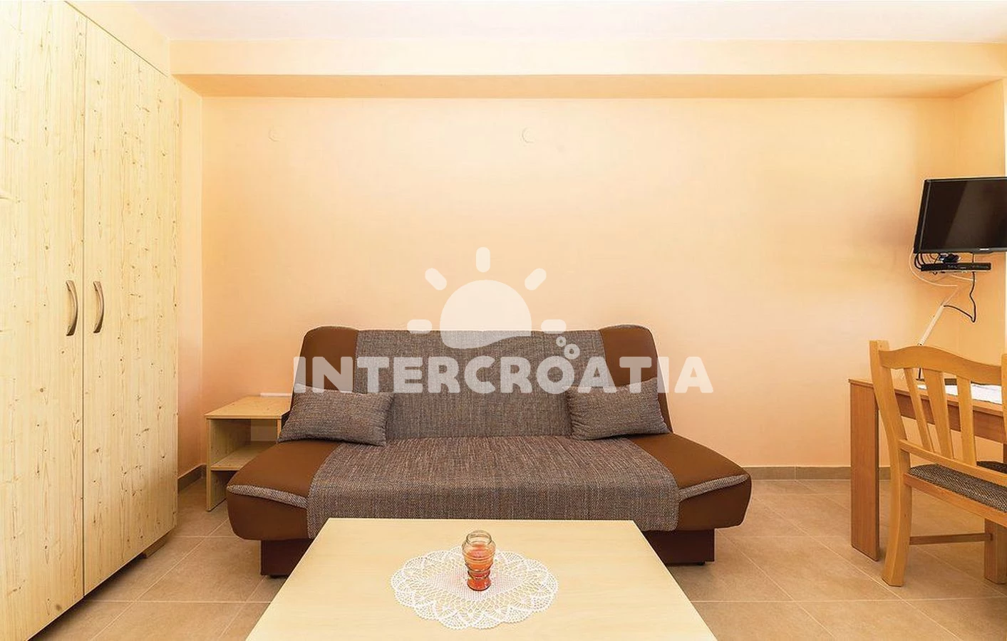 Apartmán typu studio (29 m2) s balkonem, a výhledem na moře. Nachází se v 1. patře objektu. Kuchyňská linka je vybavena varnou deskou, nádobím, lednicí, mrazákem. K dispozici dvoulůžko, televize se satelitním programem. Koupelna se sprchovým koutem, umyvadlem, WC.