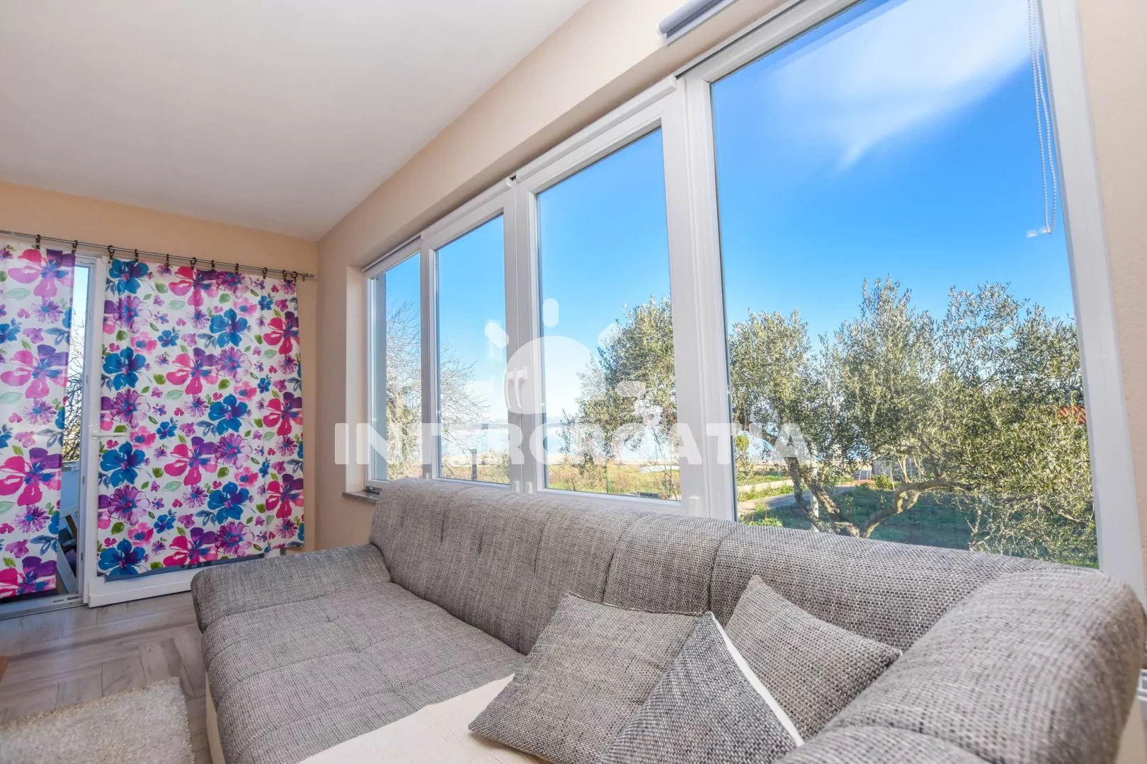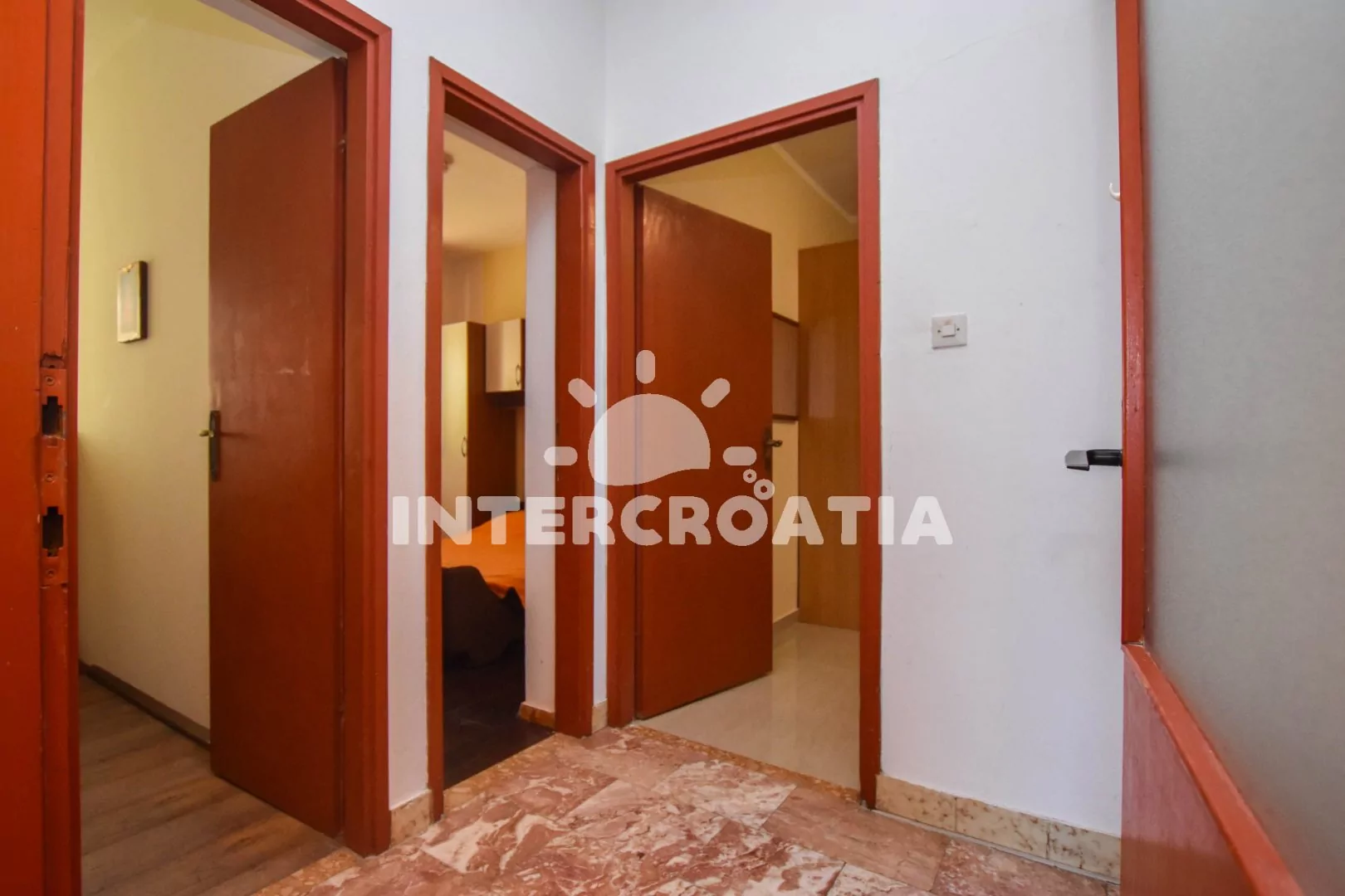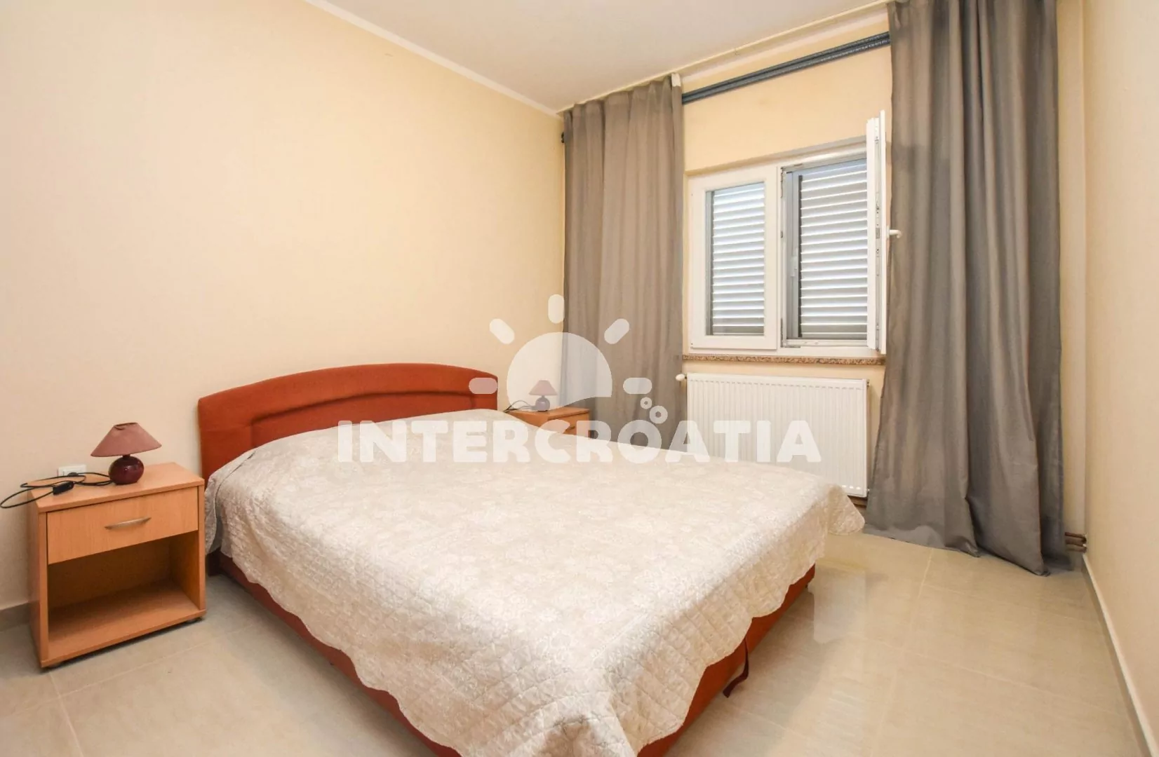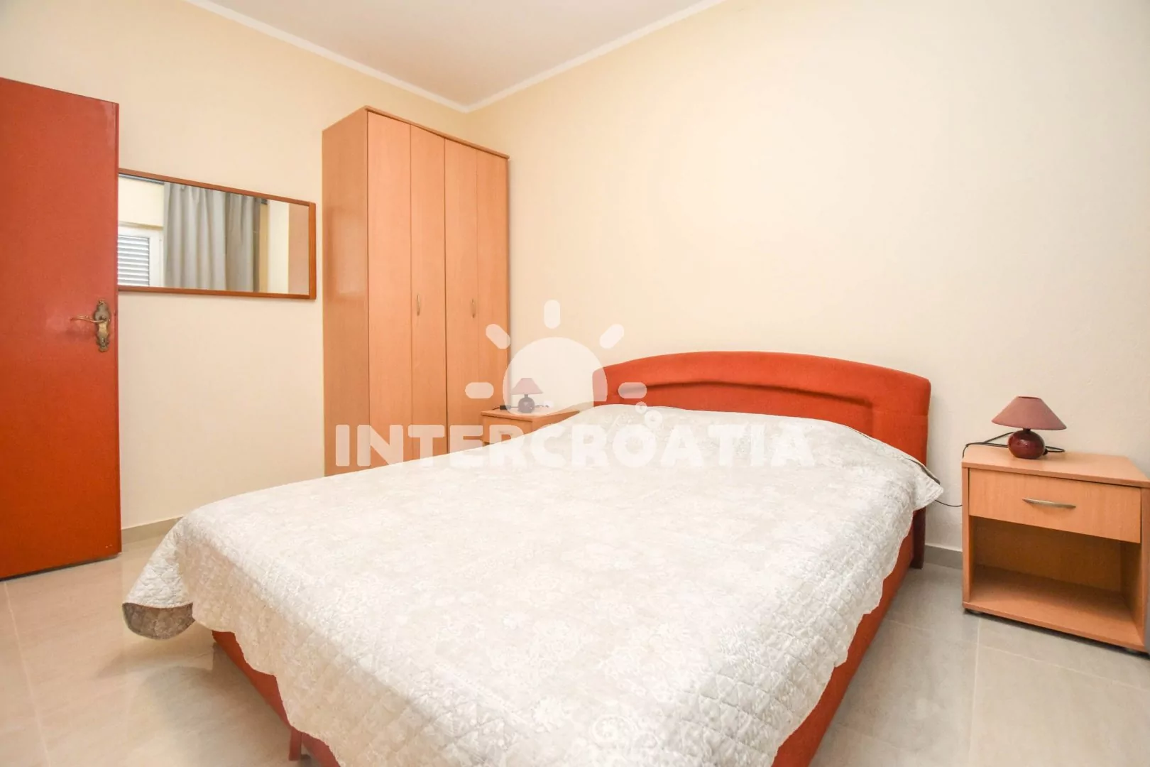 Apartmán (100 m2) s terasou a venkovním posezením se nachází v přízemí domu. Apartmán má 3 ložnice a je vhodný pro až 6 sob. Obývací pokoj je spojený s kuchyní. Kuchyňská linka je vybavena dvouplotýnkovým vařičem, digestoří, vestavěnou troubou, rychlovarnou konvicí, nádobím a lednicí s mrazákem. Obývací pokoj s jídelním stolem pro 6 osob, rohovou pohovkou, televizí se satelitním programem, klimatizací a vstupem na terasu. První ložnice s dvoulůžkem. Druhá ložnice s dvoulůžkem. Třetí ložnice s patrovou postelí (lůžka pro 2 osoby). Koupelna se sprchovým koutem, umyvadlem a wc. Hostům je k dispozici parkování u objektu zdarma.