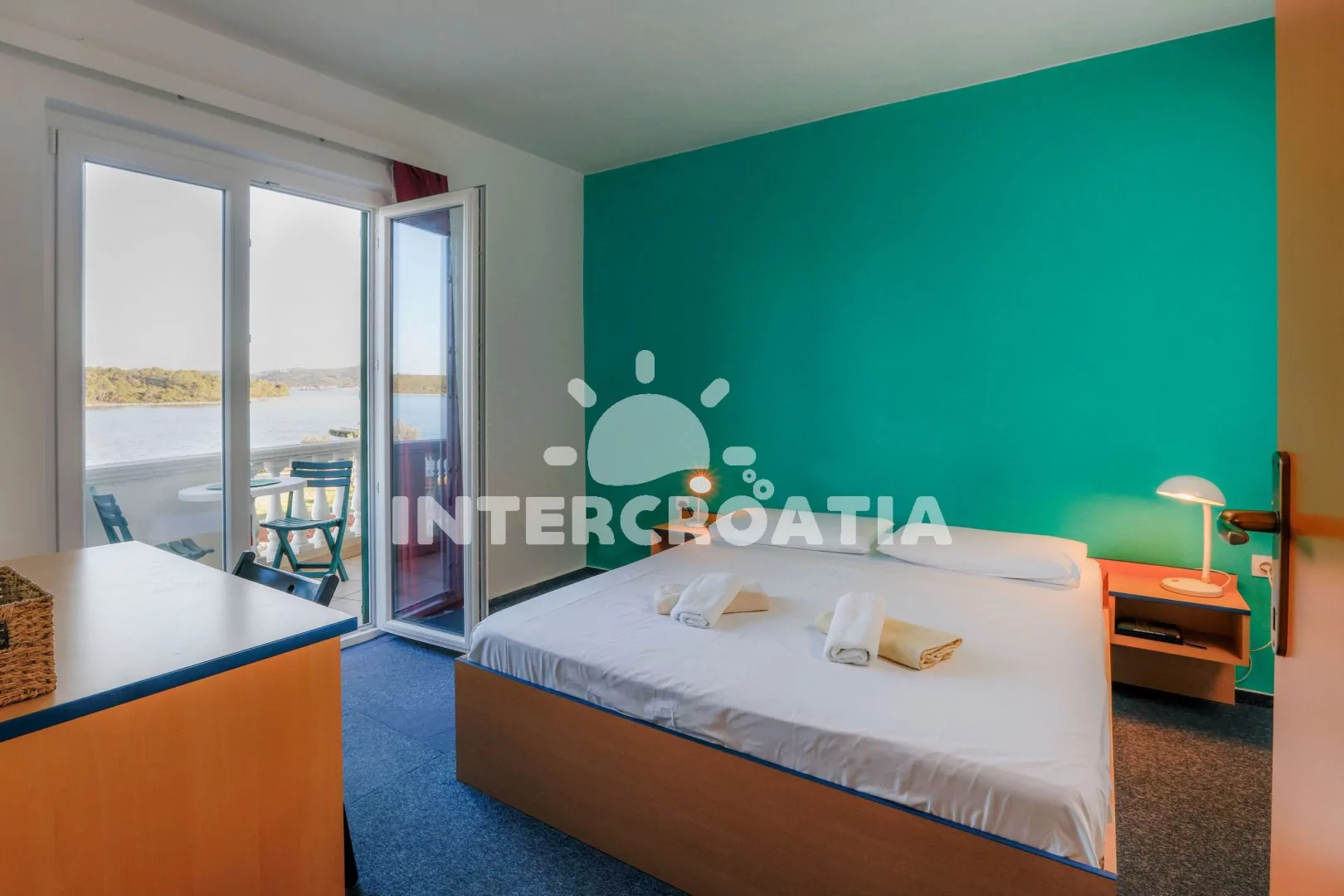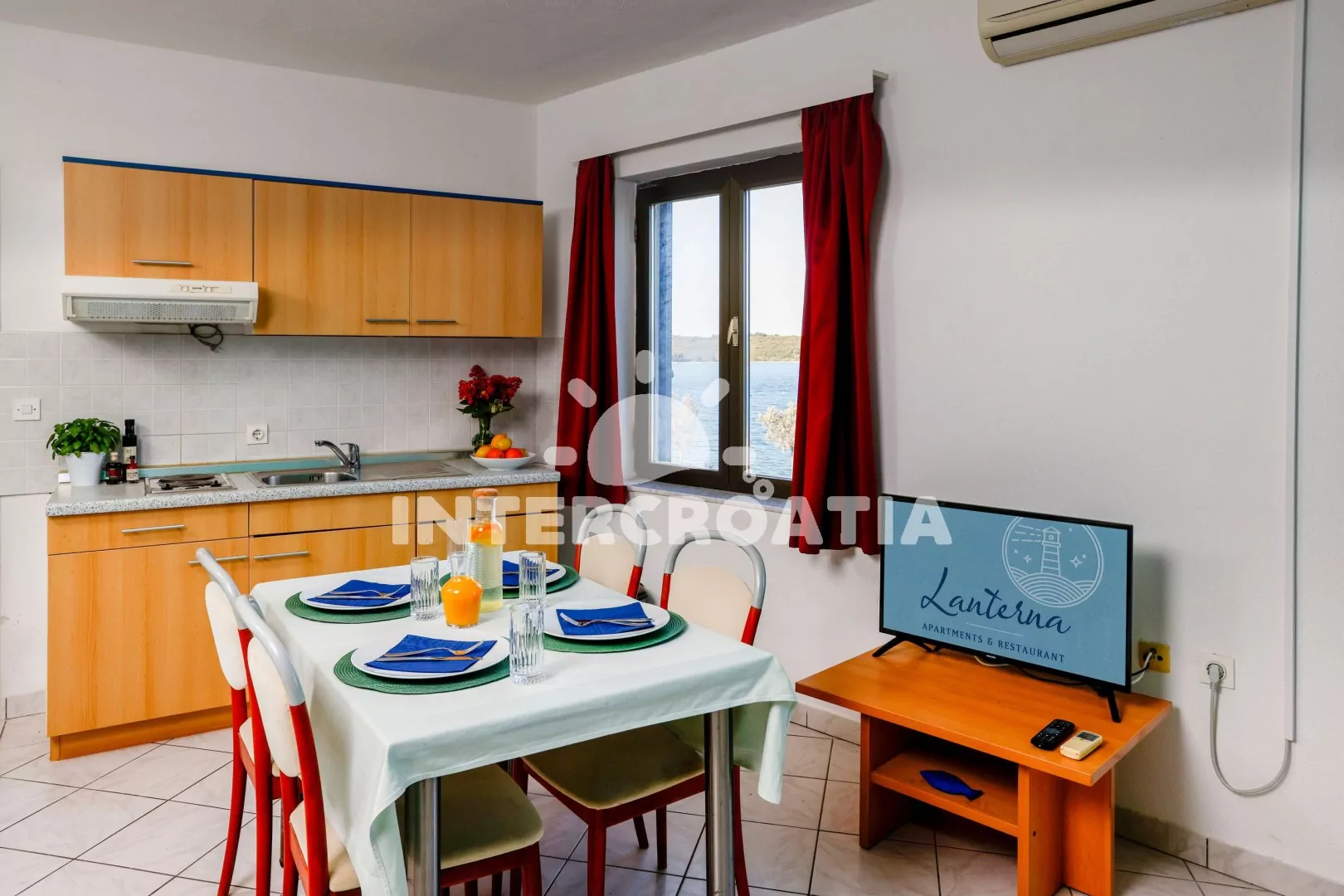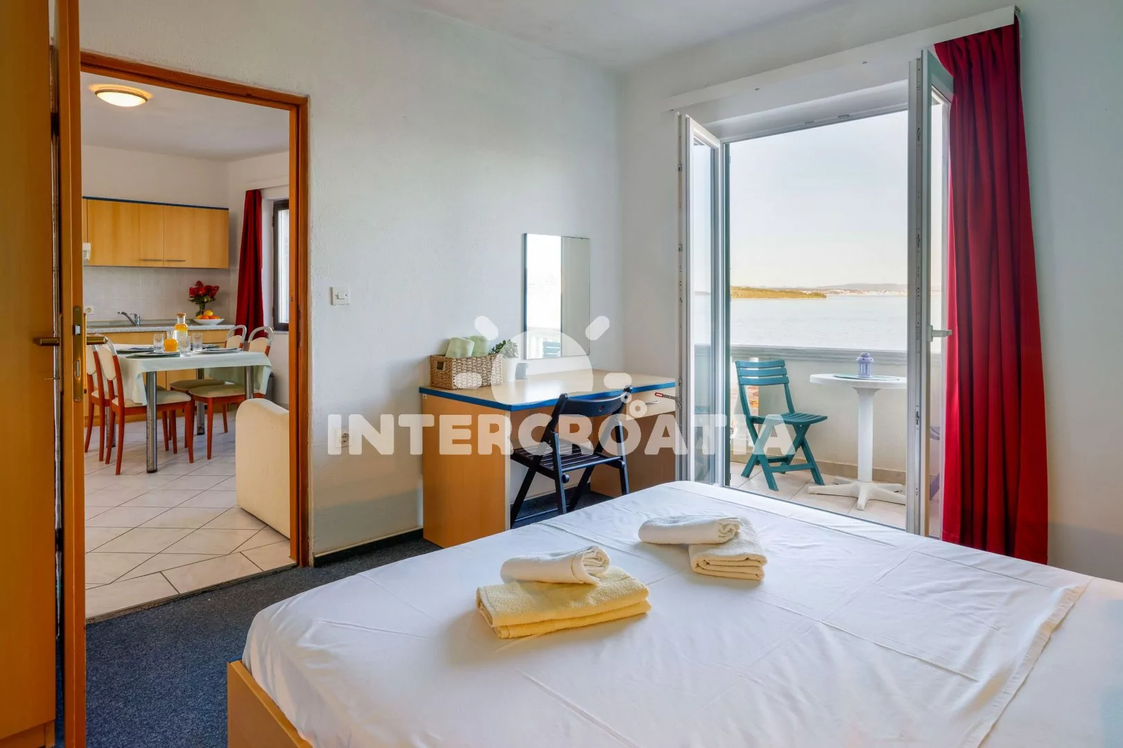 Apartmán (25 m2) s balkonem, posezením a výhledem na moře. Apartmán má 1 ložnici a je vhodný pro 2 až 3 osoby. Obývací pokoj je spojený s kuchyní. Kuchyňská linka je vybavena dvouplotýnkovým vařičem, digestoří, rychlovarnou konvicí, nádobím a lednicí s mrazákem. Obývací pokoj s jídelním stolem, pohovkou, televizí a klimatizací. Ložnice s dvoulůžkem a vstupem na balkon. Koupelna se sprchovým koutem, umyvadlem a wc. Hostům je k dispozici parkování u objektu zdarma.