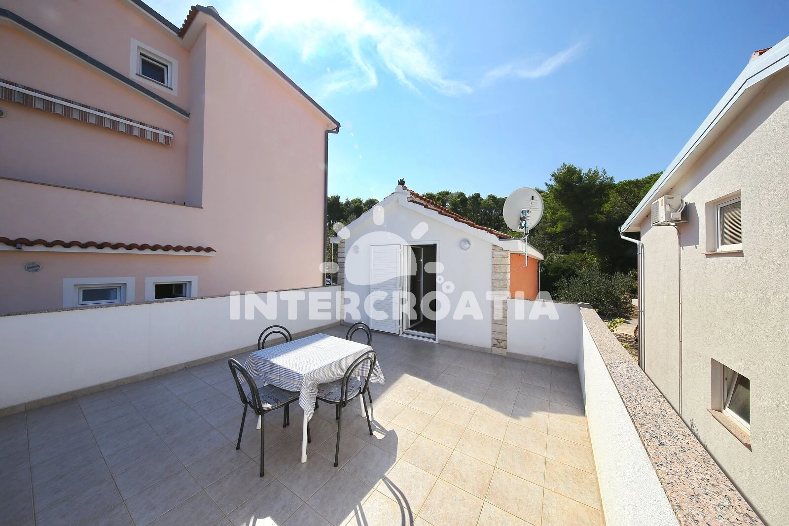 Vzdálenosti: Moře 50 m, pláž 50 m (oblázková a větší kamení), ambulance 500 m, trajekt (Tkon) 500 m, centrum 500 m, lékárna 500 m, bar 500 m, diskotéka 500 m, pošta 500 m, restaurace 500 m, supermarket 500 m, čerpací stanice 4 km, letiště (Zadar) 40 km,