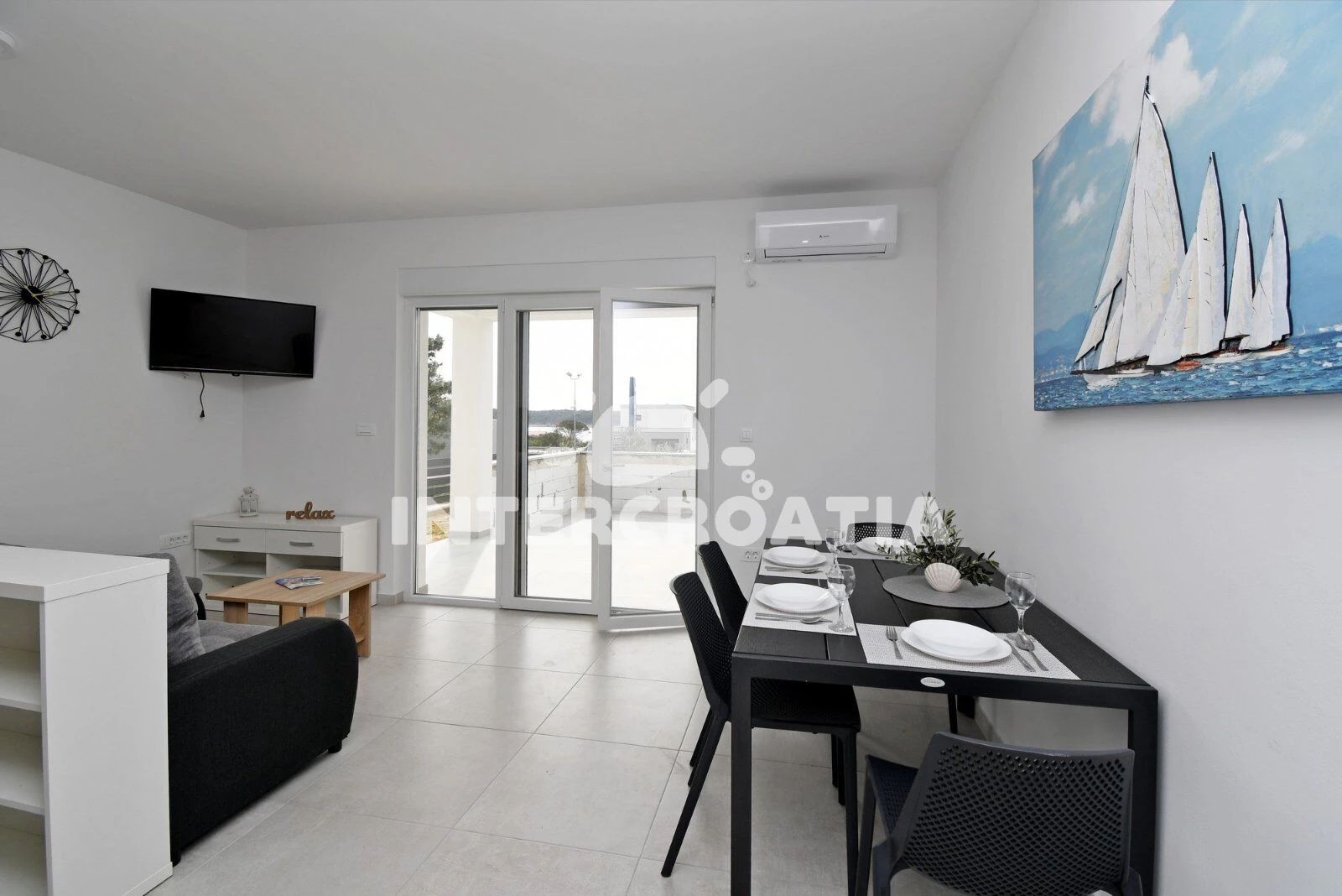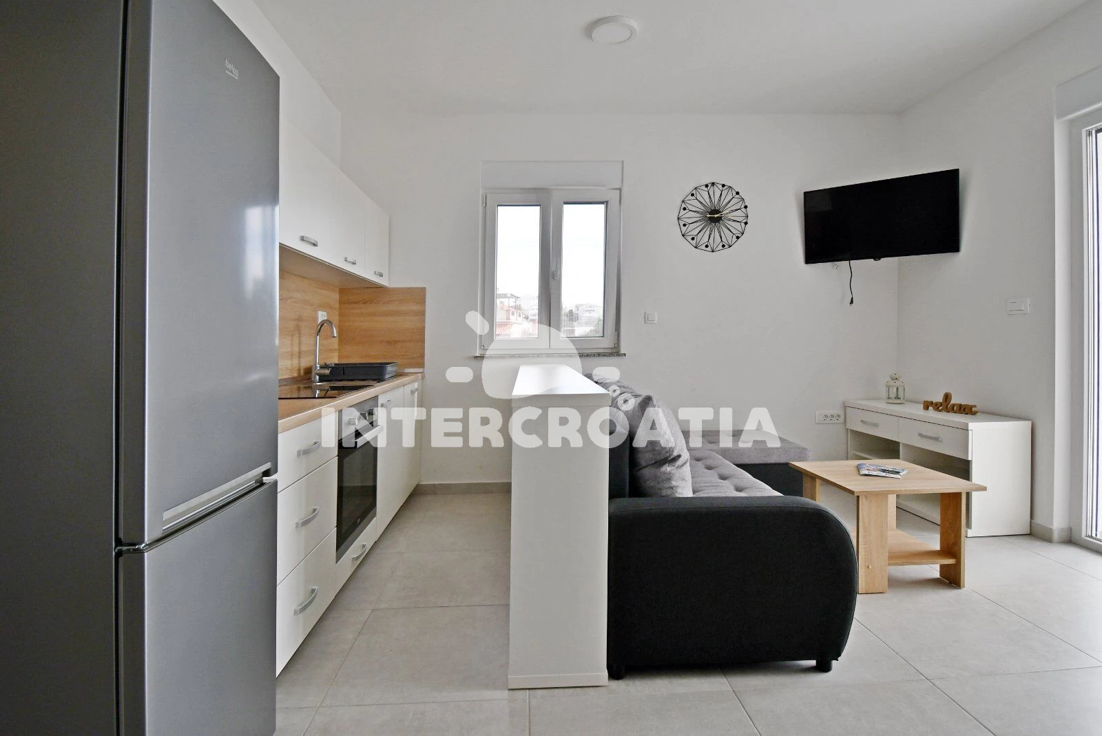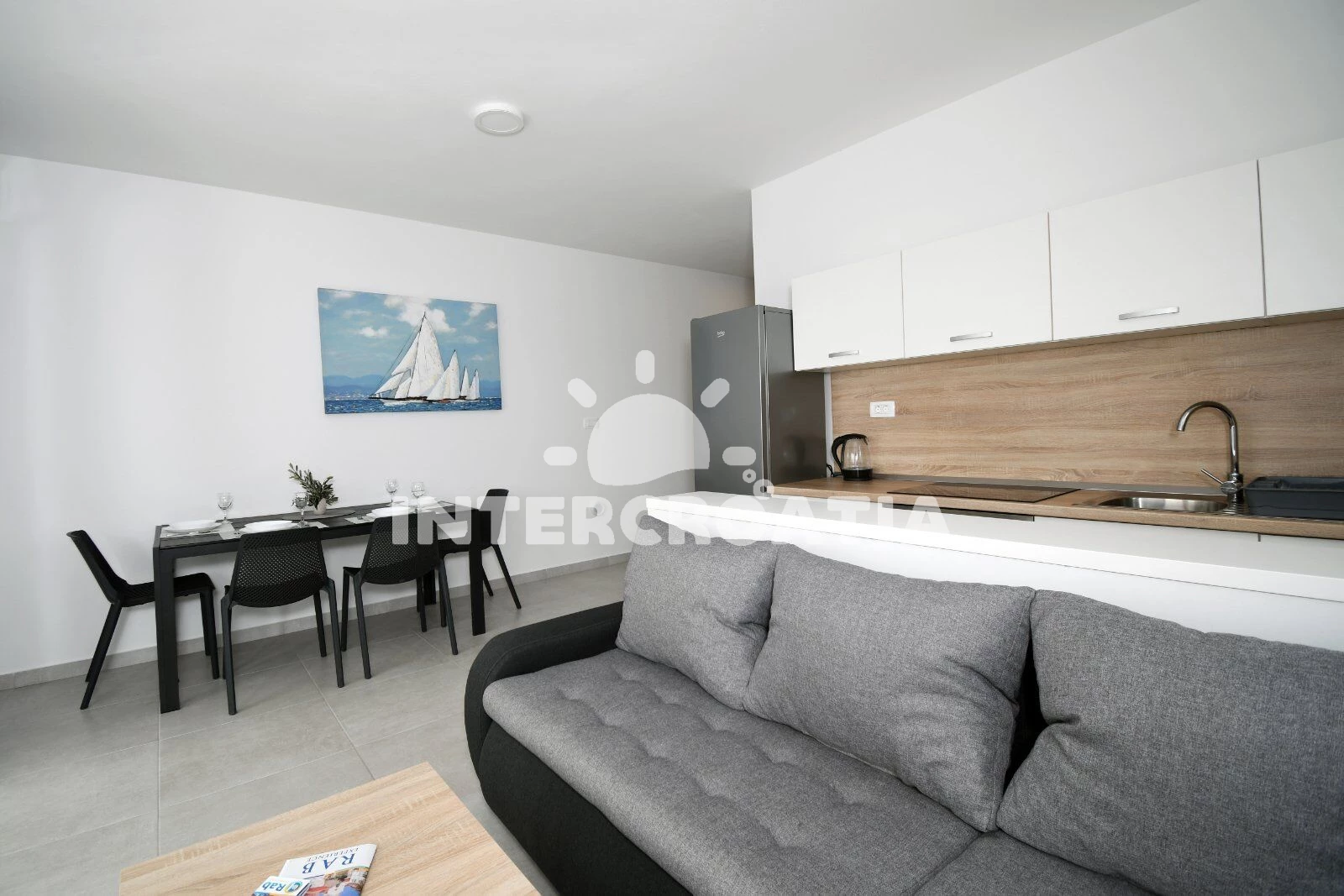 Apartmán se nachází 400 m od moře a pláže. Pláž je oblázková a betonové desky. U objektu je k dispozici společná zahrada s posezením a grilem. Parkování je před domem.