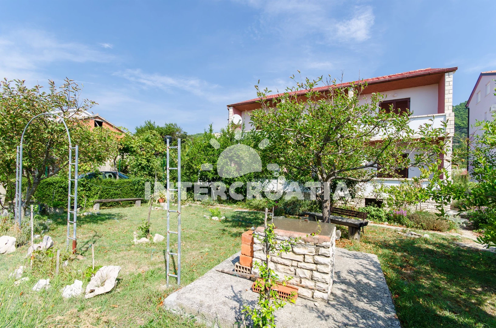 Apartmán se nachází 250 m od moře a pláže. Pláž je oblázková a betonové desky. Apartmán disponuje bazénem s lehátky pro ubytované hosty. U objektu je k dispozici společná zahrada s posezením a grilem. Parkování je před domem.