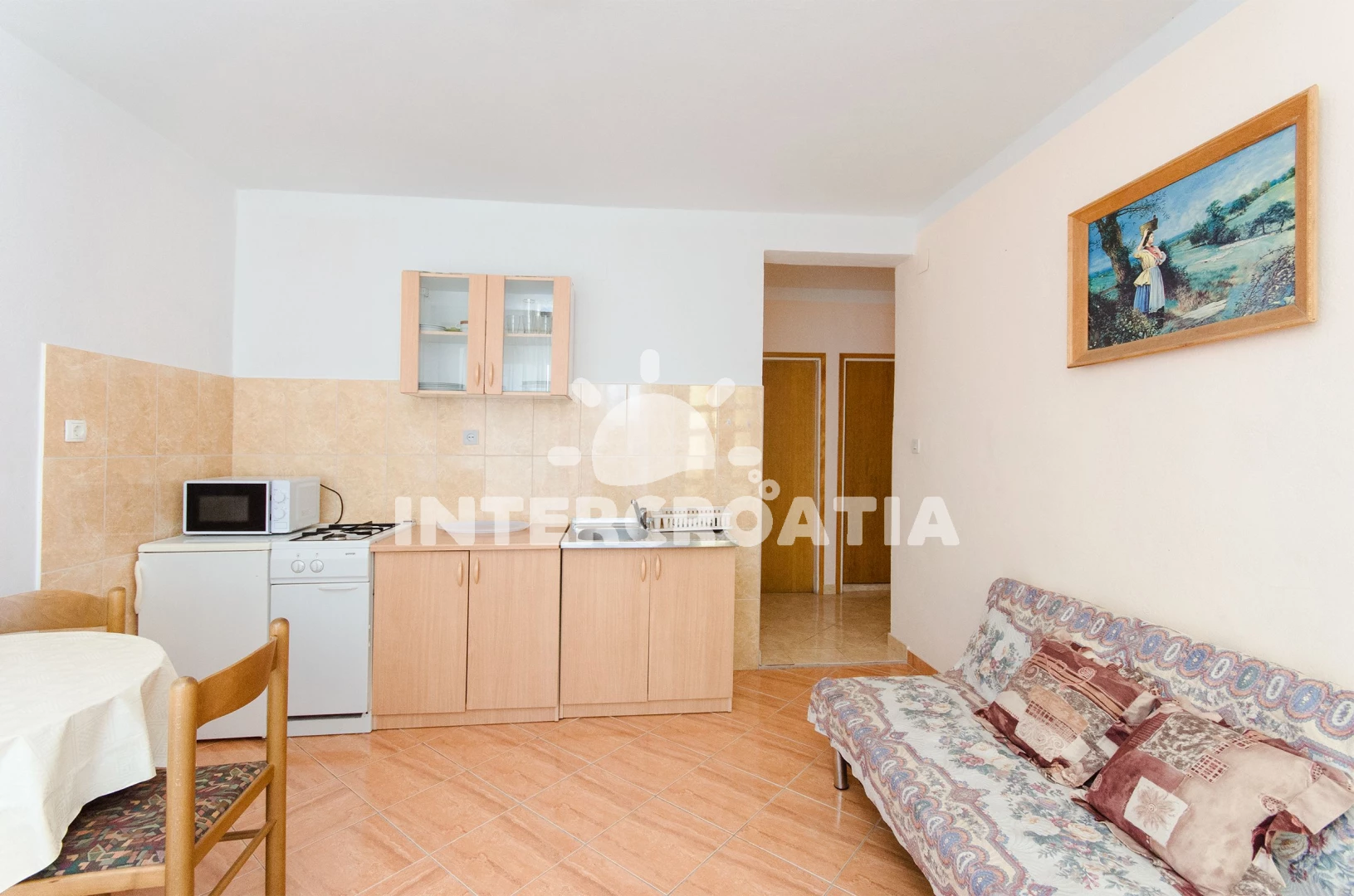 Vzdálenosti: Moře 200 m, pláž 250 m (oblázková a betonové desky), čerpací stanice 100 m, bar 100 m, restaurace 150 m, směnárna 300 m, půjčovna kol 300 m, centrum 300 m, kotviště pro čluny 300 m, půjčovna motorových člunů 300 m, supermarket 500 m, potápění 500 m, tenisové kurty 2 km, mini golf 2 km, ambulance 3 km, lékárna 3 km, banka 3 km, pošta 3 km, muzeum 3 km, diskotéka 3 km, trajekt (Misnjak) 12 km,