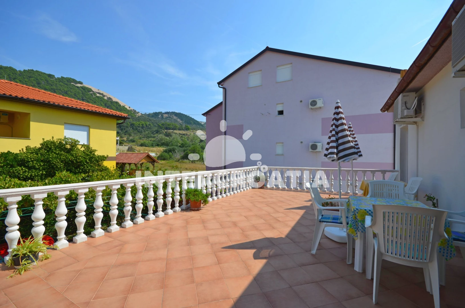 Apartmán se nachází 250 m od moře a pláže. Pláž je oblázková a betonové desky. Apartmán disponuje bazénem s lehátky pro ubytované hosty. U objektu je k dispozici společná zahrada s posezením a grilem. Parkování je před domem.
