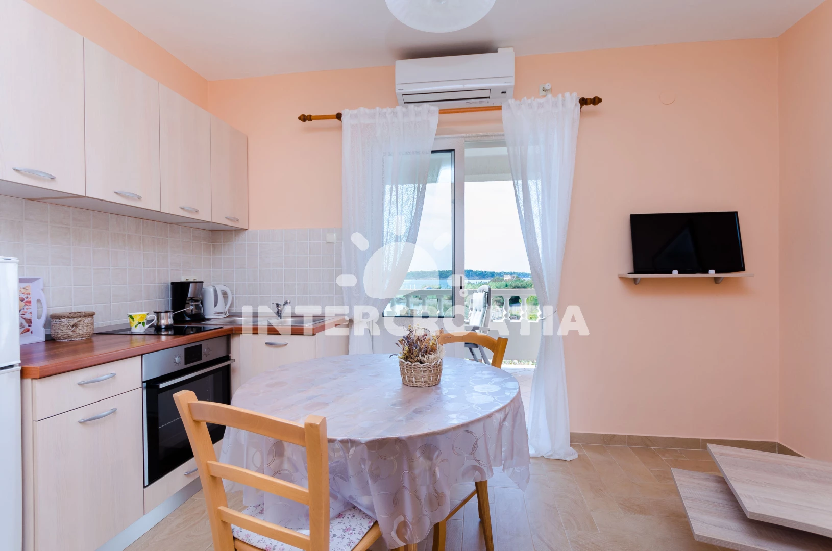 Apartmán (45 m2) s balkonem, a výhledem na moře. Nachází se v 1. patře objektu. Apartmán má 1 ložnici a je vhodný pro až 3 osoby. Kuchyňská linka je vybavena varnou deskou, troubou, kávovarem,… Více informací