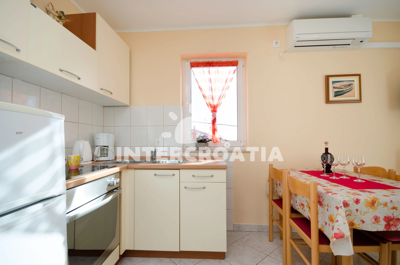 Apartmán (55 m2) s terasou, a výhledem na moře. Nachází se ve 2. patře objektu. Apartmán má 2 ložnice a je vhodný pro až 4 osoby. Kuchyňská linka je vybavena varnou deskou, troubou, kávovarem,…