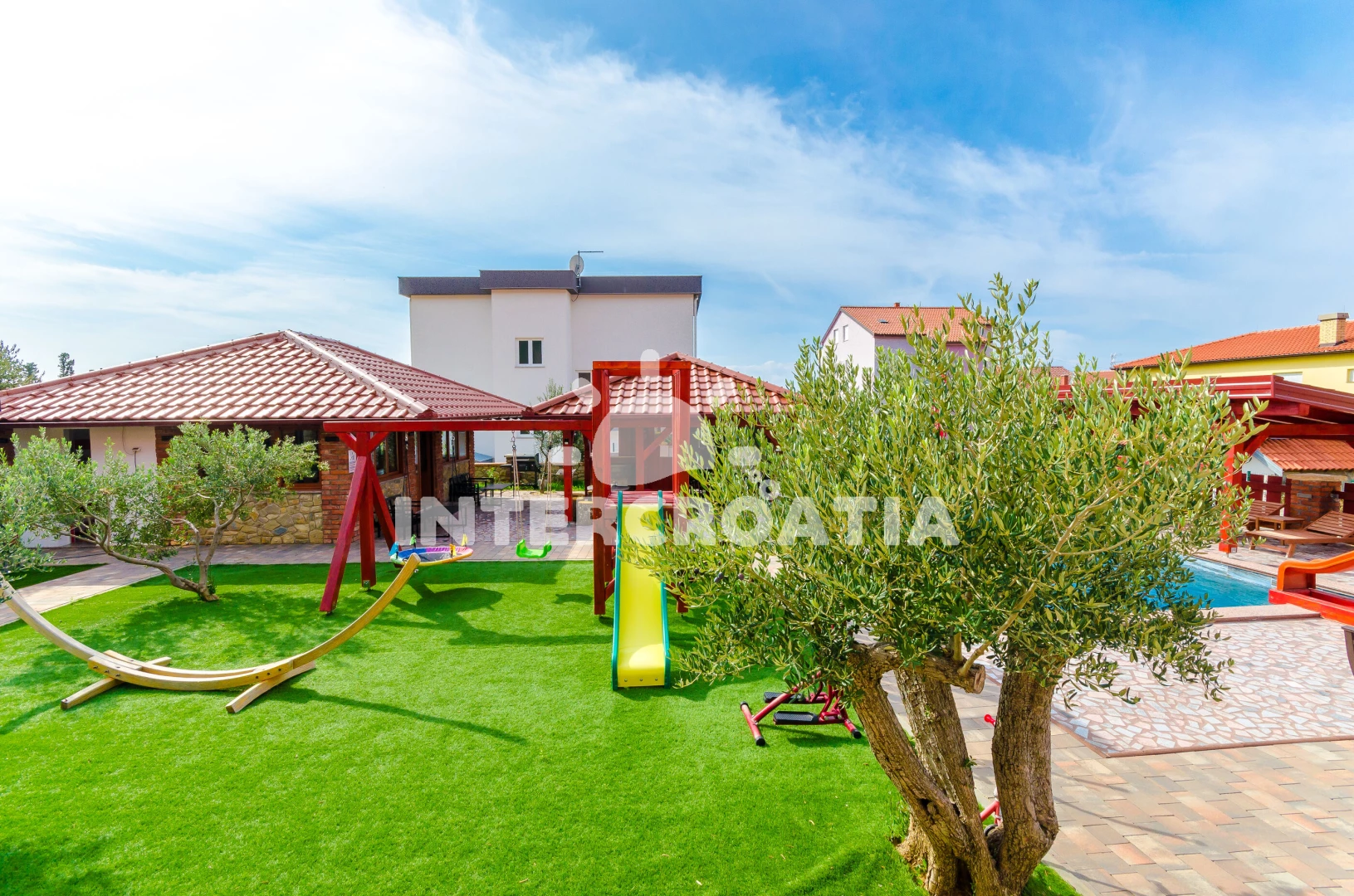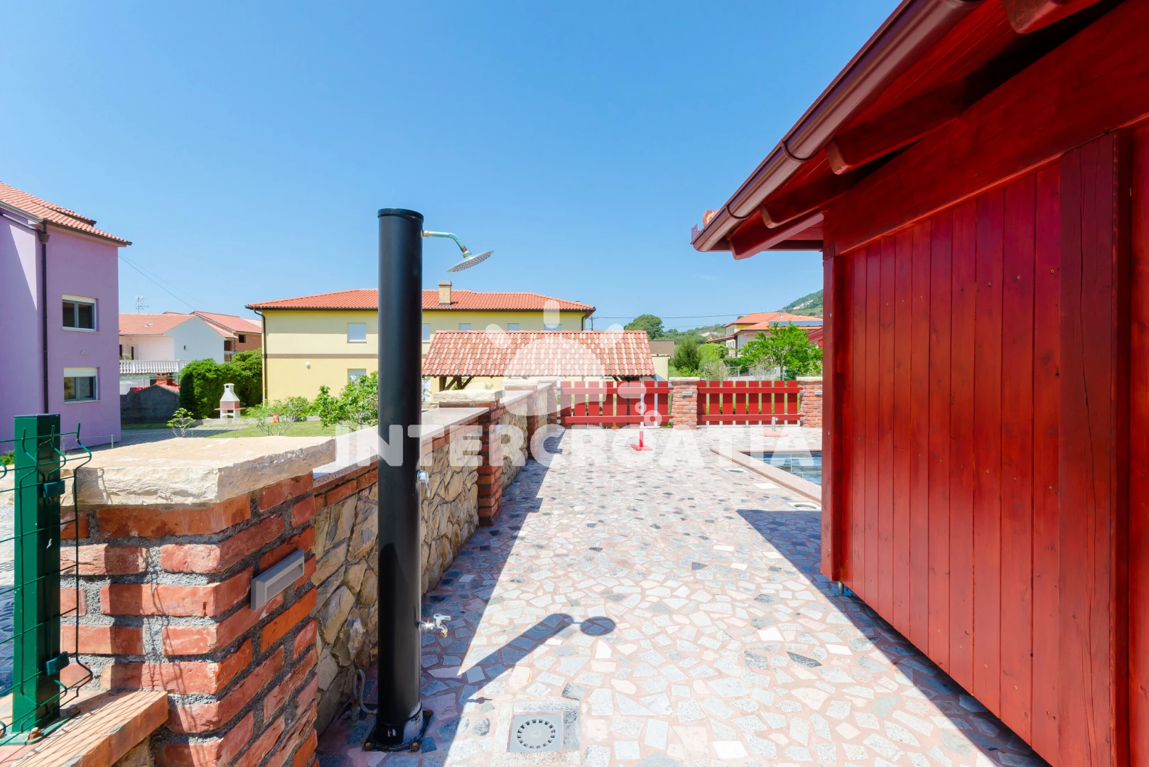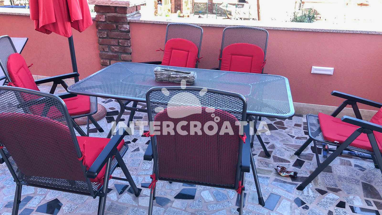 Apartmán se nachází 400 m od moře a pláže. Pláž je oblázková a betonové desky. Apartmán disponuje bazénem s lehátky pro ubytované hosty. U objektu je k dispozici společná zahrada s posezením a grilem. Parkování je před domem.