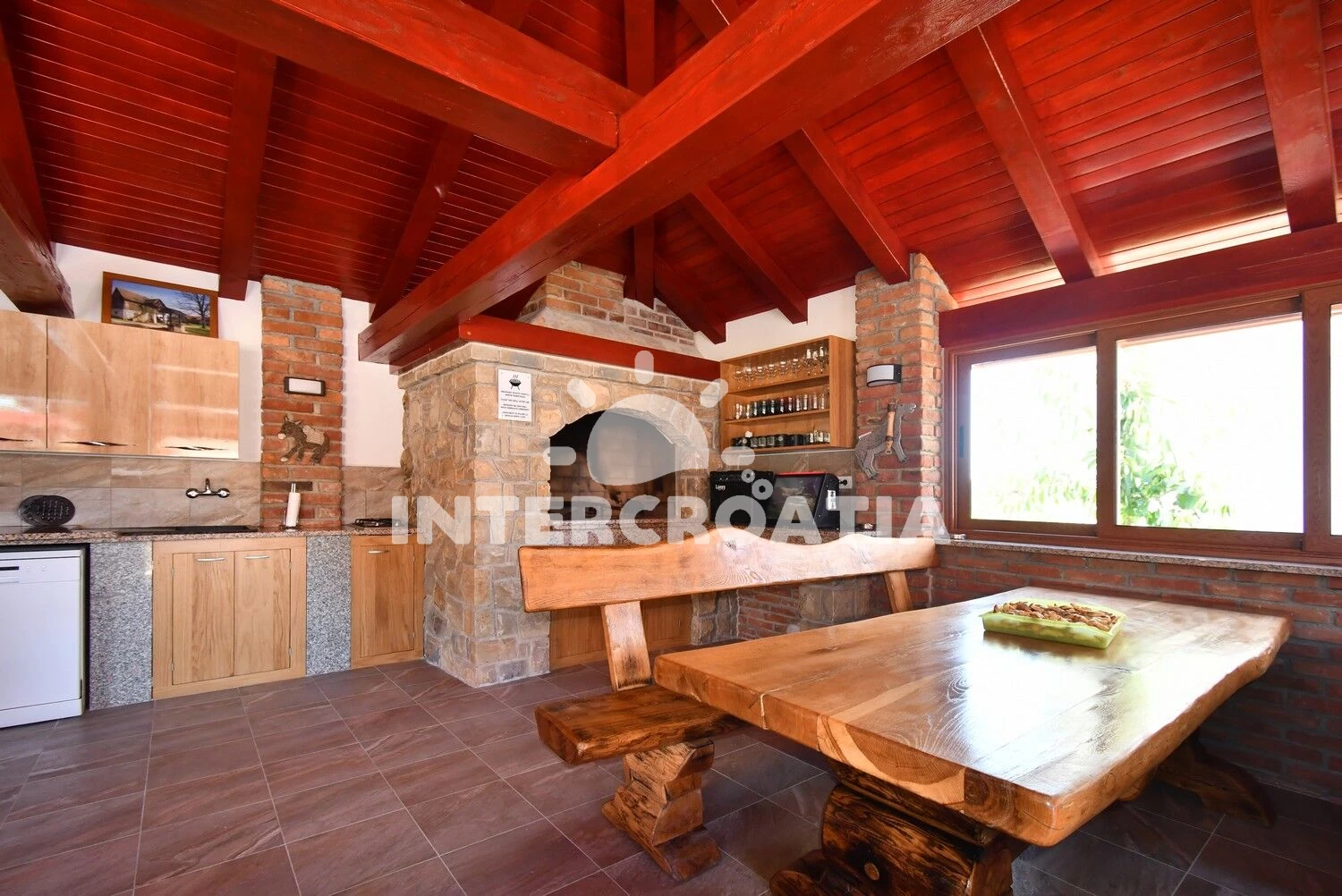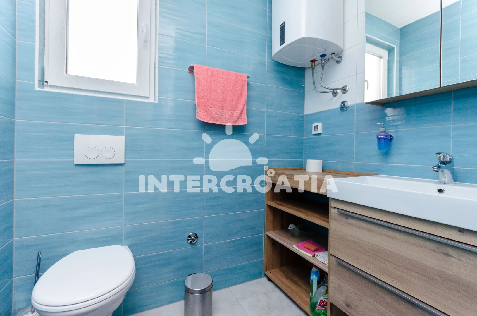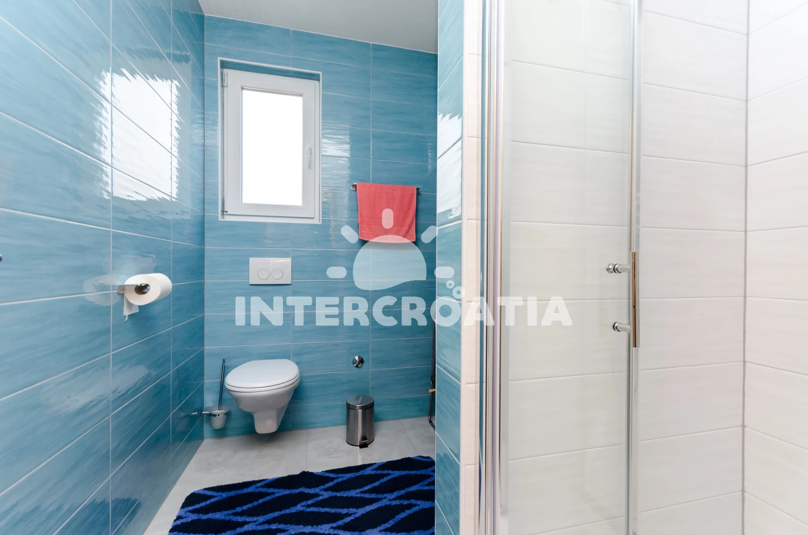 Apartmán se nachází 400 m od moře a pláže. Pláž je oblázková a betonové desky. Apartmán disponuje bazénem s lehátky pro ubytované hosty. U objektu je k dispozici společná zahrada s posezením a grilem. Parkování je před domem.