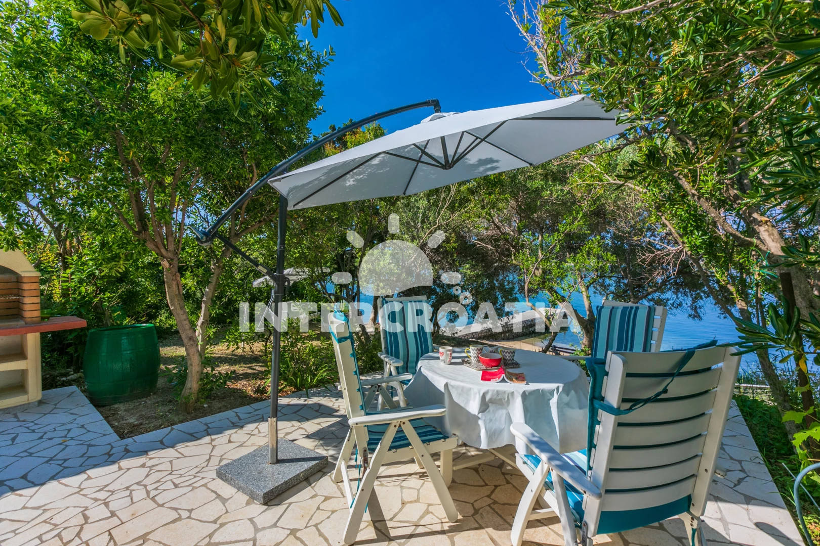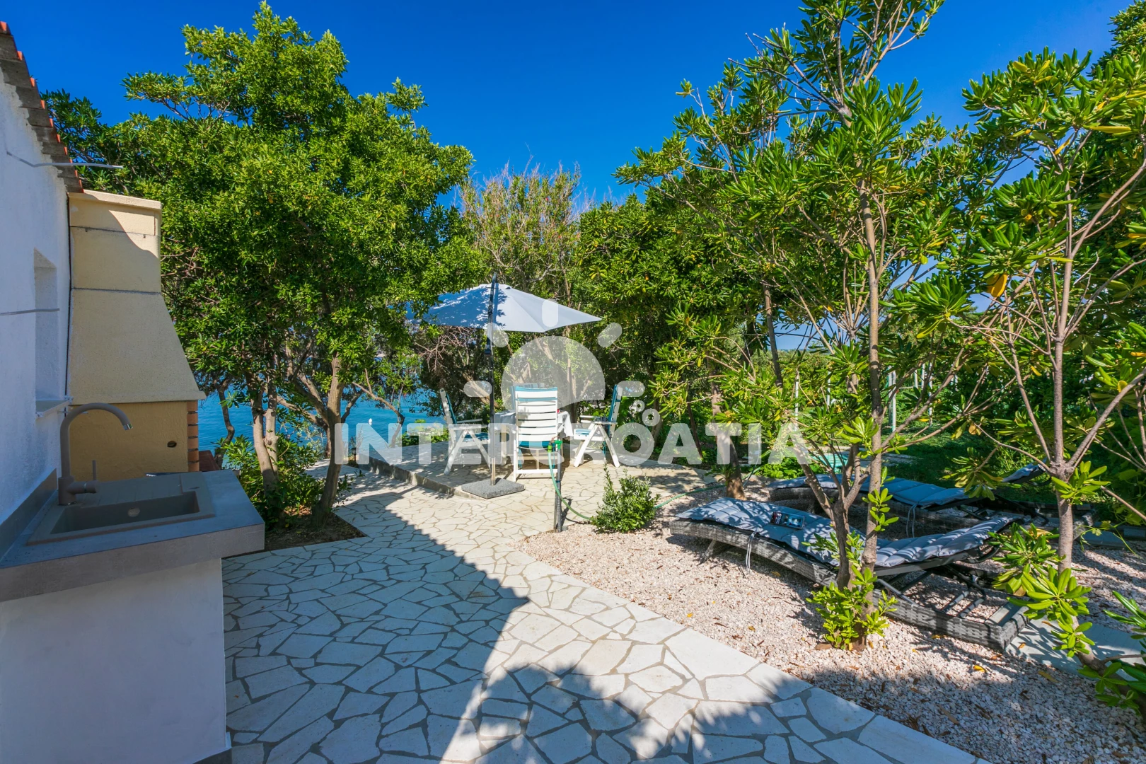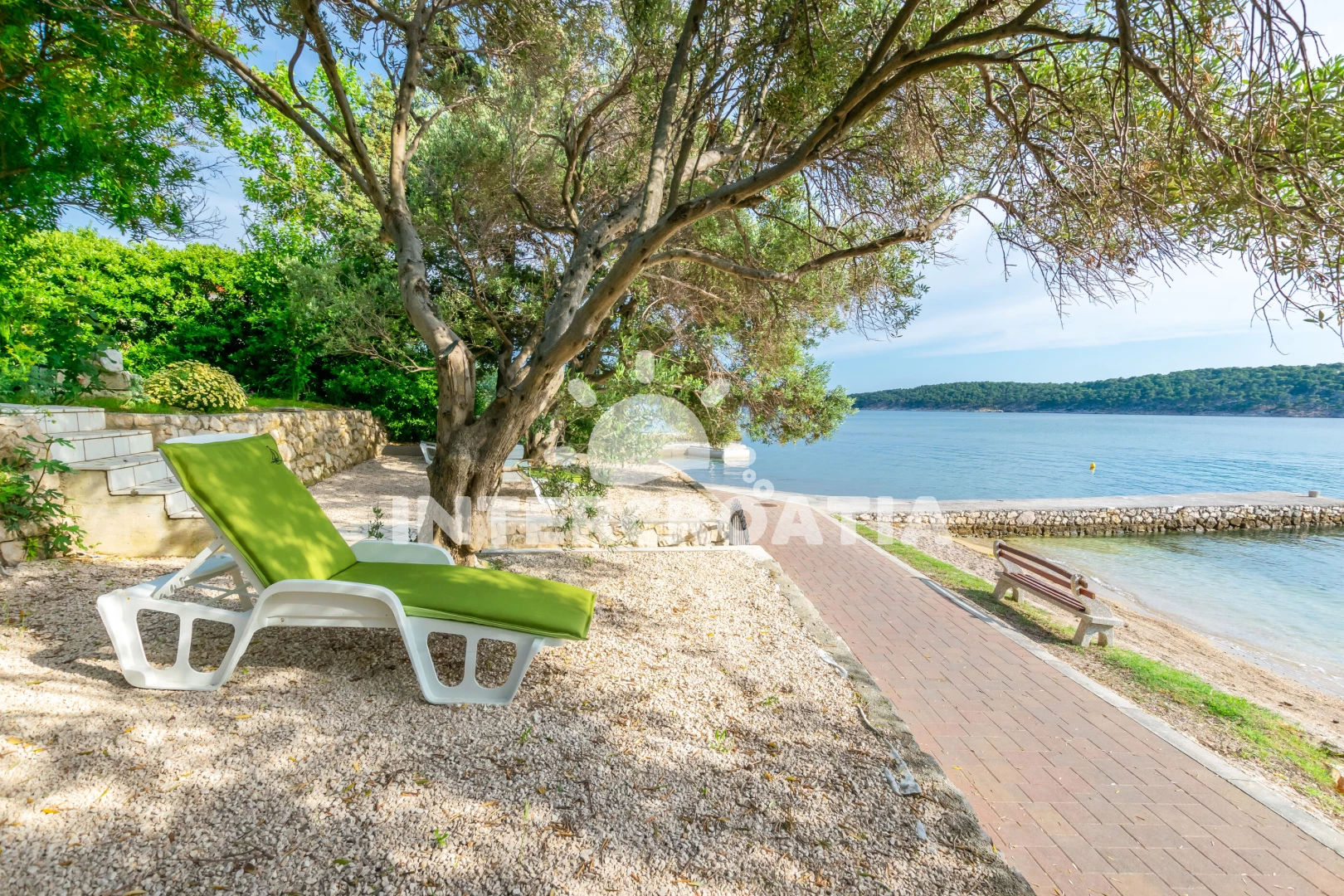 Apartmán se nachází 30 m od moře a pláže. Pláž je písčitá a betonové desky. Apartmán disponuje bazénem s lehátky pro ubytované hosty. U objektu je k dispozici společná zahrada s posezením a grilem. Parkování je před domem.