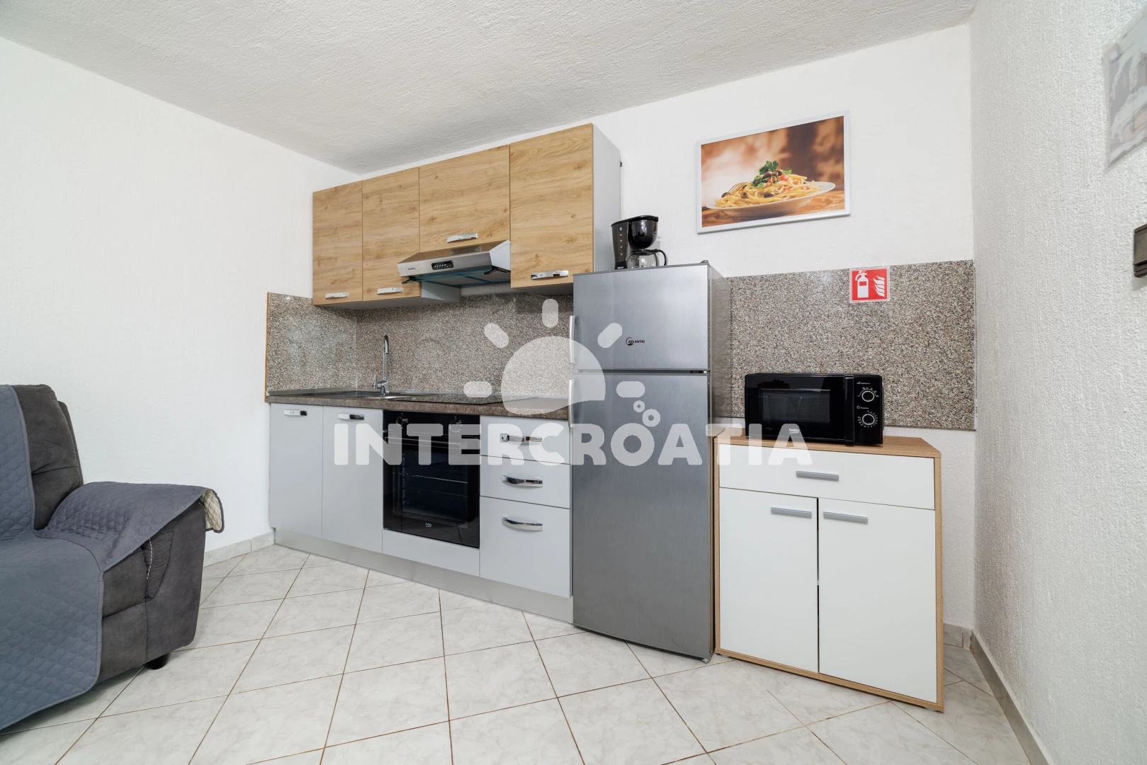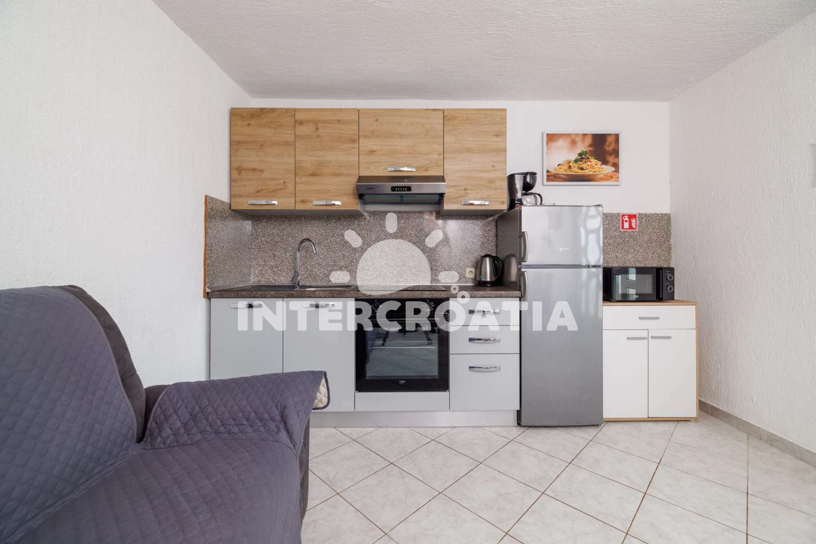 Apartmán (40 m2) s terasou, s balkonem, a výhledem na moře. Nachází se ve 2. patře objektu. Apartmán má 1 ložnici a je vhodný pro až 3 osoby. Kuchyňská linka je vybavena varnou deskou, kávovarem, troubou, mikrovlnnou troubou, lednicí, mrazákem. V obývací místnosti je rozložitelná pohovka (extra lůžko pro 1 osobu). K dispozici televize. Ložnice s dvoulůžkem. Koupelna se sprchovým koutem, umyvadlem, WC.