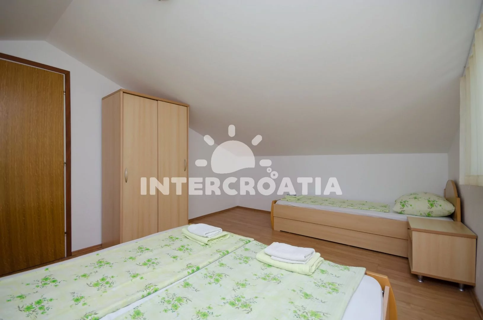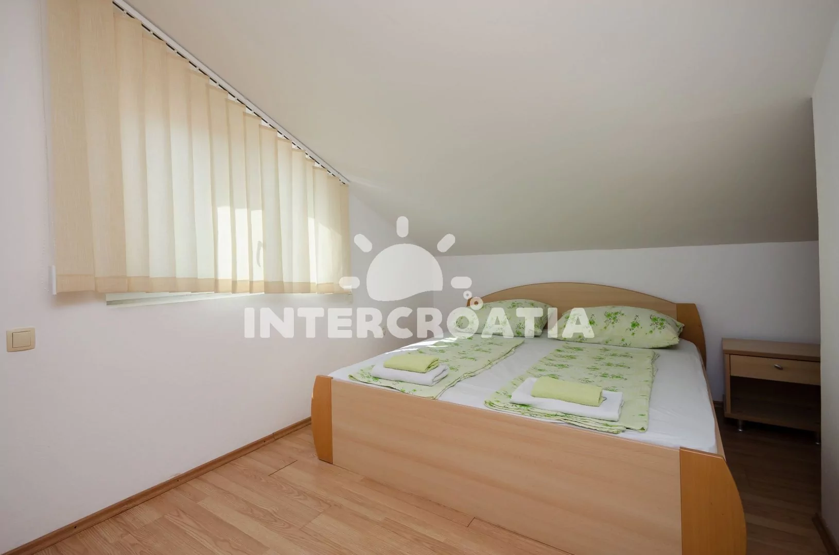Prostorný apartmán (110 m2) na dvou etážích s venkovním posezením na terase. Obývací pokoj je částečně oddělený od kuchyně. Kuchyňská linka s elektrickým dvouplotýnkovým sporákem, digestoří, mikrovlnnou troubou, rychlovarnou konvicí, kávovarem, nádobím a lednicí s mrazákem, dále jídelní stůl pro 8 osob a vstup na terasu. Obývací pokoj se sedací soupravou, televizí se satelitním programem a schody do druhého patra. První i druhá ložnice je vybavena vždy s jedním dvoulůžkem a jedním jednolůžkem. Třetí ložnice s jedním dvoulůžkem. Dvě koupelny se sprchovým koutem, umyvadlem a wc. Hostům je k dispozici parkování u objektu zdarma.