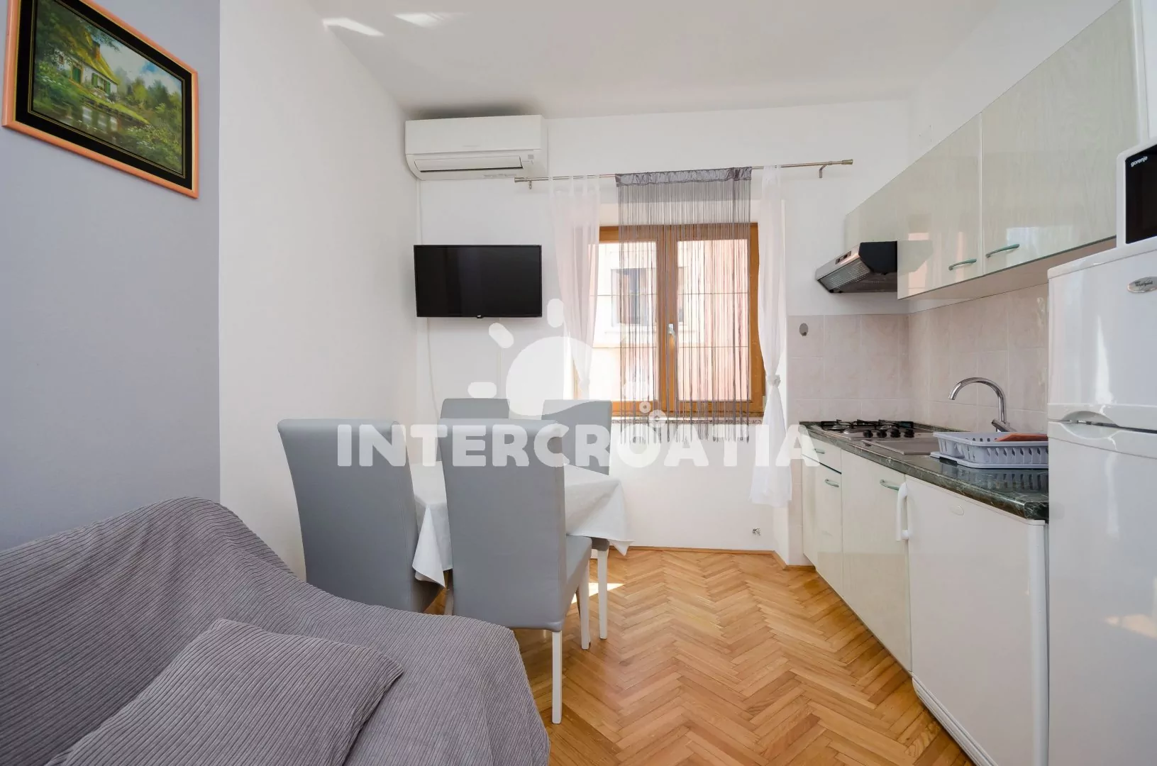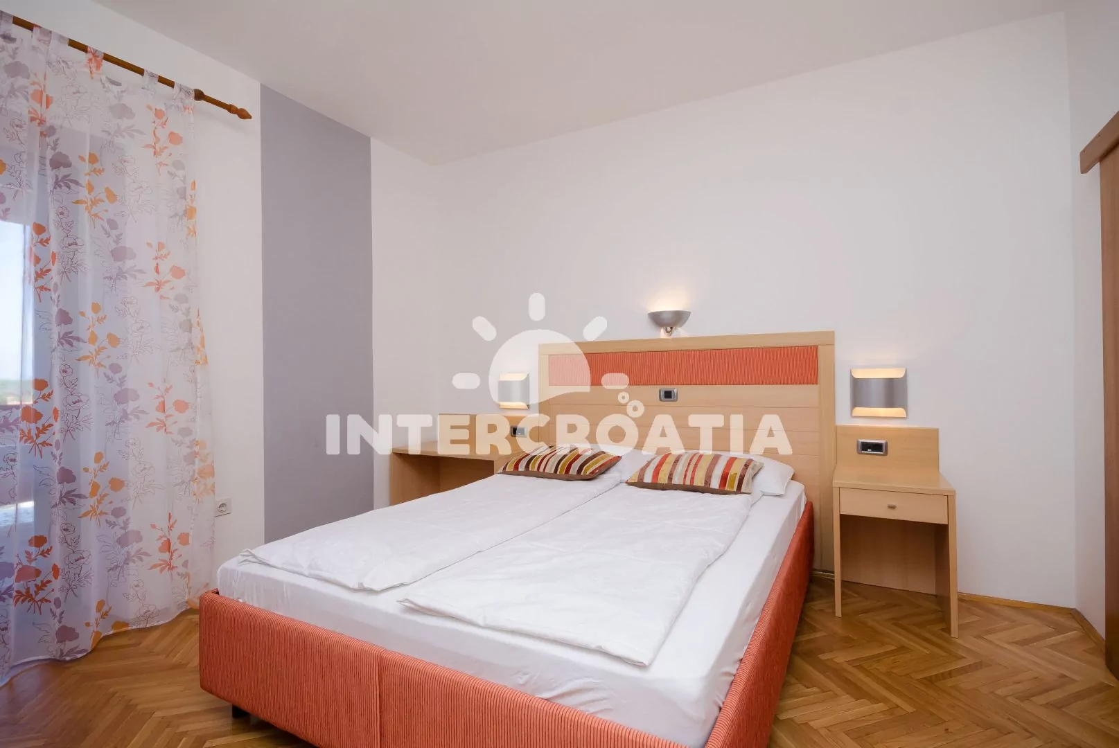 Apartmán (45 m2) s terasou a výhledem na moře se nachází v 1. patře domu a je vhodný pro 2 až 4 osoby. Obývací pokoj je spojený s kuchyní. Kuchyňská linka je vybavena varnou deskou, digestoří, mikrovlnnou troubou, rychlovarnou konvicí, kávovarem, nádobím a lednicí s mrazákem. Obývací pokoj s jídelním stolem pro 4 osoby, pohovkou (rozložitelná na extra lůžko pro 2 osoby), televizí se satelitním programem a klimatizací. Ložnice s dvoulůžkem a vstupem na terasu. Koupelna se sprchovým koutem, umyvadlem, fénem a wc. Hostům je k dispozici parkování u objektu zdarma.