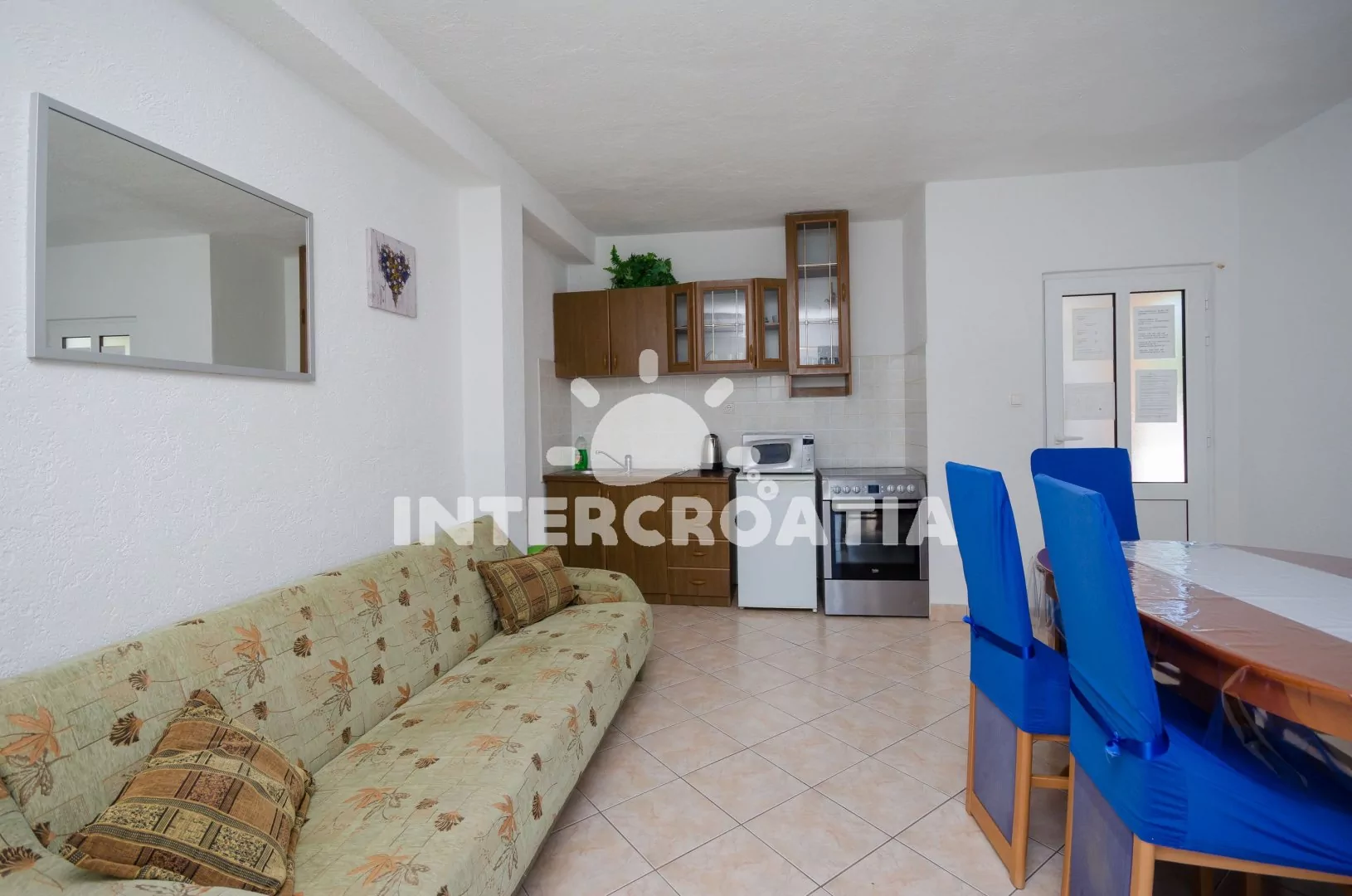 Samostatně stojící apartmánový dům v klidné lokalitě s dobrou dostupností k písečné pláži a moři. Kolem domu zahrádka s terasou a zděným grilem. Apartmány s lodžiemi a posezením. Parkovací místa u domu.