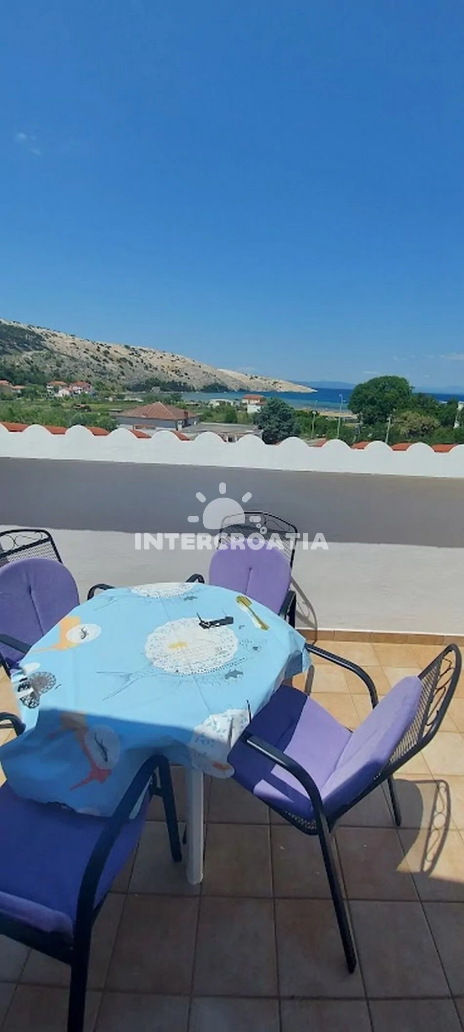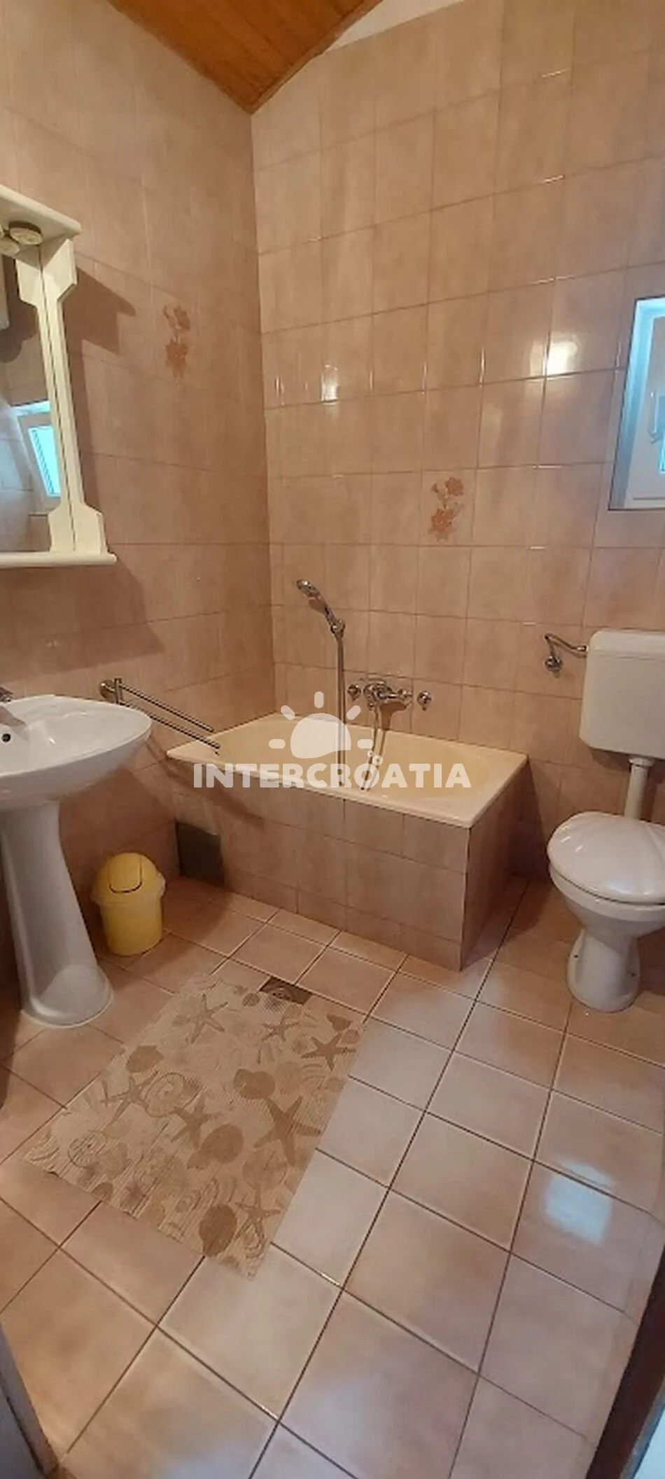 Podkrovní apartmán (75 m2) s balkonem, posezením a výhledem na moře. Apartmán má 2 ložnice a je vhodný pro 4 až 5 osob. Obývací místnost je spojena s kuchyní. Kuchyňská linka je vybavena sporákem s troubou, rychlovarnou konvicí, mikrovlnnou troubou, kávovarem, nádobím a lednicí s mrazákem. Obývací místnost s jídelním stolem pro 6 osob a televizí. Chodba s klimatizací a vstupy do ložnic. První ložnice s dvoulůžkem a přistýlkou. Druhá ložnice s dvoulůžkem. Koupelna s vanou, umyvadlem a wc. Hostům je k dispozici parkování u objektu zdarma.