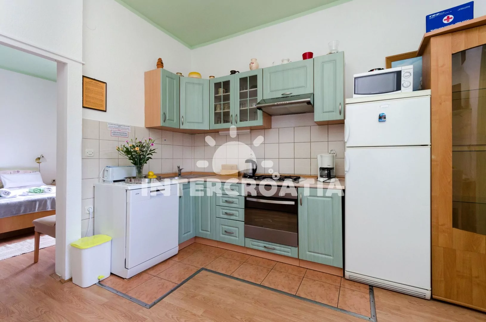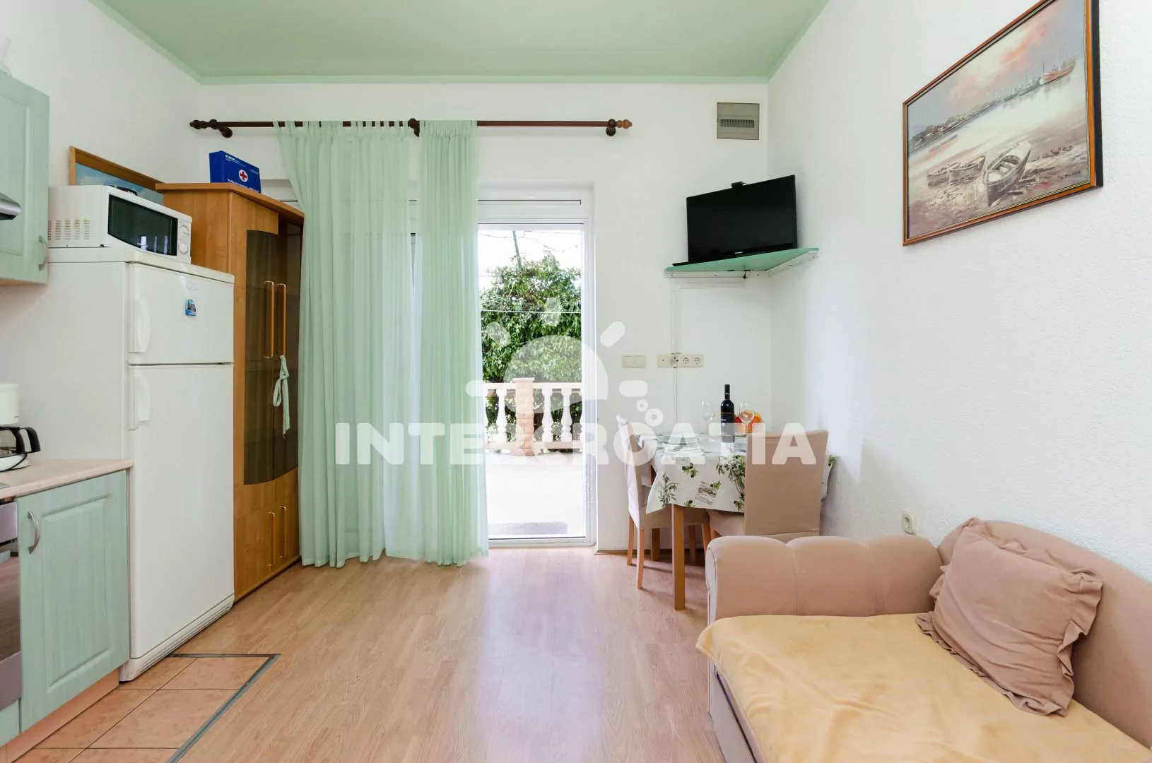 Apartmán (30 m2) s terasou a venkovním posezením se nachází v přízemí domu. Apartmán má 1 ložnici a je vhodný pro 2 osoby. Obývací pokoj je spojený s kuchyní. Kuchyňská linka je vybavena varnou deskou, digestoří, vestavěnou troubou, myčkou na nádobí, mikrovlnnou troubou, rychlovarnou konvicí, kávovarem, toustovačem, nádobím a lednicí s mrazákem. Obývací pokoj s jídelním stolem, pohovkou, televizí se satelitním programem, klimatizací a vstupem na terasu. Ložnice s jedním dvoulůžkem. Koupelna se sprchovým koutem, umyvadlem a wc. Hostům je k dispozici parkování u objektu zdarma.