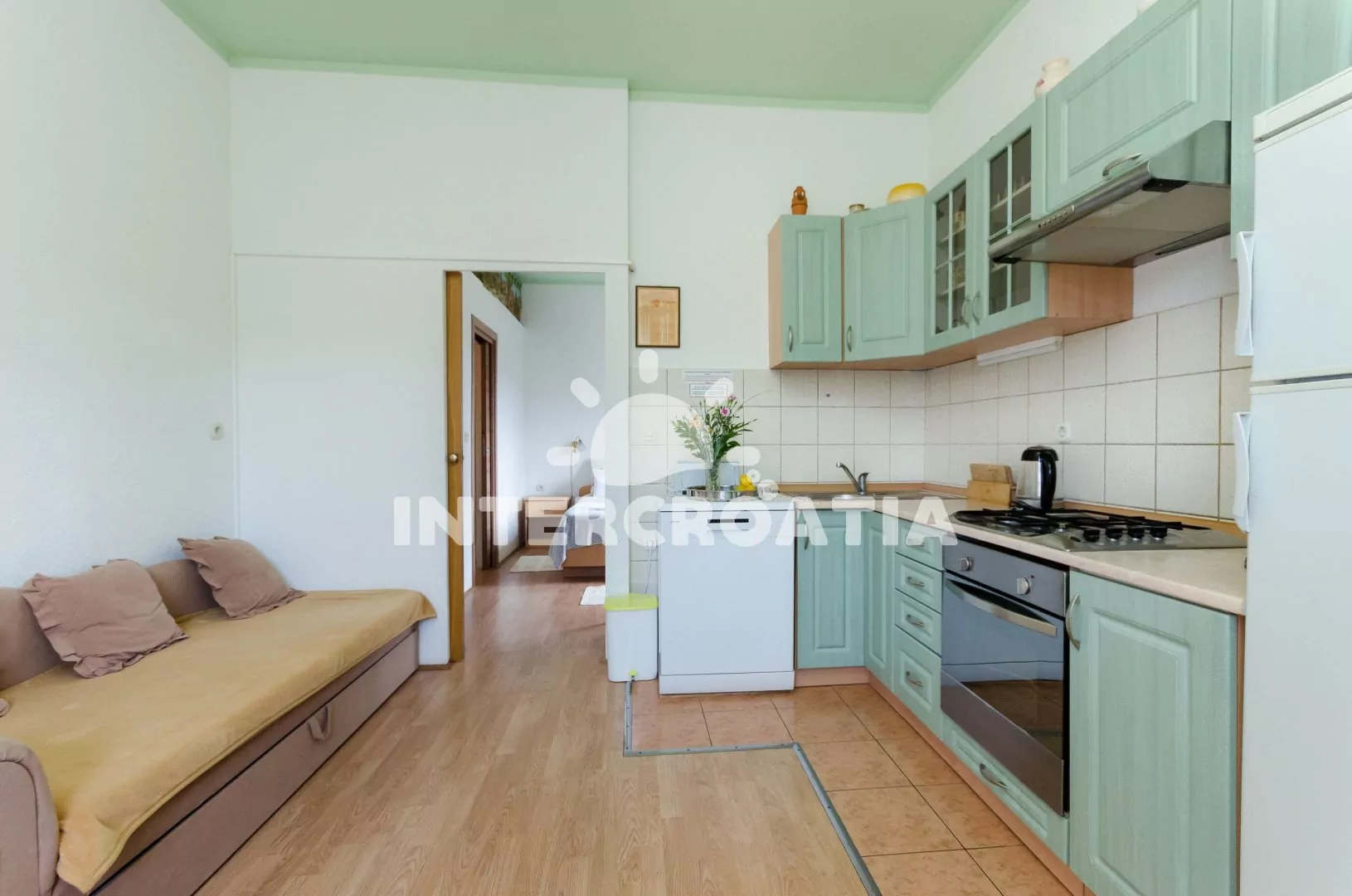 Apartmán (30 m2) s terasou a venkovním posezením se nachází v přízemí domu. Apartmán má 1 ložnici a je vhodný pro 2 osoby. Obývací pokoj je spojený s kuchyní. Kuchyňská linka je vybavena varnou…
