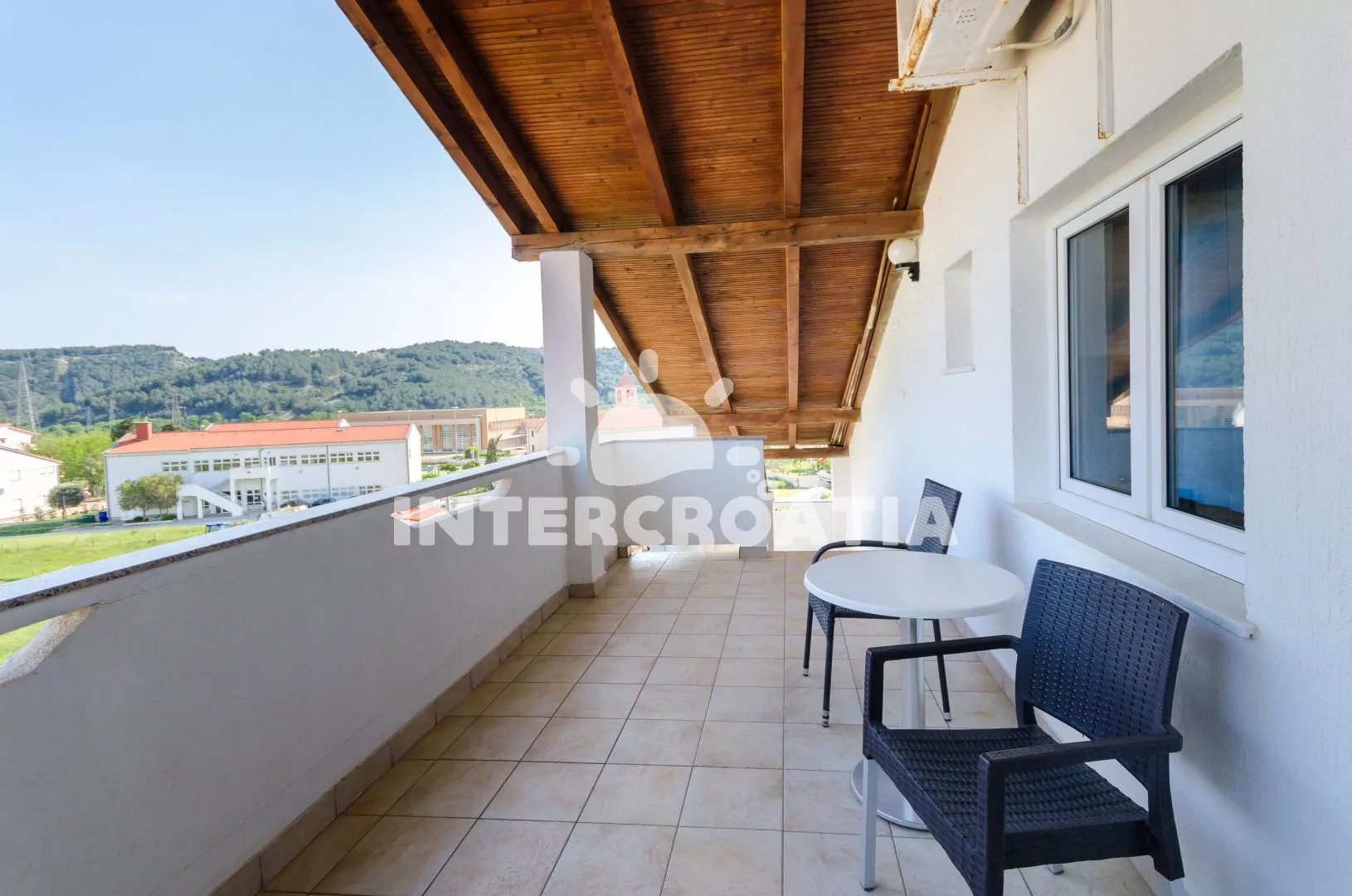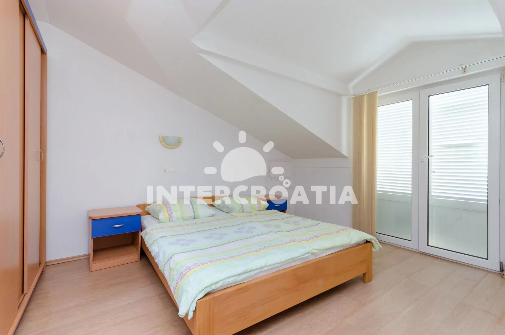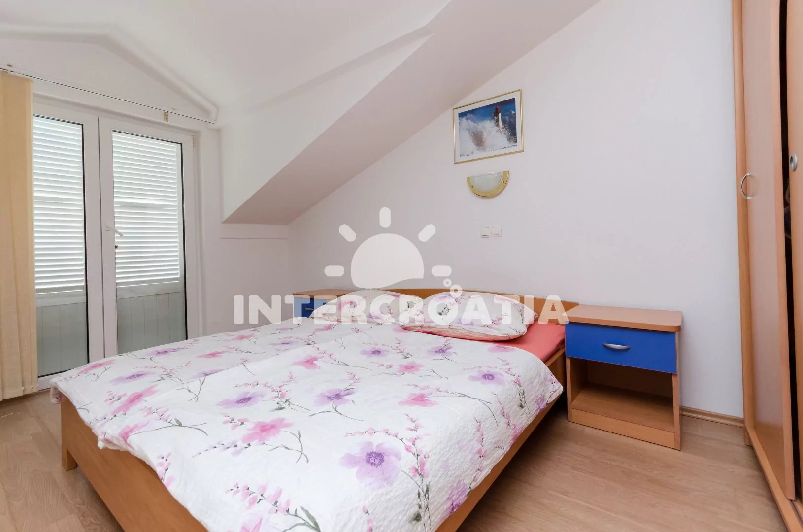 Podkrovní apartmán (55 m2) s balkonem a venkovním posezením. Apartmán má 2 ložnice a je vhodný pro 4 až 5 osob. Obývací pokoj je spojený s kuchyní. Kuchyňská linka je vybavena sporákem s troubou, digestoří, mikrovlnnou troubou, kávovarem, nádobím a lednicí s mrazákem. Obývací pokoj s jídelním stolem, pohovkou (rozložitelná na extra lůžko pro 1 osobu), televizí se satelitním programem, klimatizací a vstupem na balkon. První i druhá ložnice je vybavena vždy s jedním dvoulůžkem a vstupem na balkon. Koupelna se sprchovým koutem, umyvadlem, pračkou a wc. Hostům je k dispozici parkování u objektu zdarma.