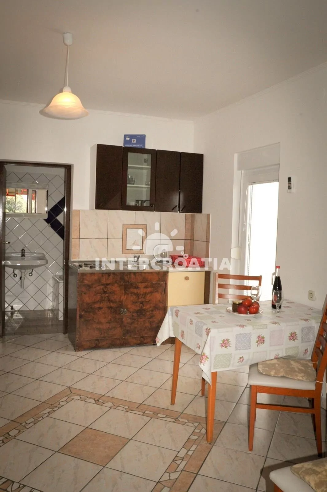 Apartmán (35 m2) s krytou terasou a venkovním posezením se nachází ve zvýšeném přízemí. Apartmán má 1 ložnici a je vhodný pro 2 osoby. Obývací pokoj je spojený s kuchyní. Kuchyňská linka je vybavena dvouplotýnkovým vařičem, mikrovlnnou troubou, rychlovarnou konvicí, kávovarem, nádobím a lednicí s mrazákem. Obývací pokoj s jídelním stolem, pohovkou, televizí se satelitním programem a klimatizací. Ložnice s dvoulůžkem a vstupem na terasu. Koupelna s vanou, umyvadlem a wc. Hostům je k dispozici parkování u objektu zdarma.