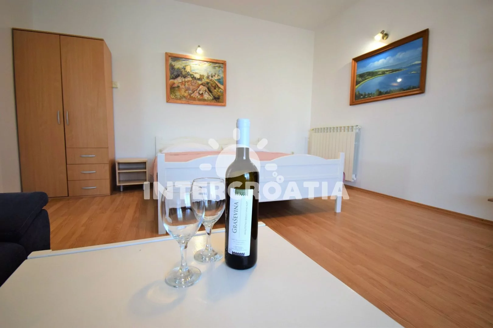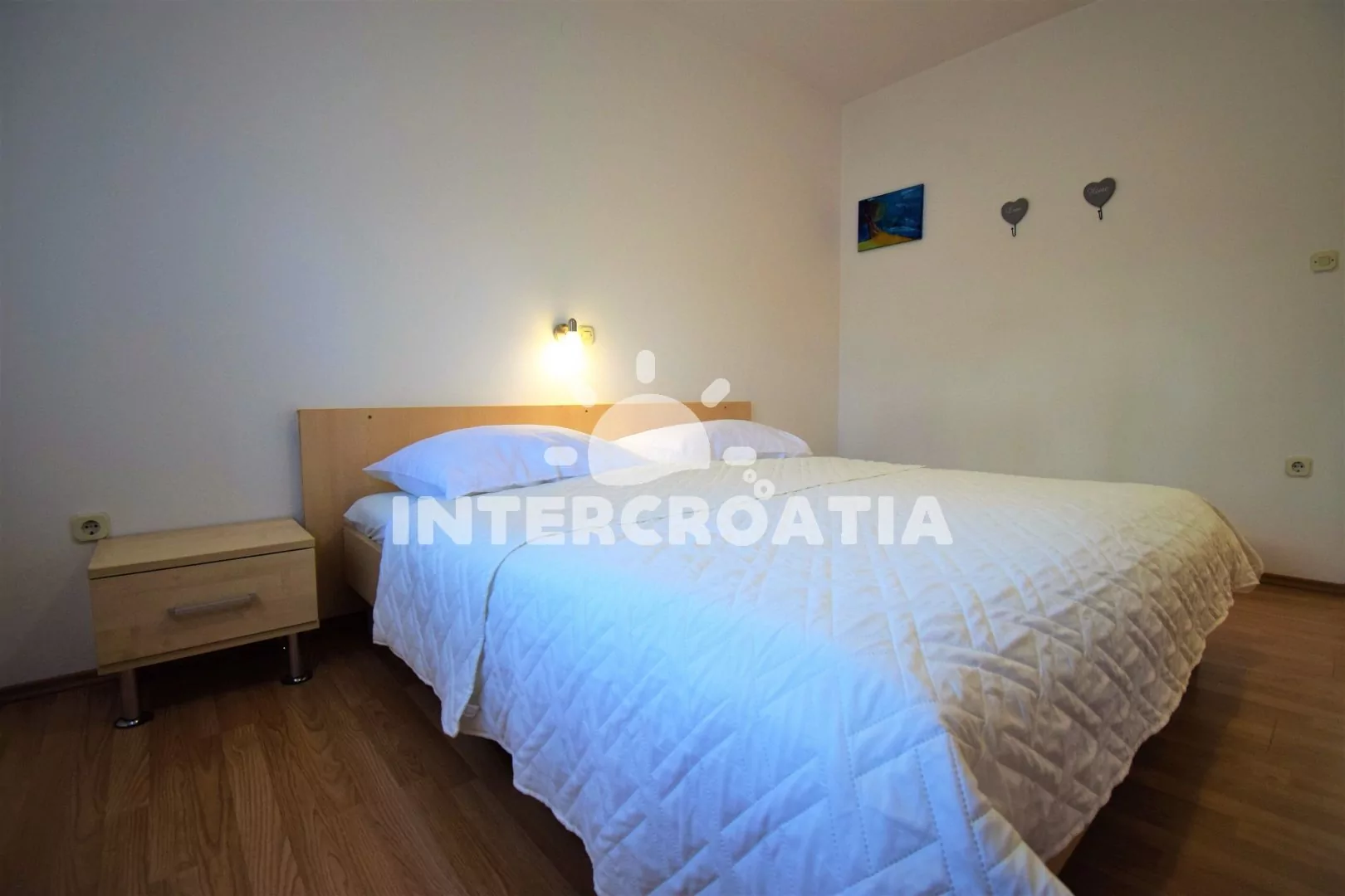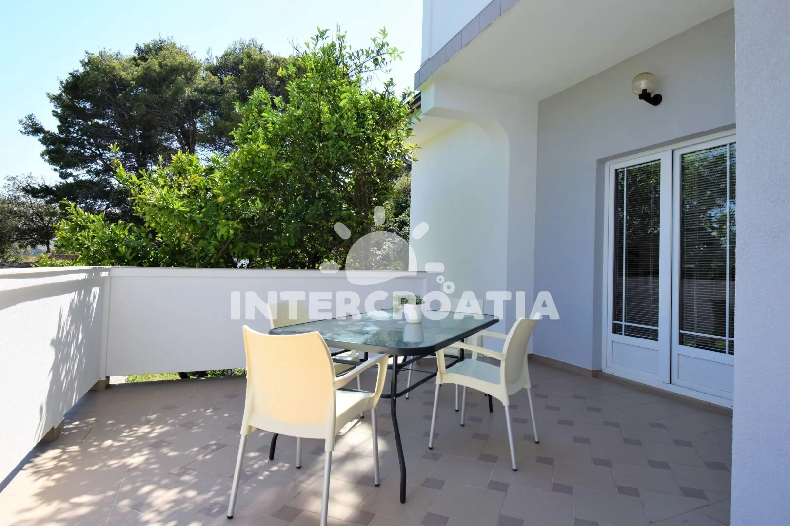 Apartmán (80 m2) s terasou, venkovním posezením a částečným výhledem na moře se nachází v přízemí domu. Apartmán je vhodný pro 2 až 5 osob. Obývací pokoj je spojený s kuchyní. Kuchyňská linka je vybavena varnou deskou, digestoří, vestavěnou troubou, myčkou na nádobí, mikrovlnnou troubou, rychlovarnou konvicí, kávovarem, nádobím a lednicí s mrazákem. Obývací pokoj s jídelním stolem, dvěma přistýlkami, televizí se satelitním programem, klimatizací a vstupem na balkon. Ložnice s jedním dvoulůžkem a přistýlkou. Koupelna s vanou, umyvadlem, fénem a wc. Hostům je k dispozici parkování u objektu zdarma.